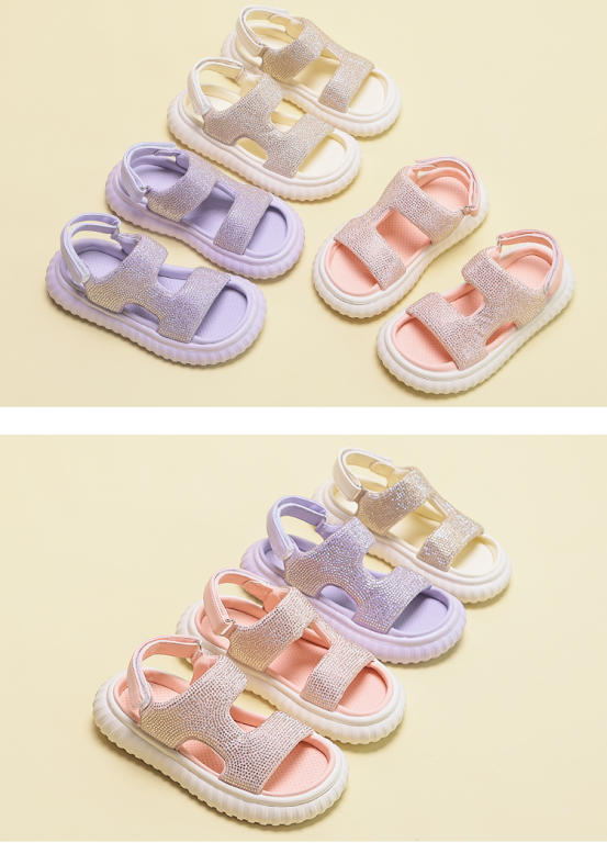 鞋型流畅精美 鞋子轻盈无压力 软软的防滑大底,耐磨玩水不担心 满钻瓷实不易掉 颜值永远在线!