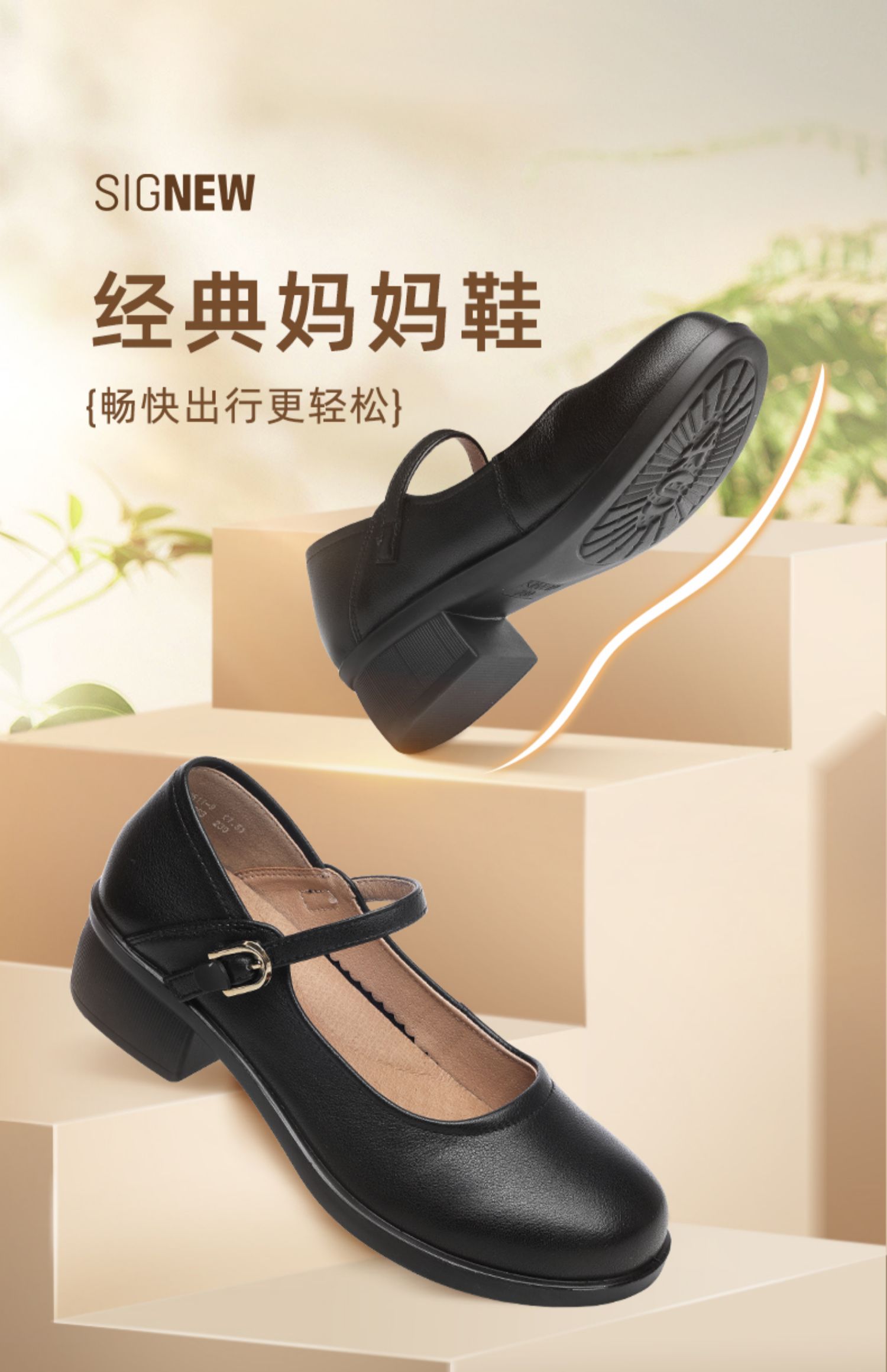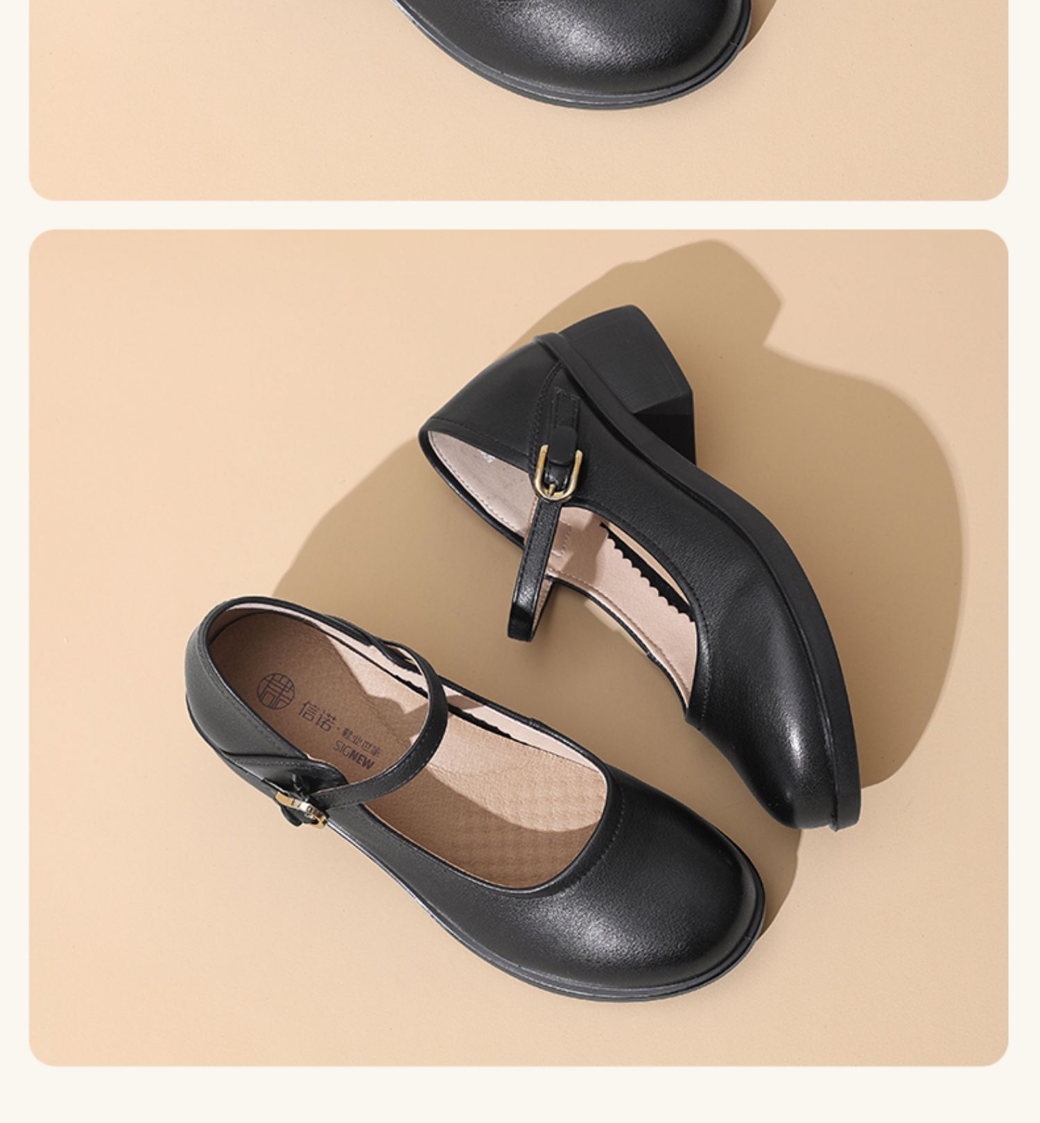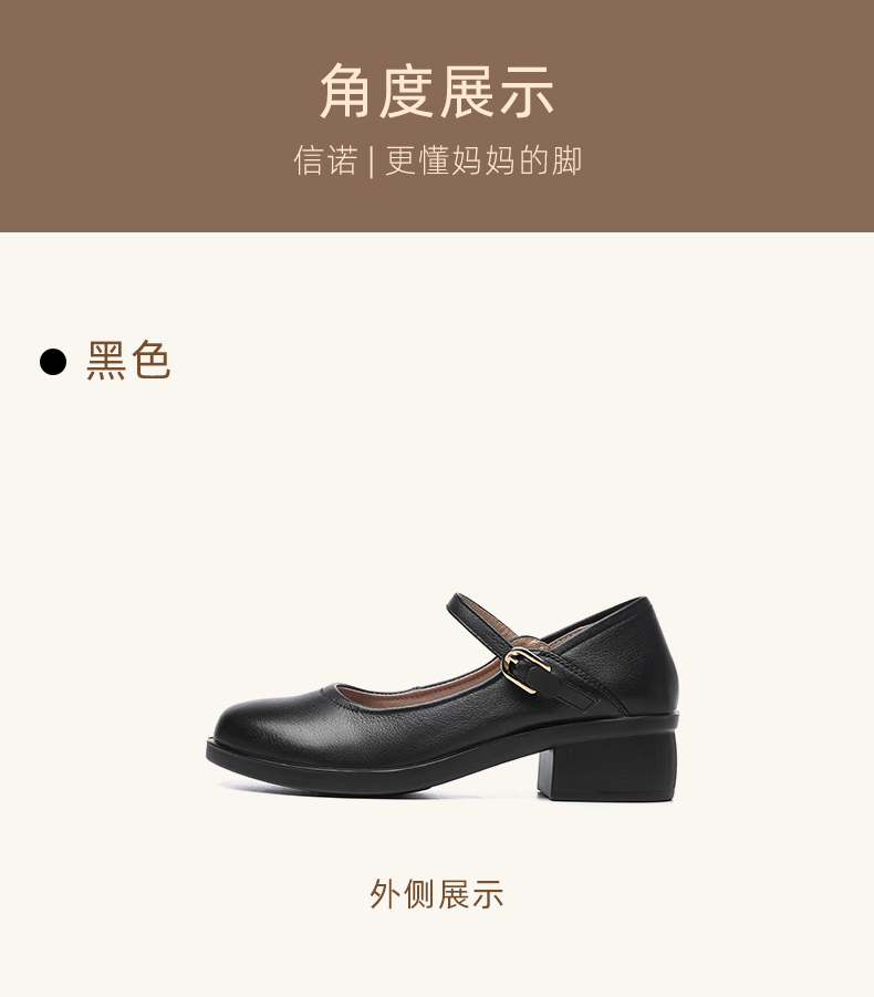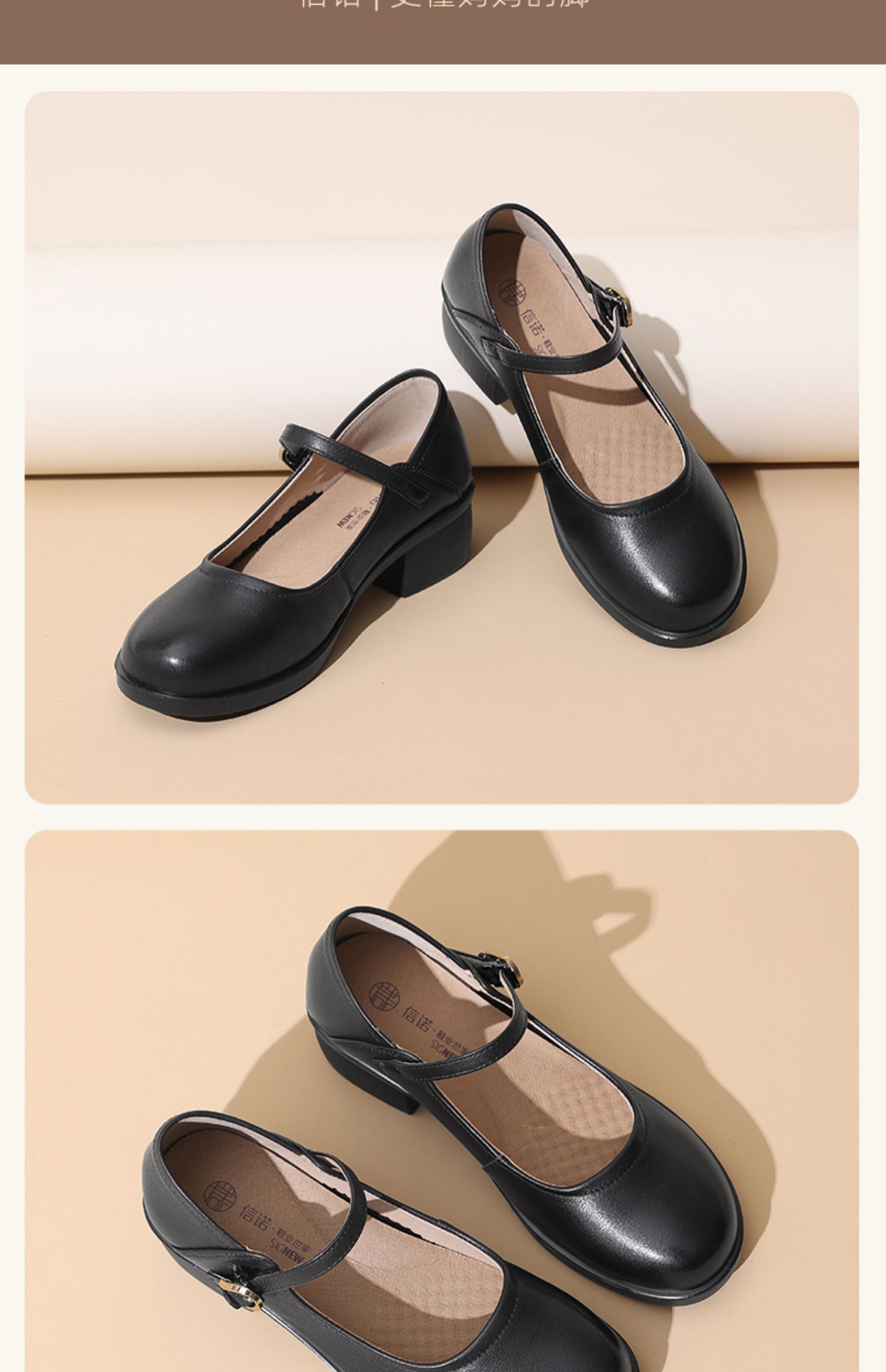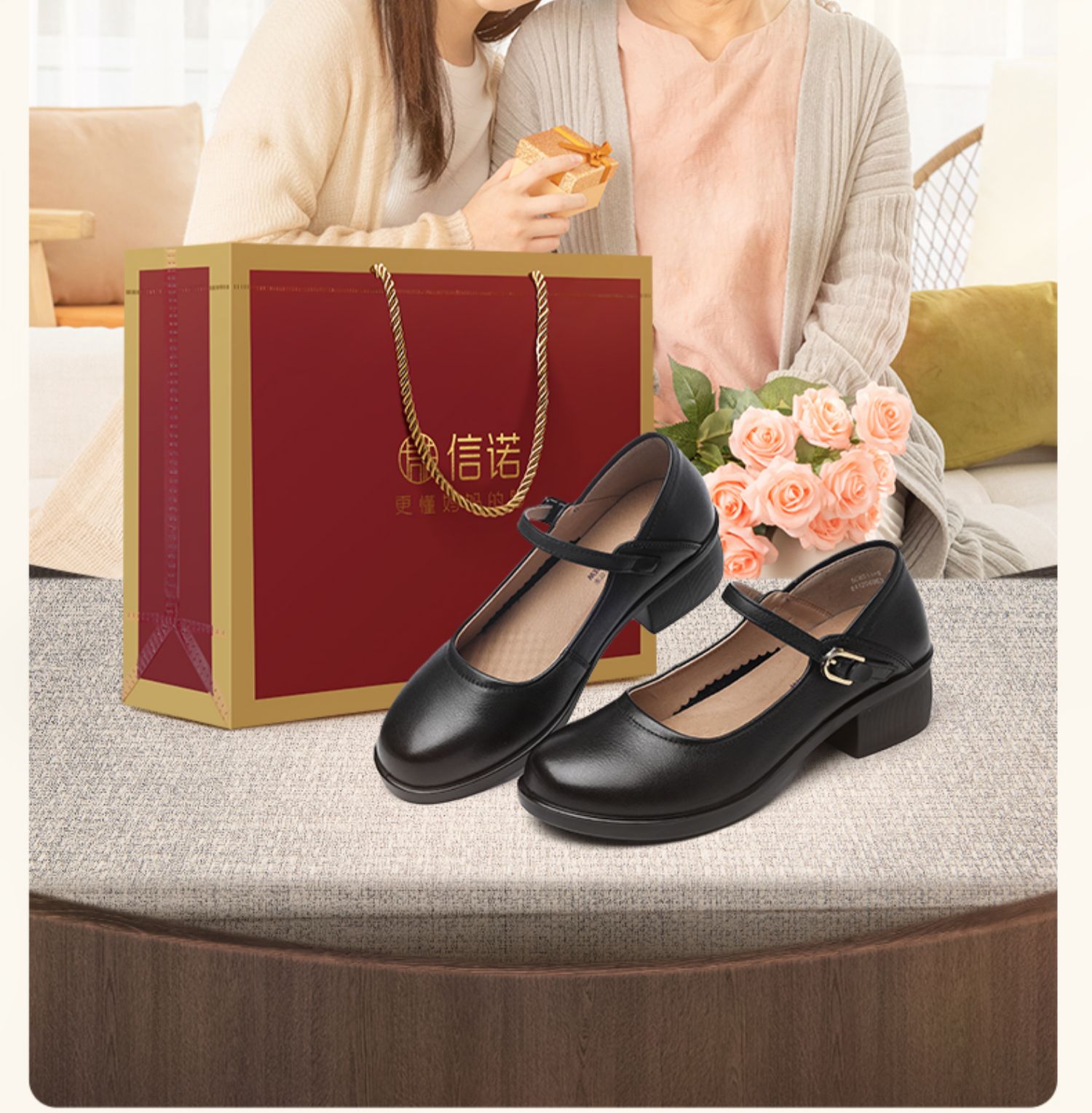 信诺真皮女士玛丽珍鞋一字带单鞋2025春季新款舒适软底粗跟妈妈鞋5C6511-9