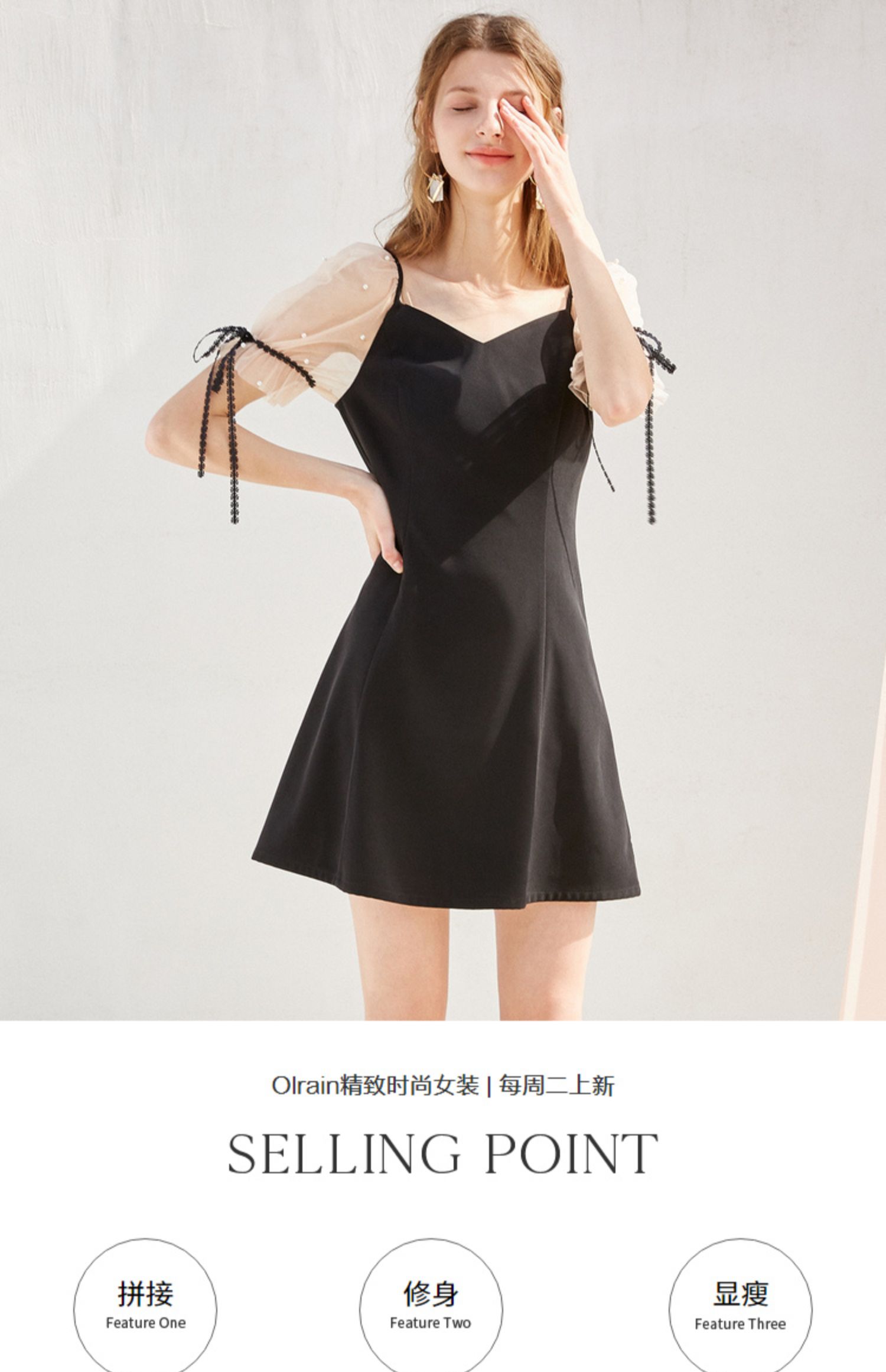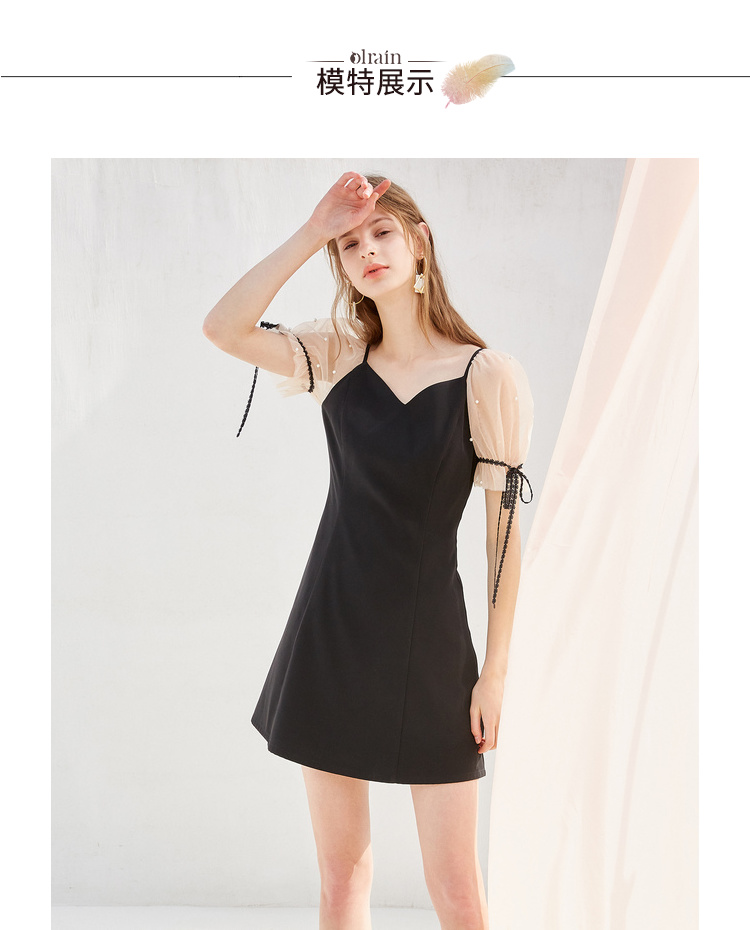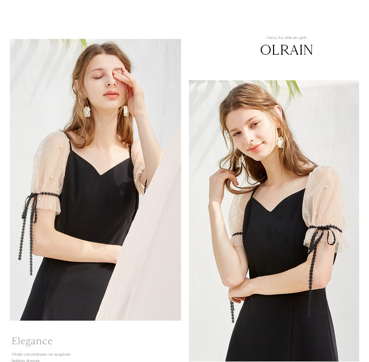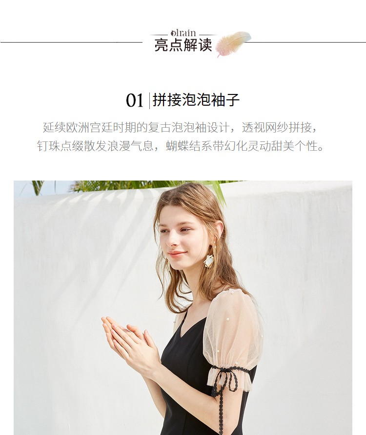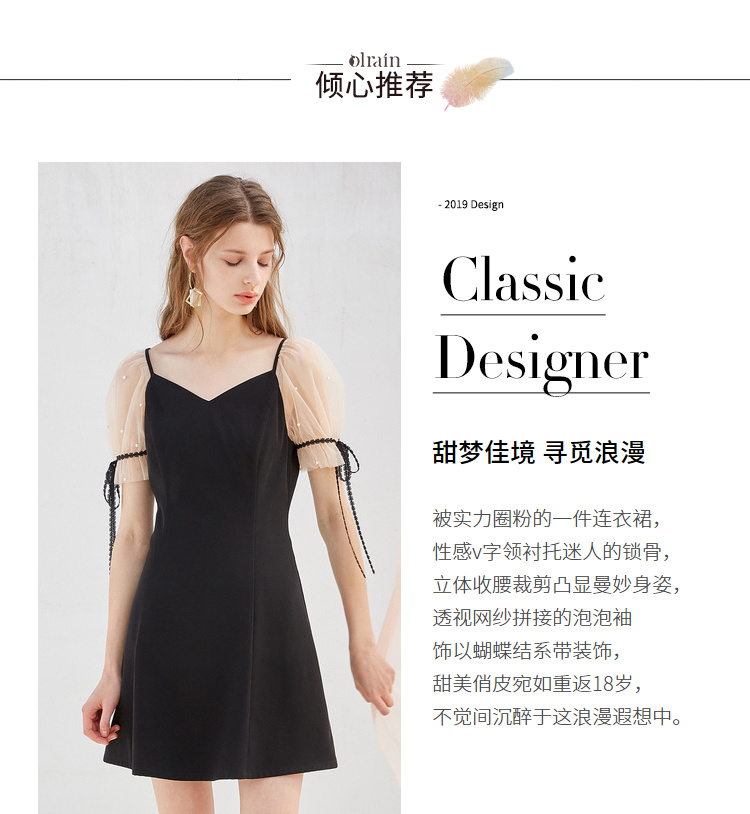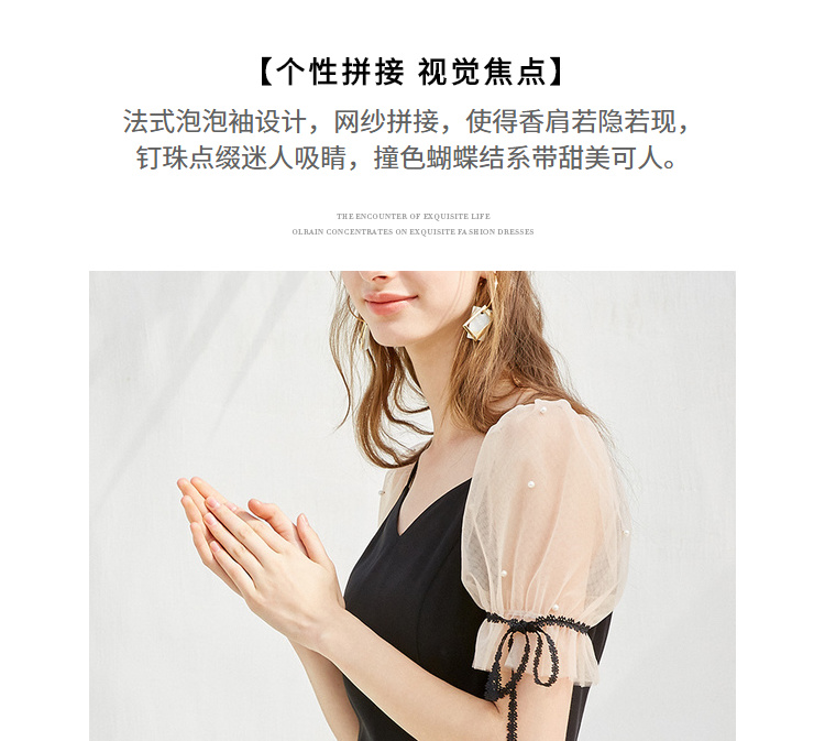 V领短袖黑色连衣裙女欧芮儿2019夏装新修身显瘦复古中长款A字裙