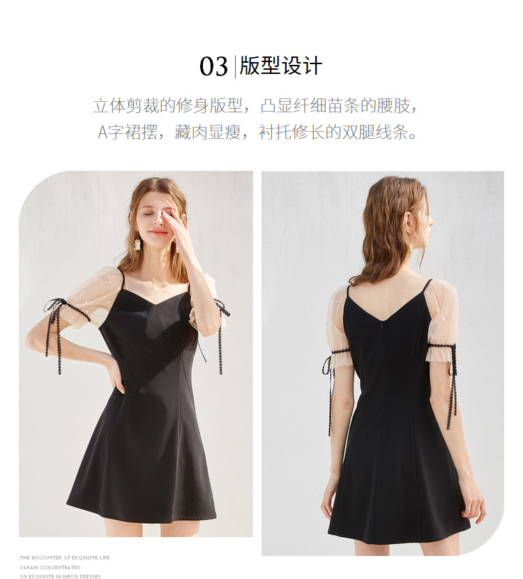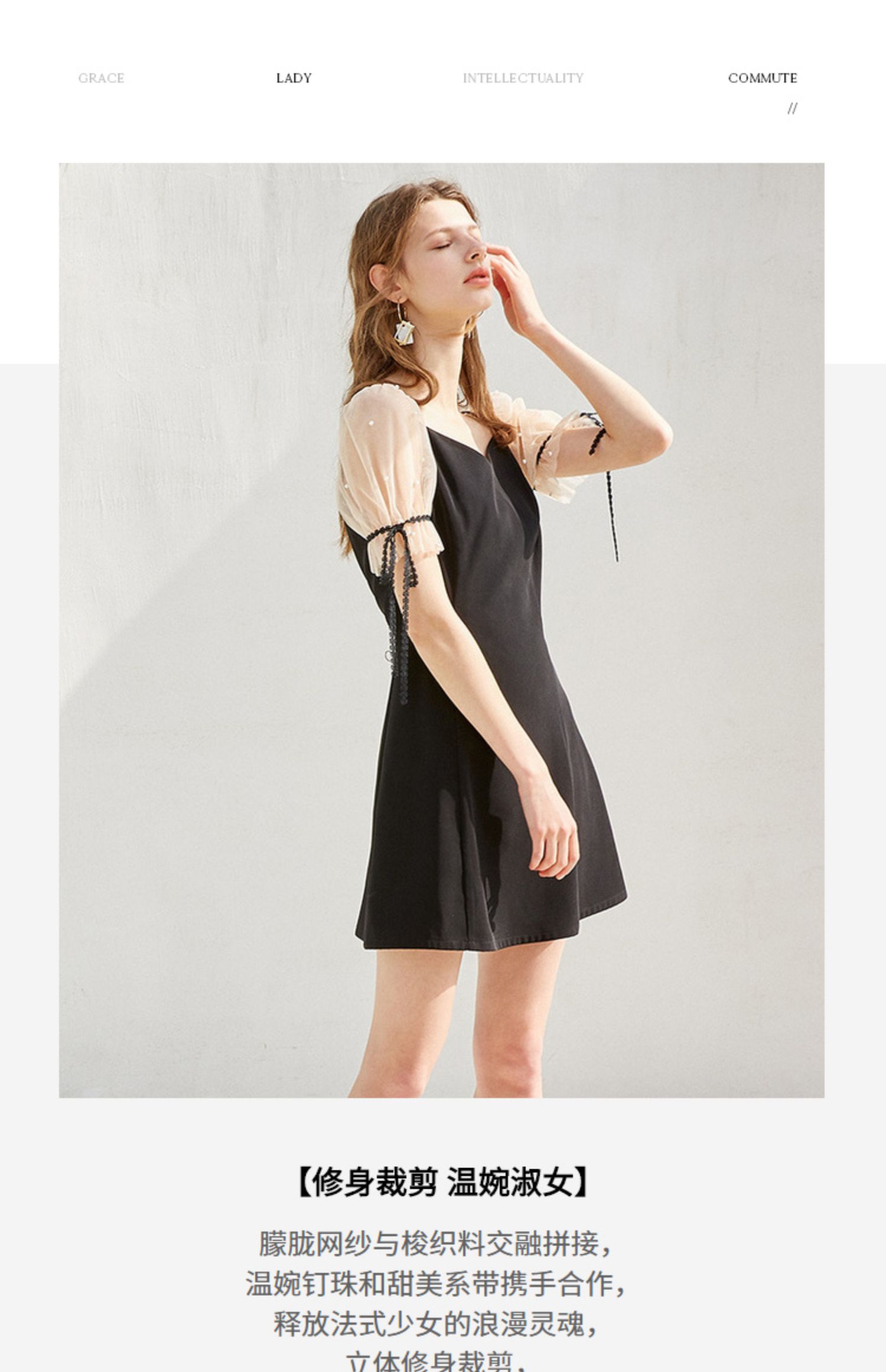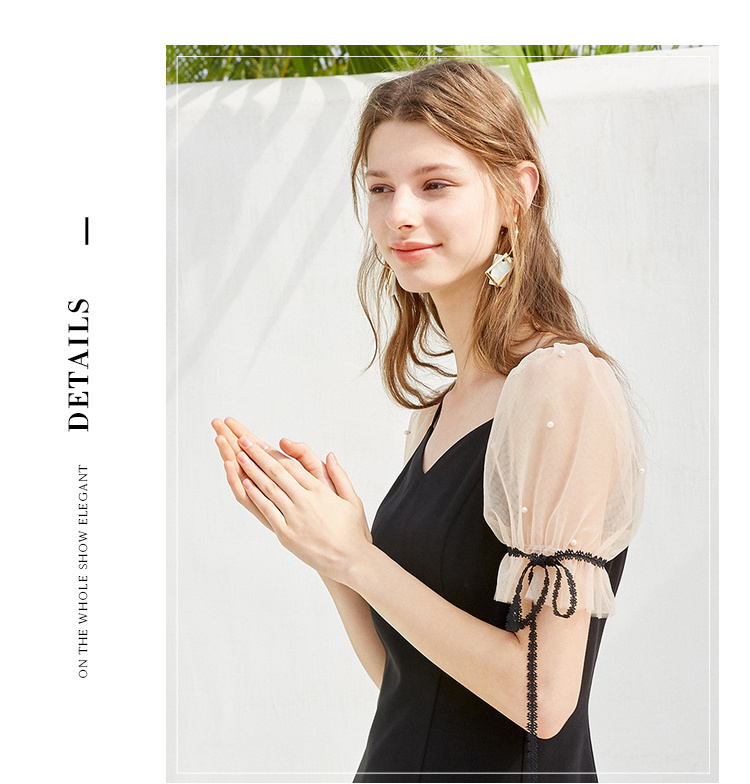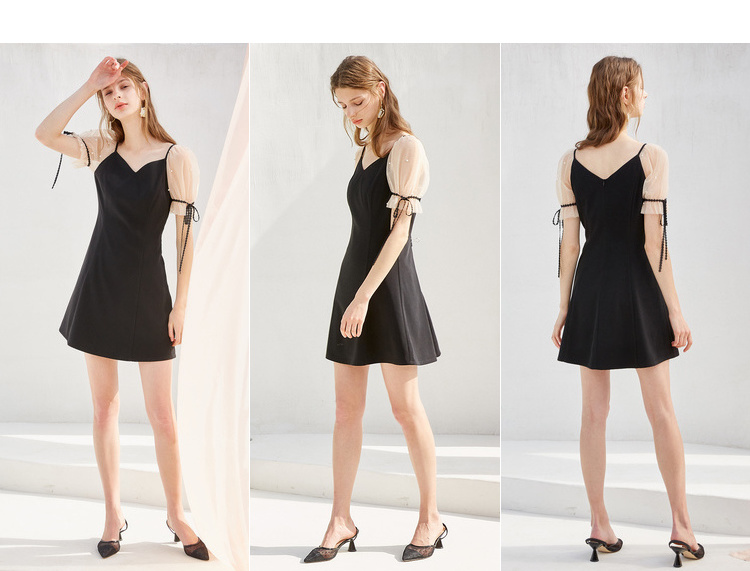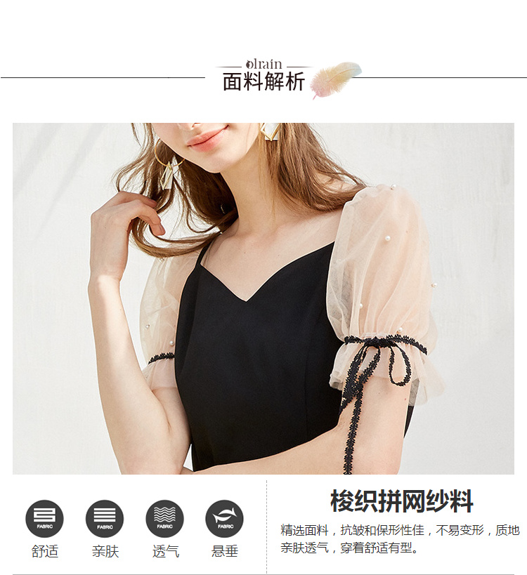 V领短袖黑色连衣裙女欧芮儿2019夏装新修身显瘦复古中长款A字裙