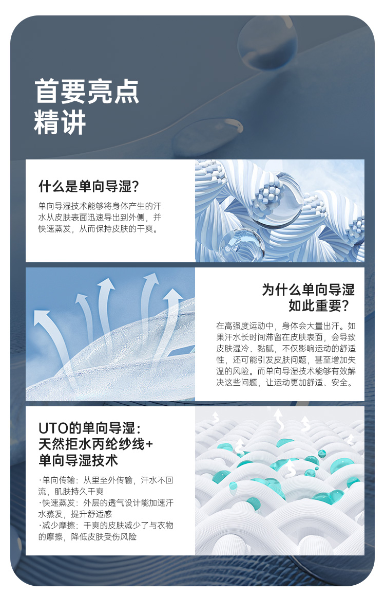 UTO悠途潜心于贴身运动装备的研发、设计和生产。从纤维到组织,从设计到工艺,在无缝贴身运动装备领域,树立国内标杆。 UTO着力于品牌互联网化,不断采集大量运动数据,为跑步、健身、滑雪等不同类型的运动爱