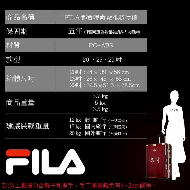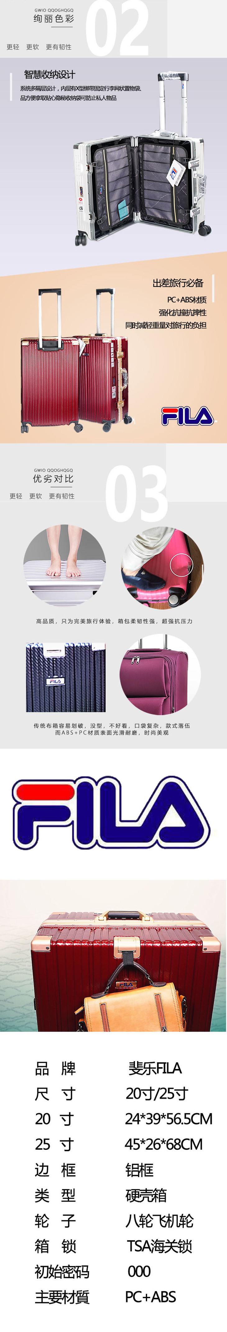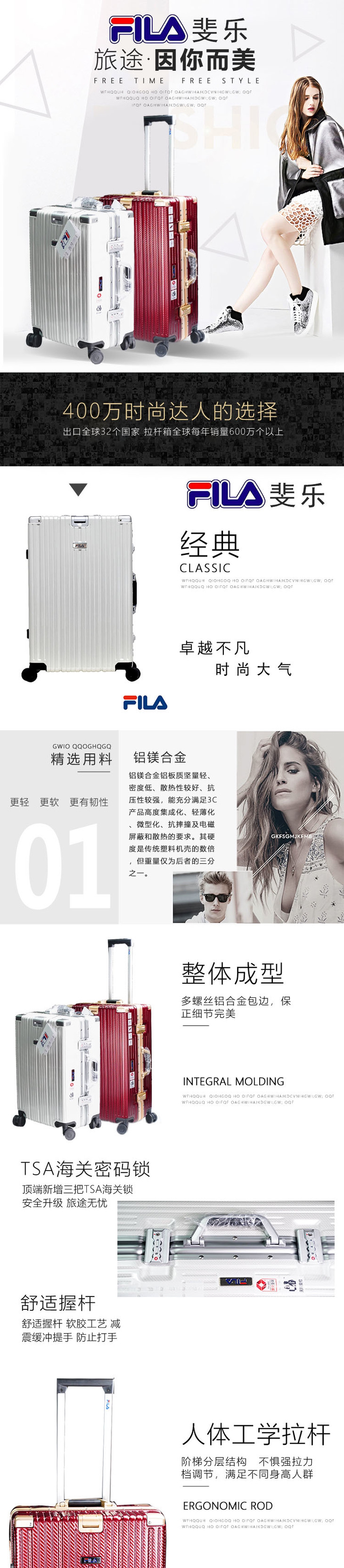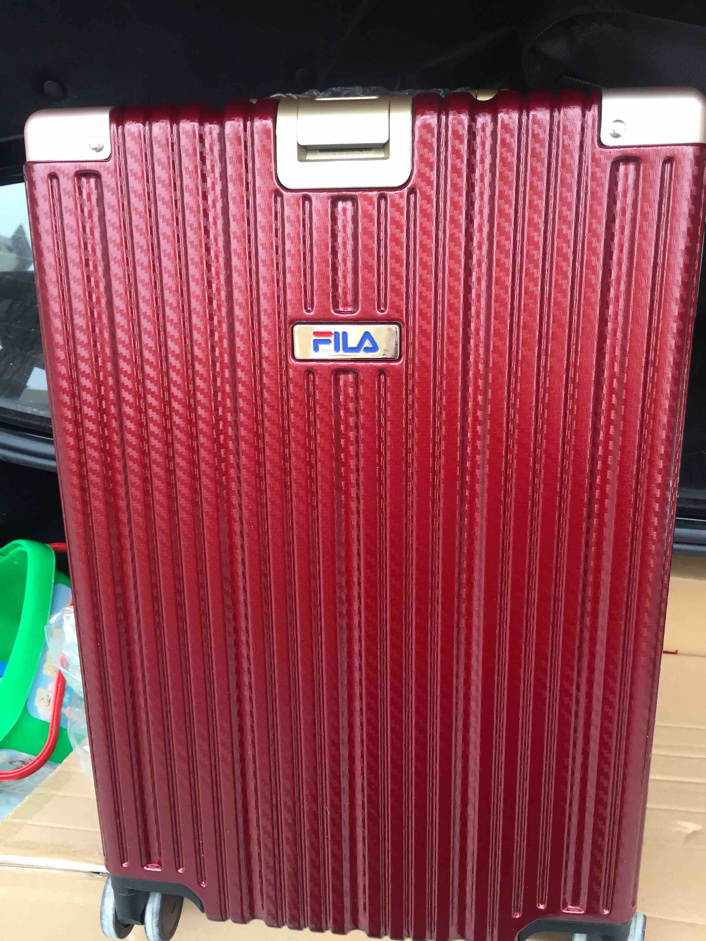 说明:正品保真,现在非常红非常流行的品牌FILA。非常霸气的箱子,配置也很高,铝框,万向轮,20寸和25寸。白色,黑色,红色