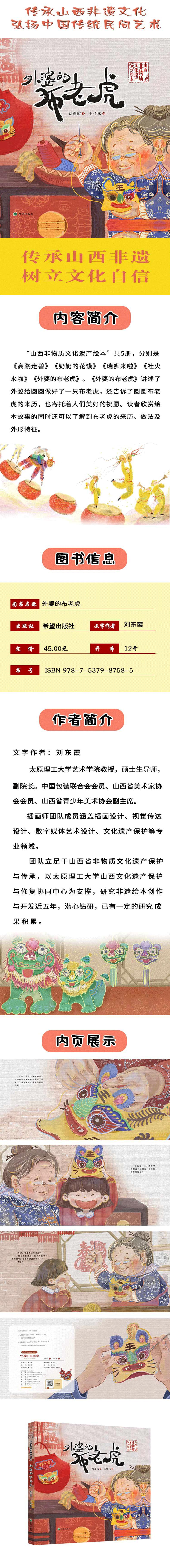 山西非遗系列绘本以山西非物质文化遗产中的“民间社火”、“高跷”、“黎侯虎”、“芮城摇头狮”等为创作主题,选择以绘本为载体的非遗传承新途径,对于丰富中国绘本题材、弘扬山西地域传统文化有重要意义。全套为5册,计划2022年出版,分别为《社火来啦》《高跷走兽》《瑞狮来啦》《外婆的布老虎》《奶奶的花馍》。《外婆的布老虎》讲述了外婆给圆圆做好了一只布老虎,还告诉了圆圆布老虎的来历,也寄托着人们美好的祝愿。读者欣赏绘本故事的同时还可以了解到布老虎的来历、做法及外形特征。