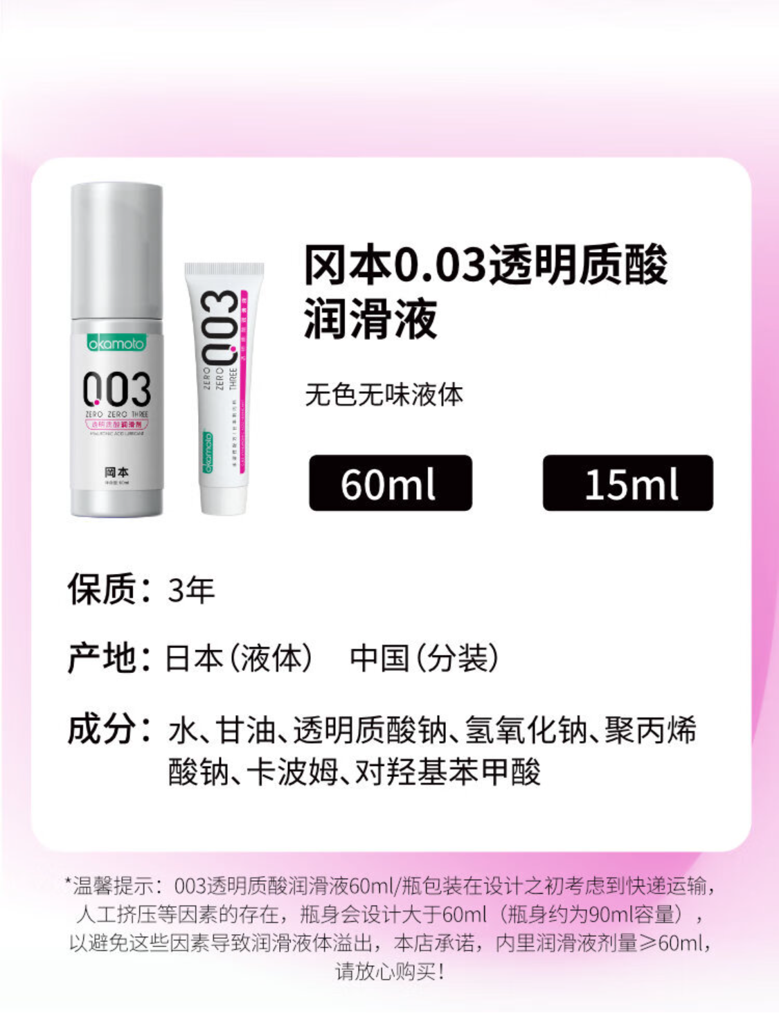 冈本 003 人体润滑剂60ml 水溶性润滑液 免洗润滑油 夫妻成人 男女用 情趣用品成人用品