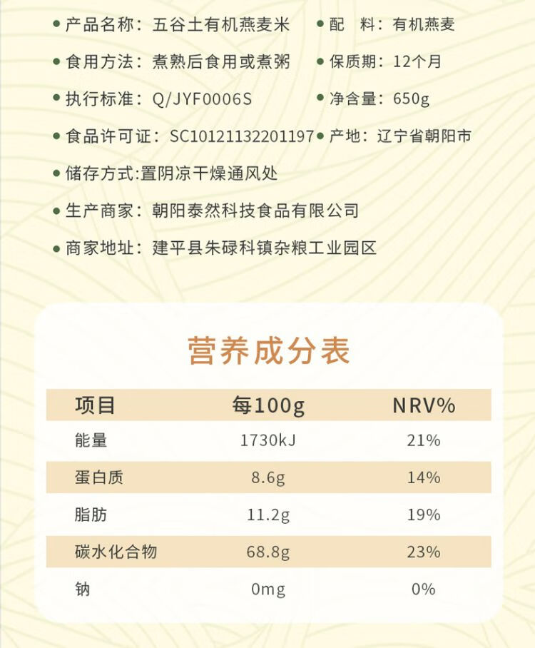 五谷土有机燕麦米650g/罐