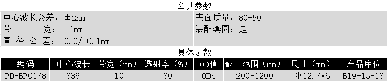BP836/10K OD4@200-1200 T>80% Φ12.7*6 带通滤光片 (带套圈)