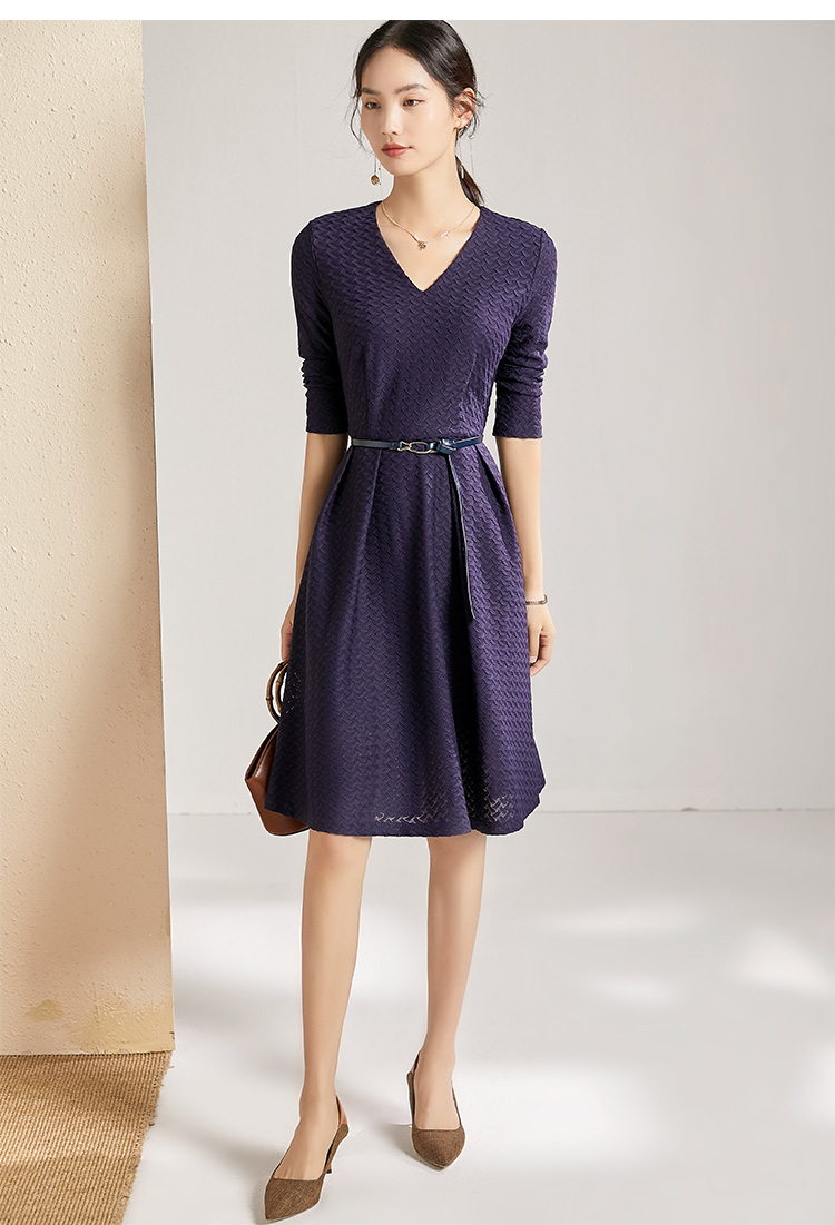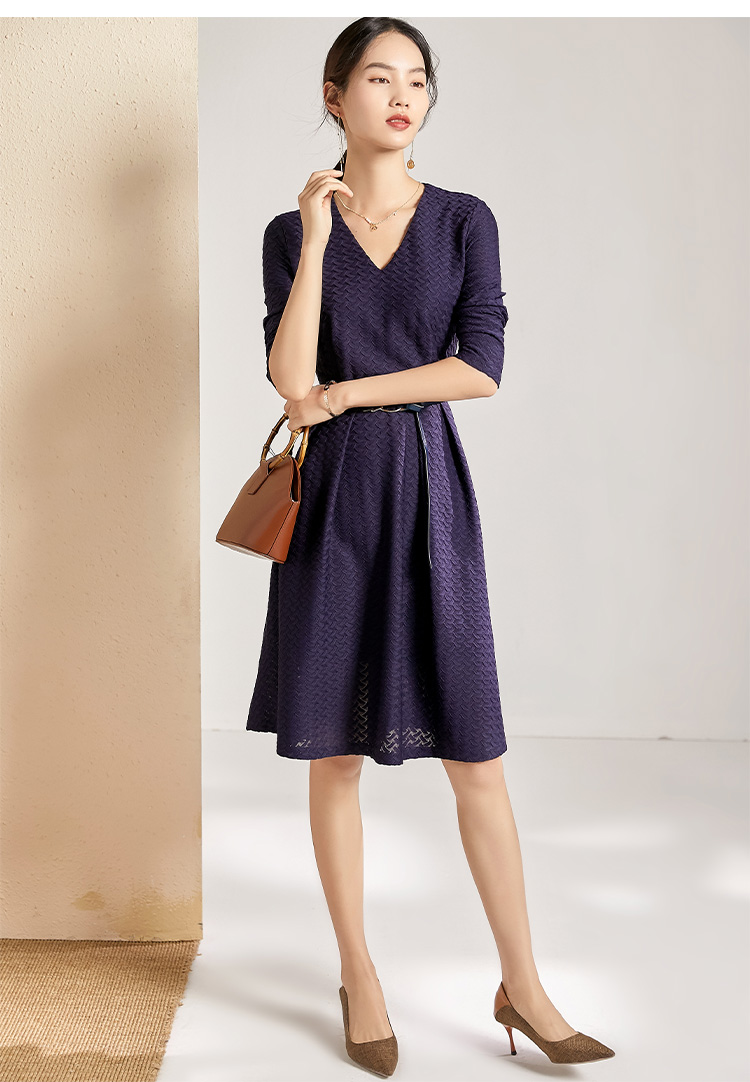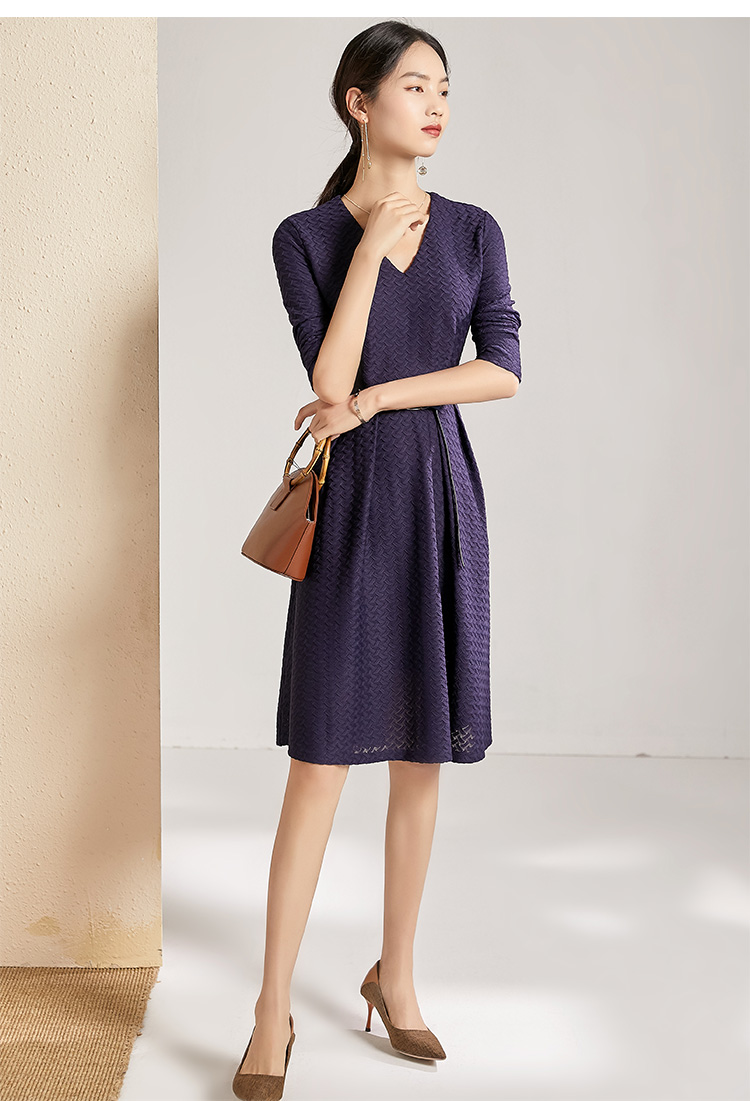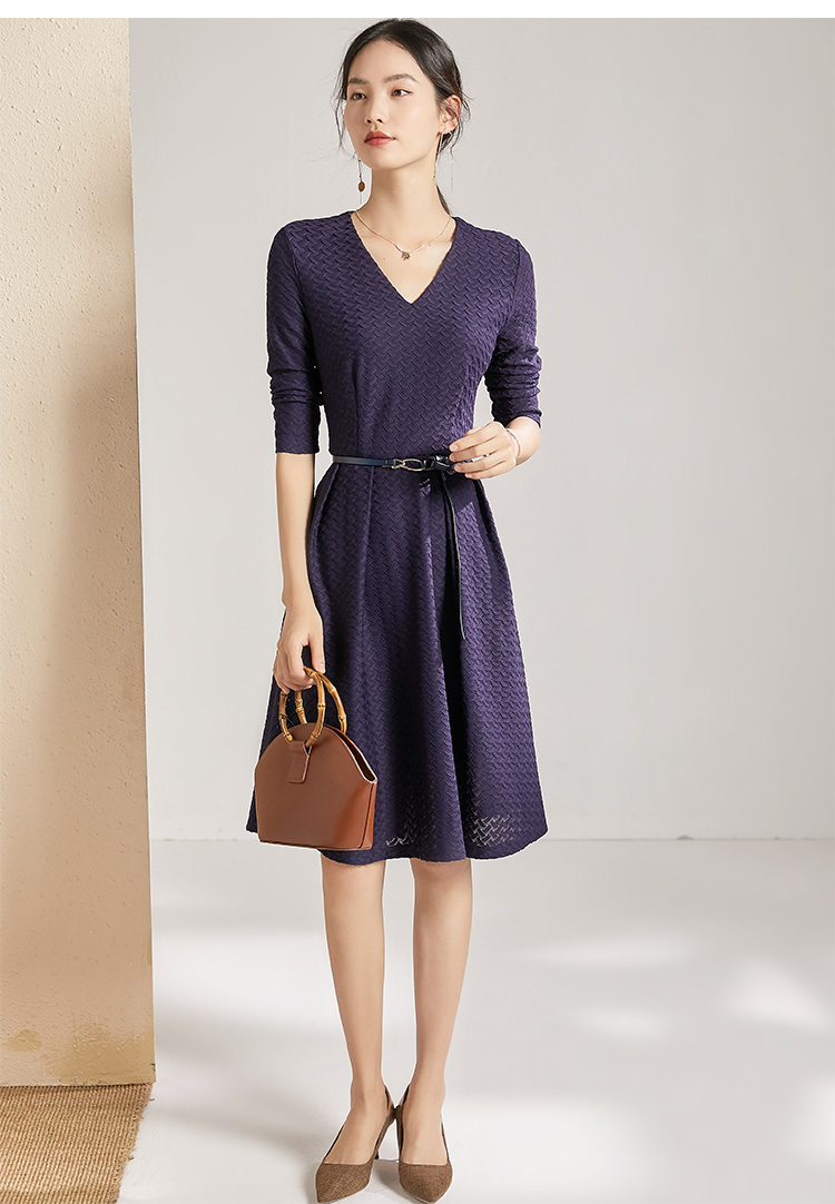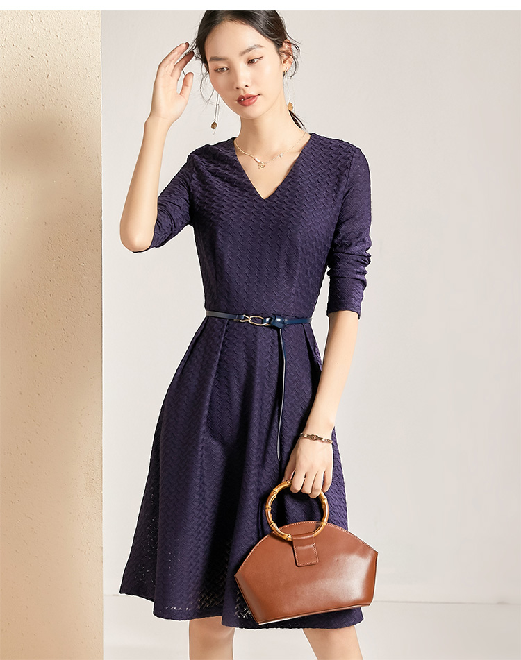 剩S 【透气梭织裙子】新款秋季透气梭织花纹V领长袖连衣裙