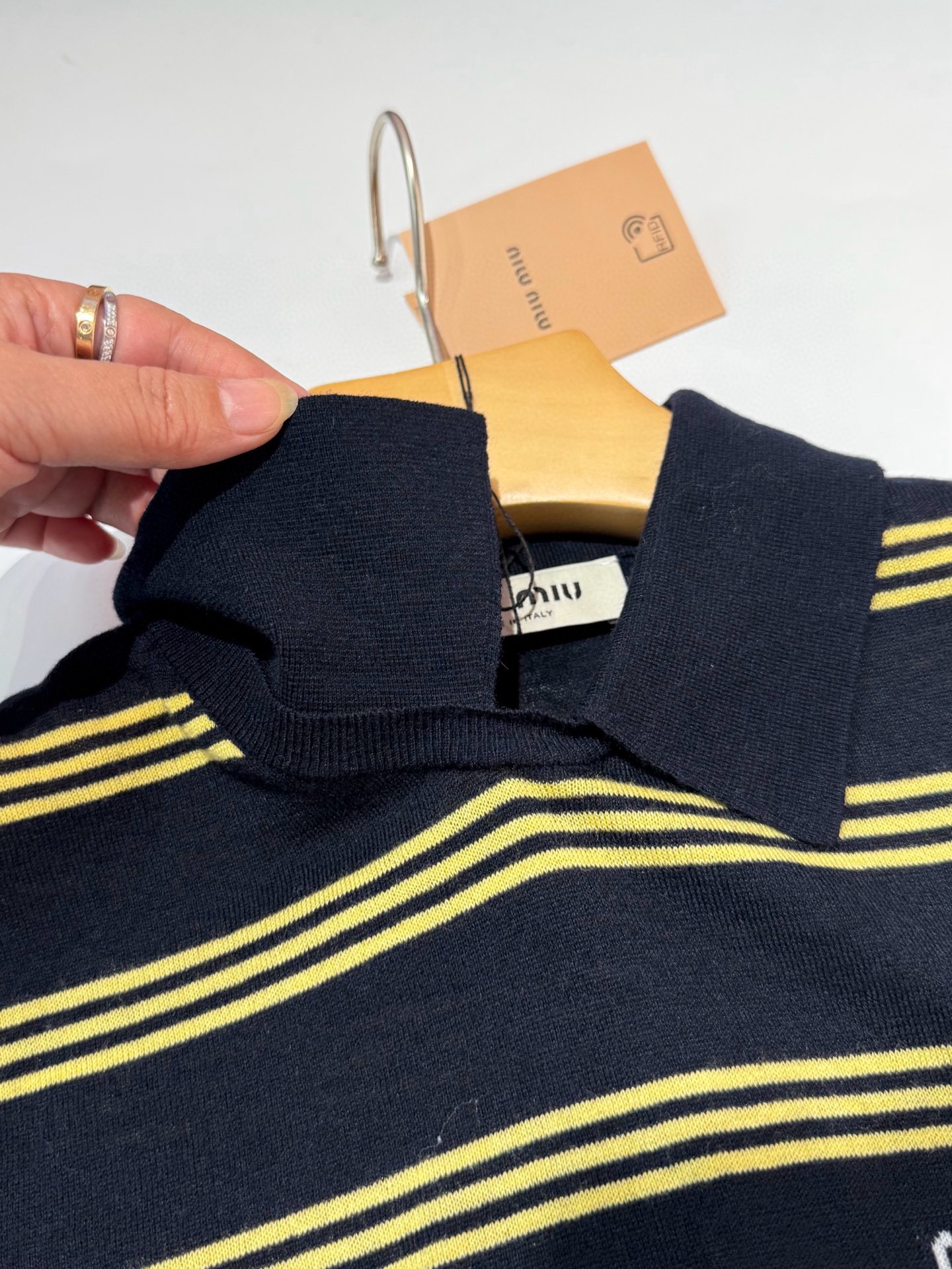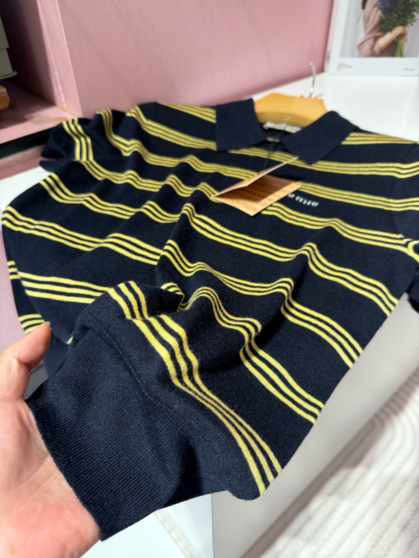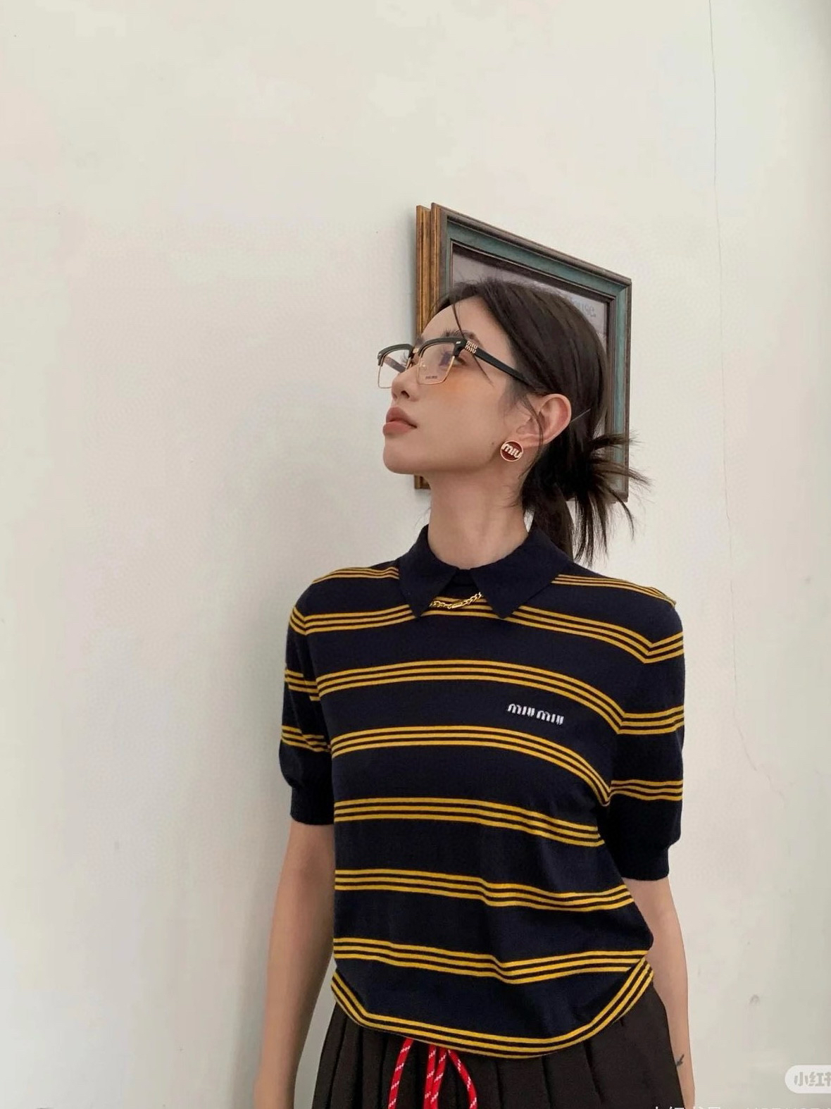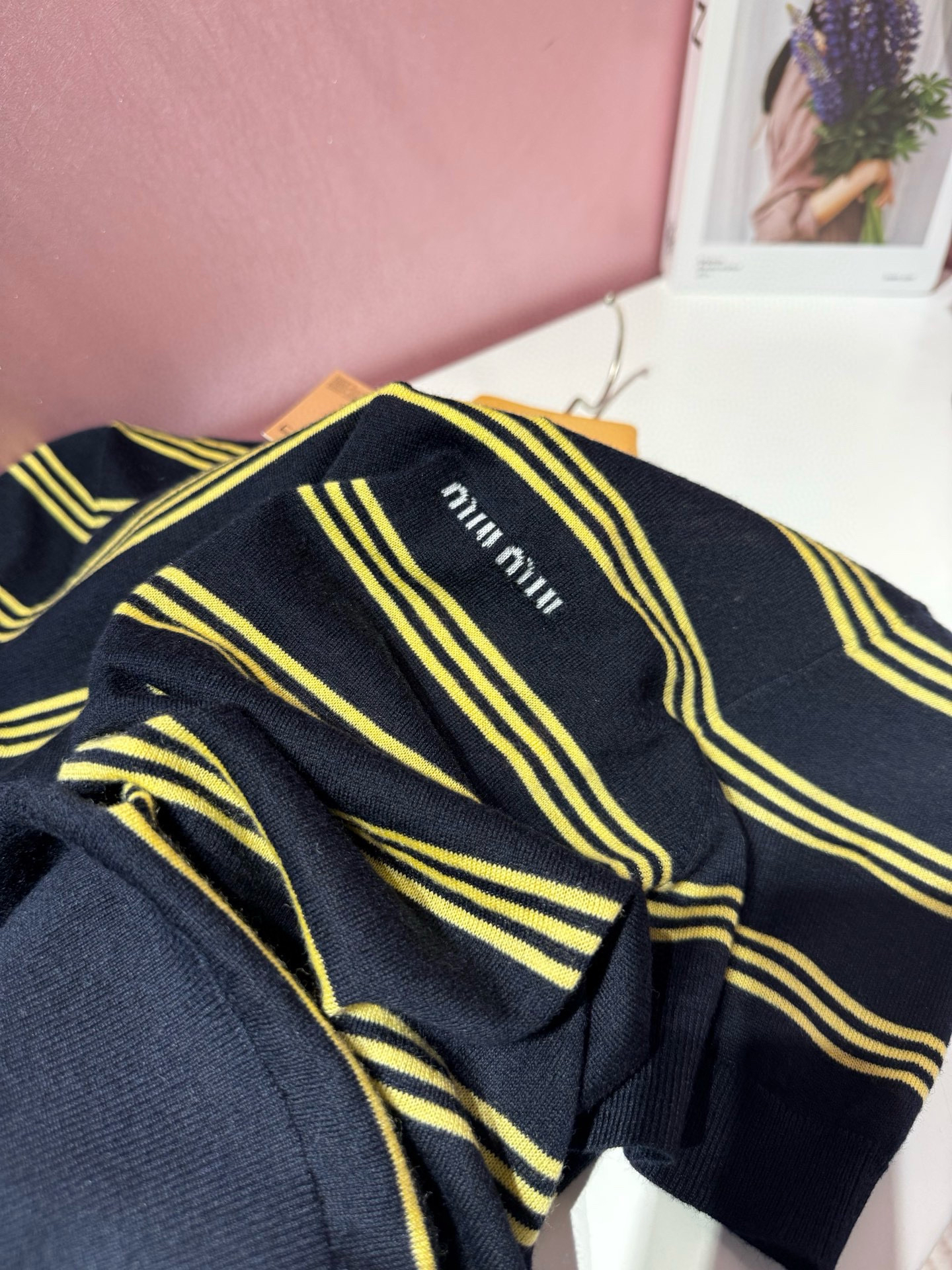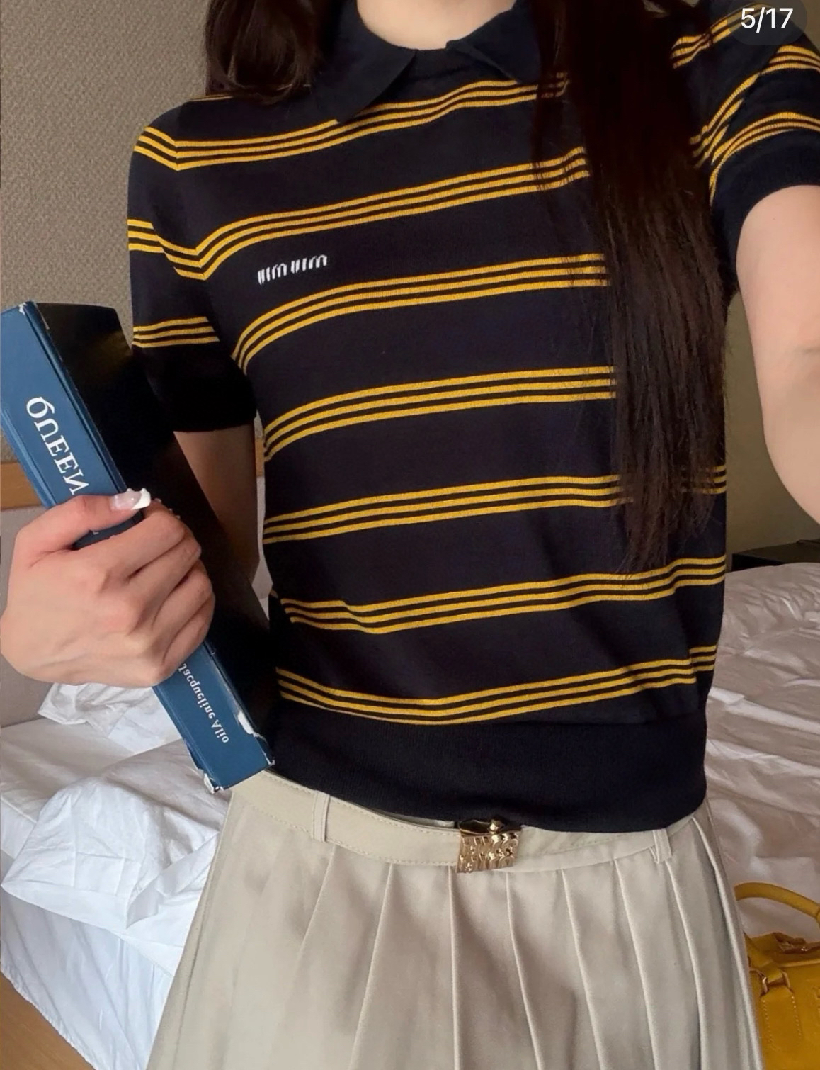谁能拒绝MIU风魅力啊!复古与俏皮皆备,藏蓝色和亮黄相间的条纹配色,活泼又亮眼,上身秒变时髦精,不管搭配百褶裙打造甜酷学院风,还是配休闲裤应在随性氛围感,都毫无压力~
