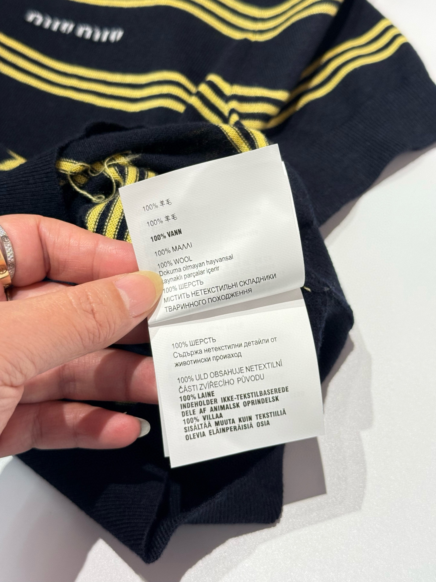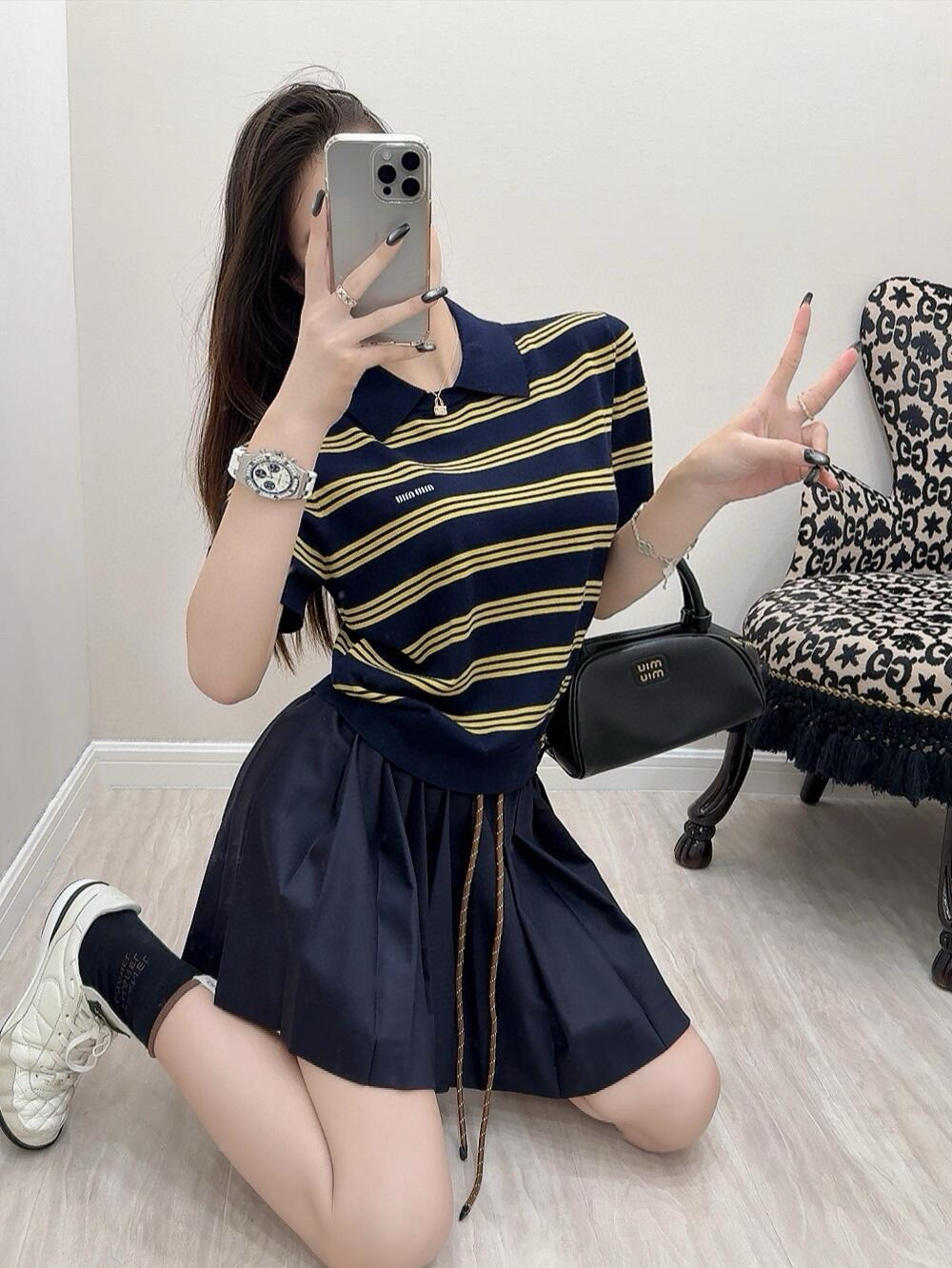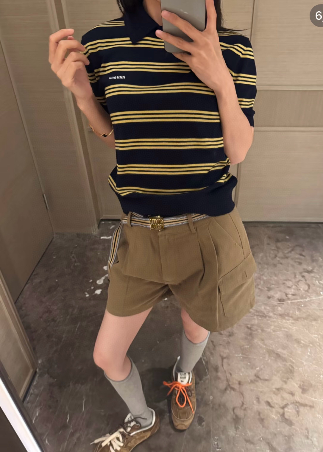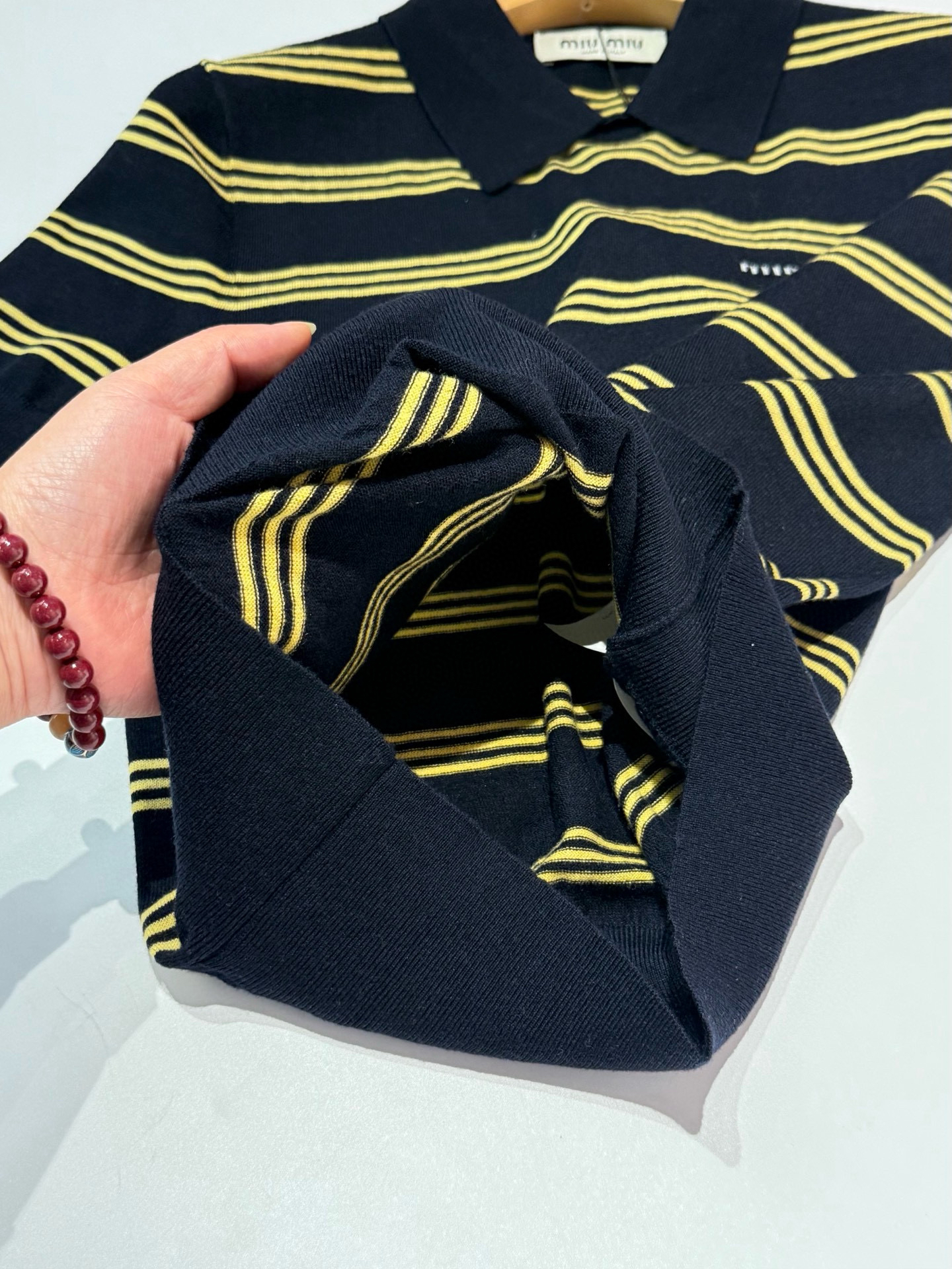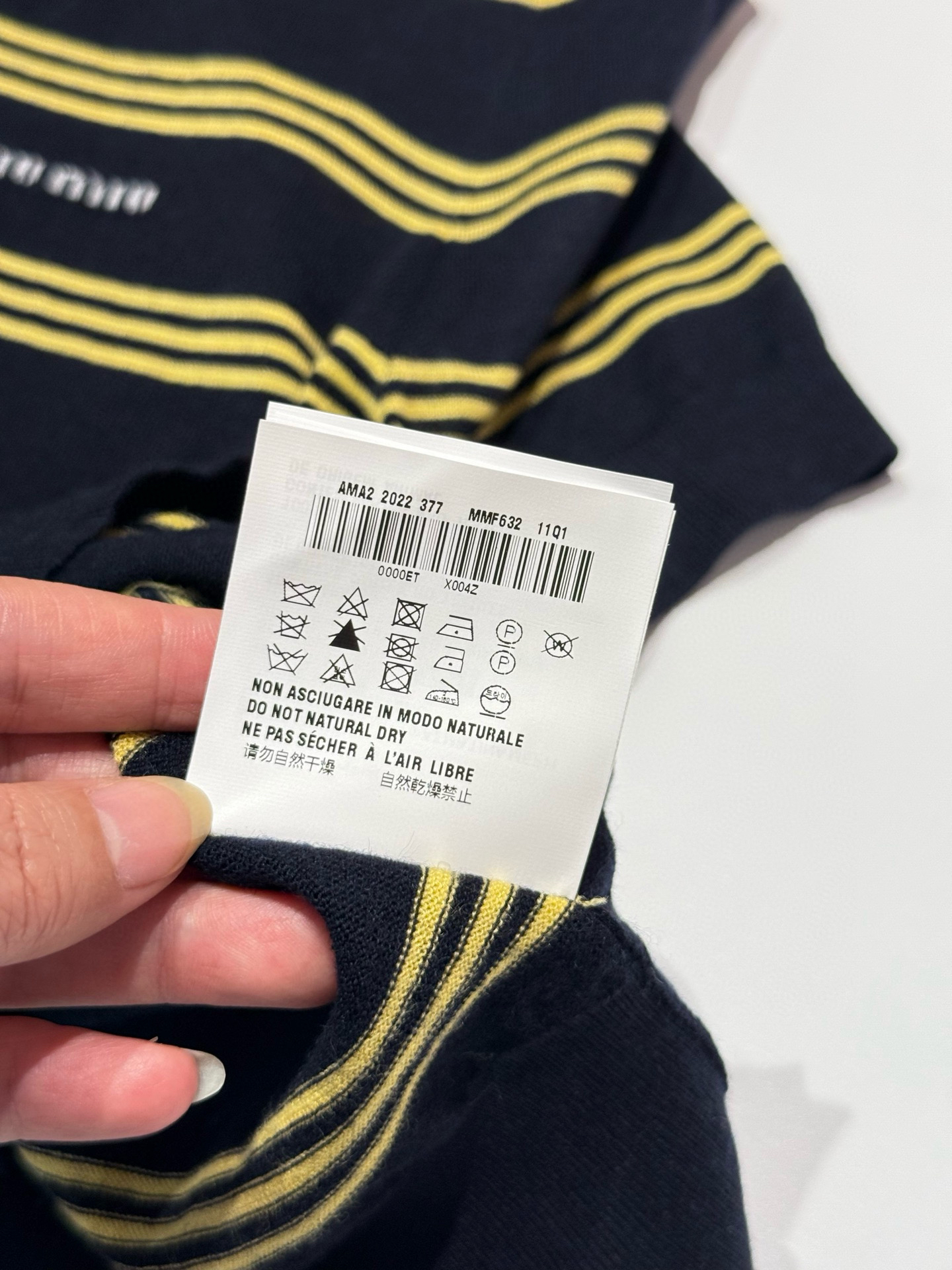 谁能拒绝MIU风魅力啊!复古与俏皮皆备,藏蓝色和亮黄相间的条纹配色,活泼又亮眼,上身秒变时髦精,不管搭配百褶裙打造甜酷学院风,还是配休闲裤应在随性氛围感,都毫无压力~