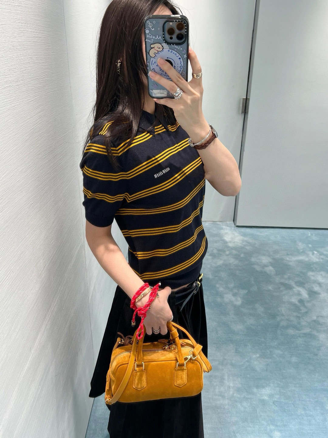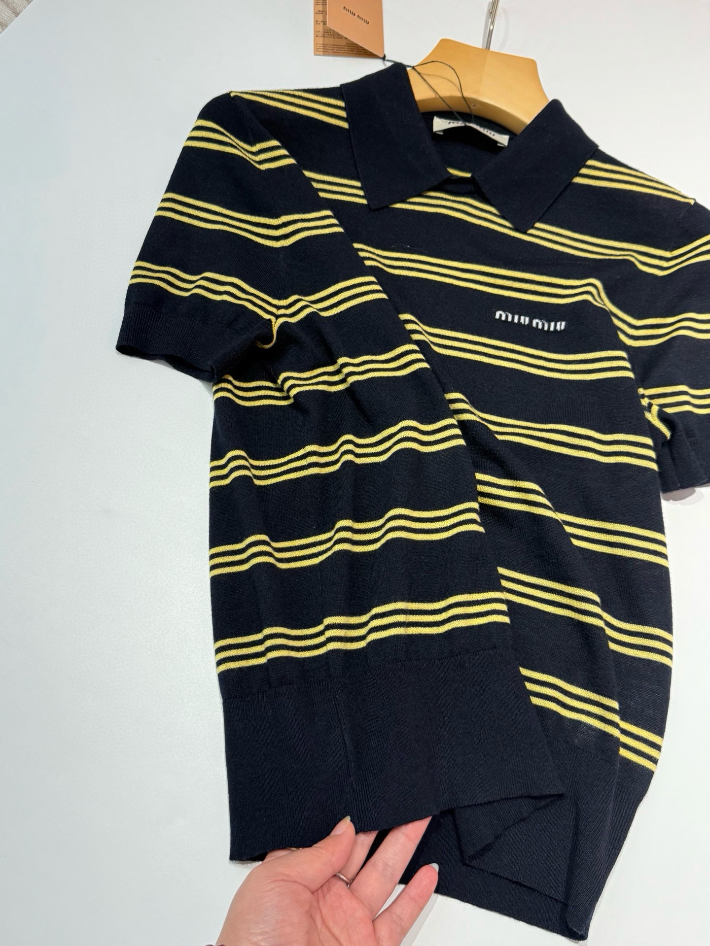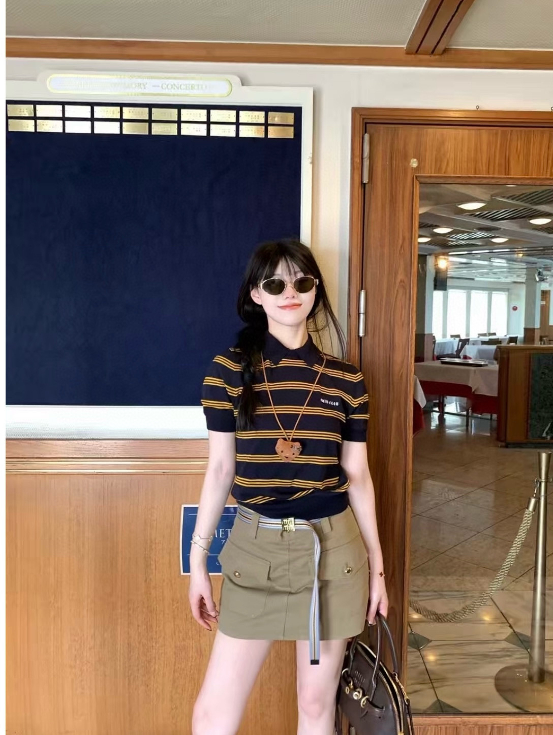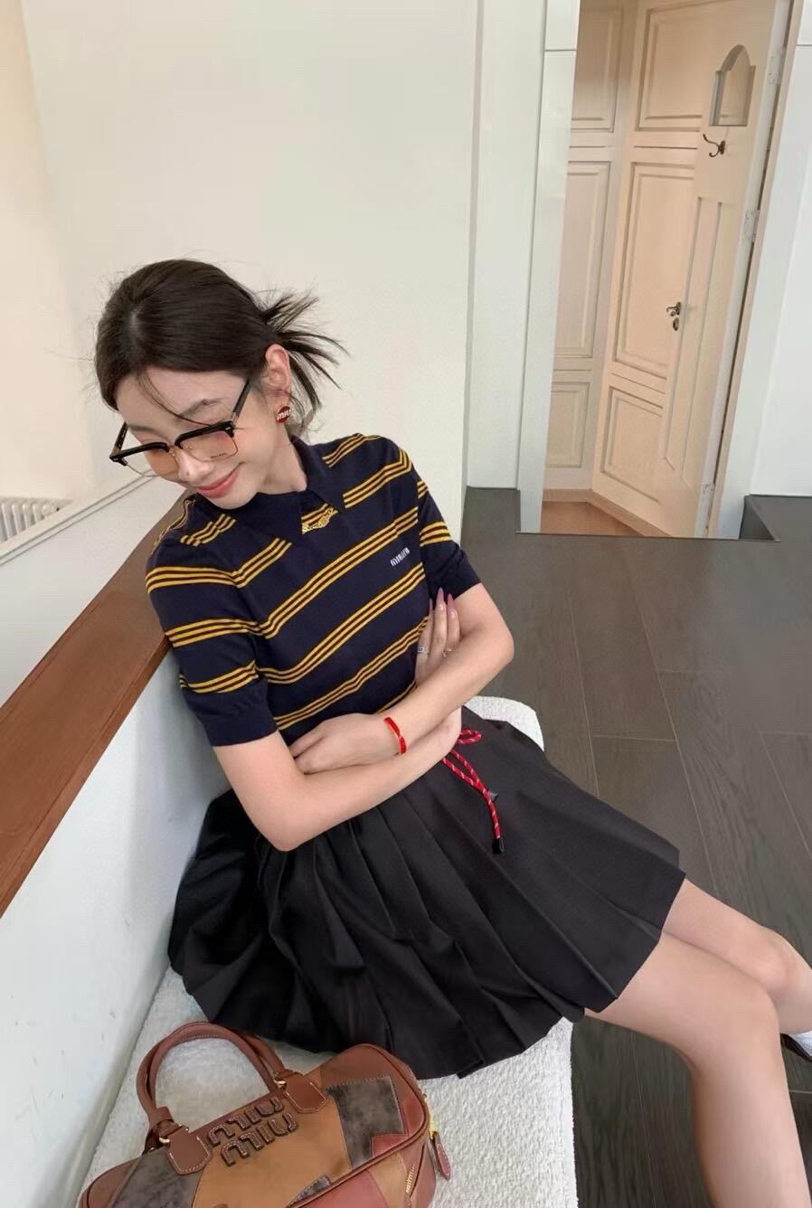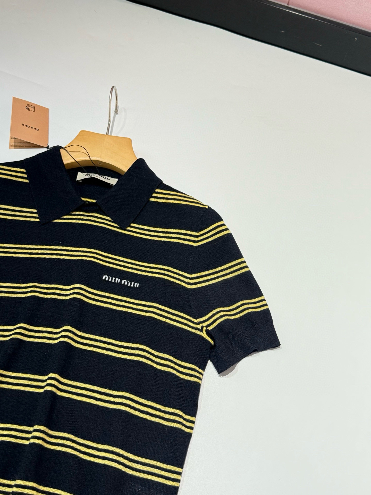 谁能拒绝MIU风魅力啊!复古与俏皮皆备,藏蓝色和亮黄相间的条纹配色,活泼又亮眼,上身秒变时髦精,不管搭配百褶裙打造甜酷学院风,还是配休闲裤应在随性氛围感,都毫无压力~