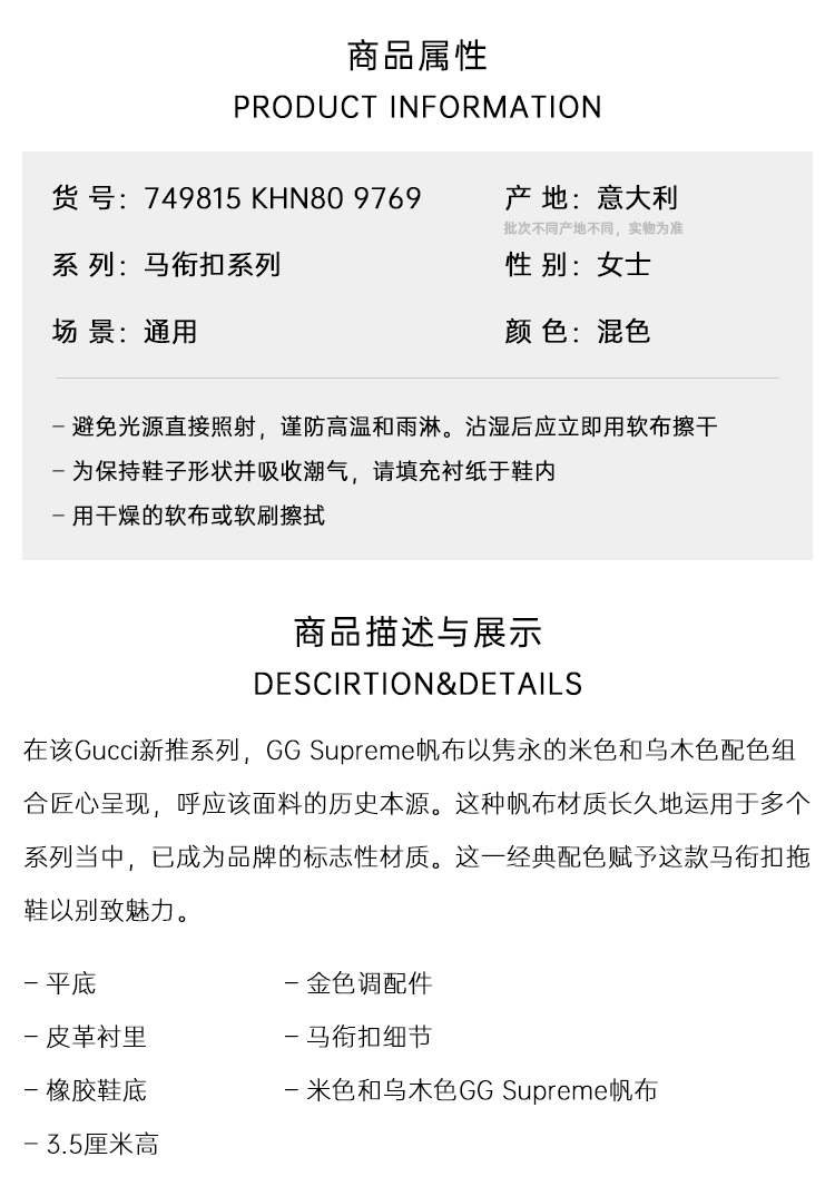 GUCCI 古驰 女士马衔扣休闲拖鞋 混色 749815 KHN80 9769