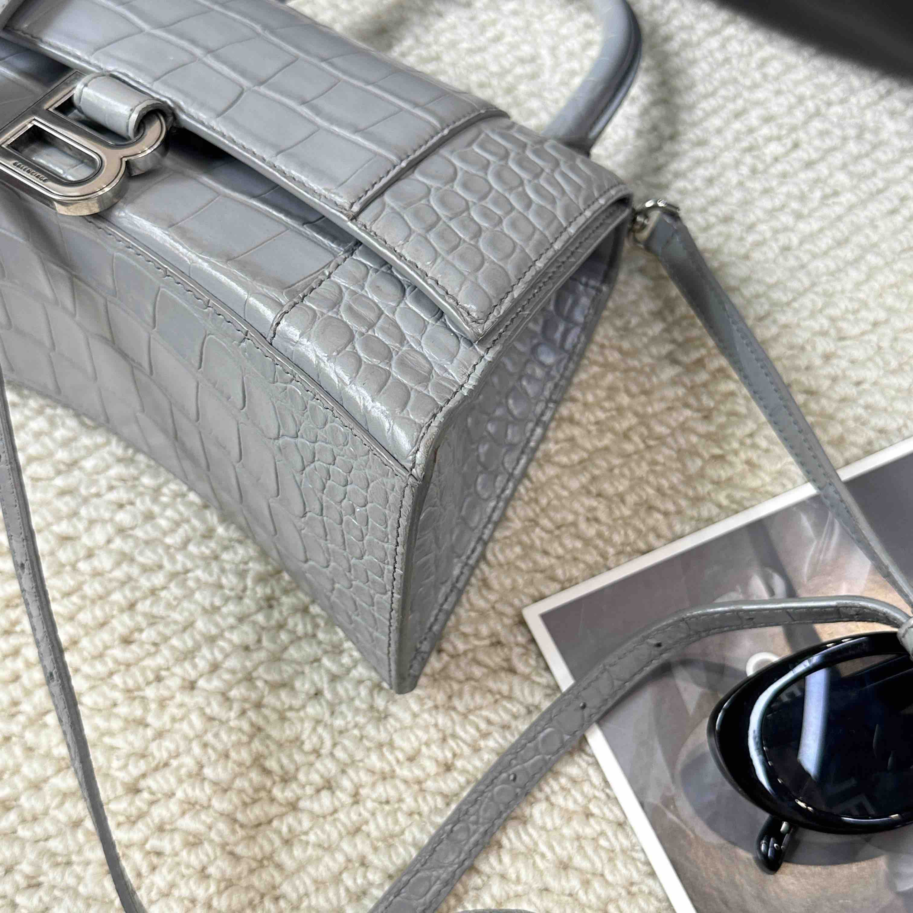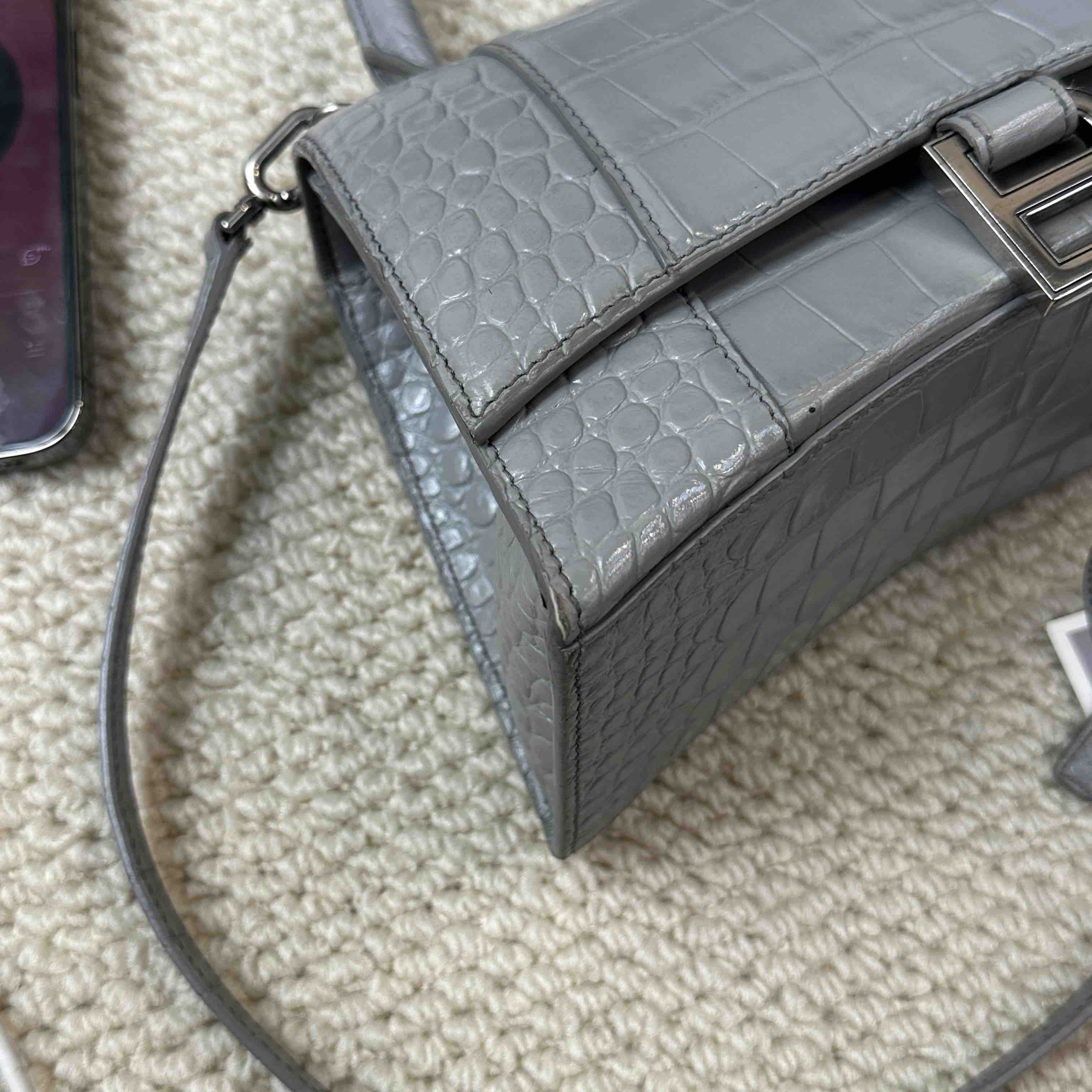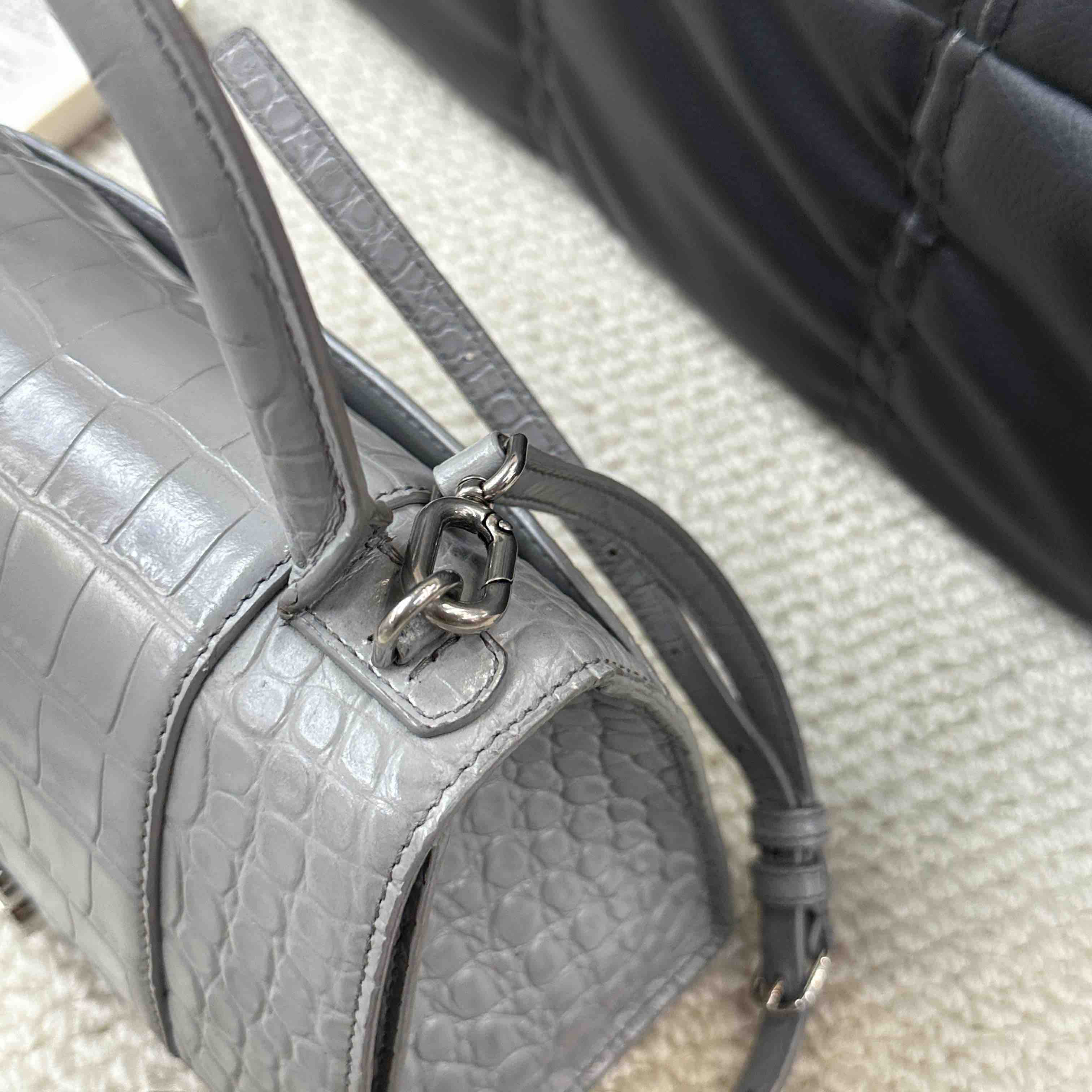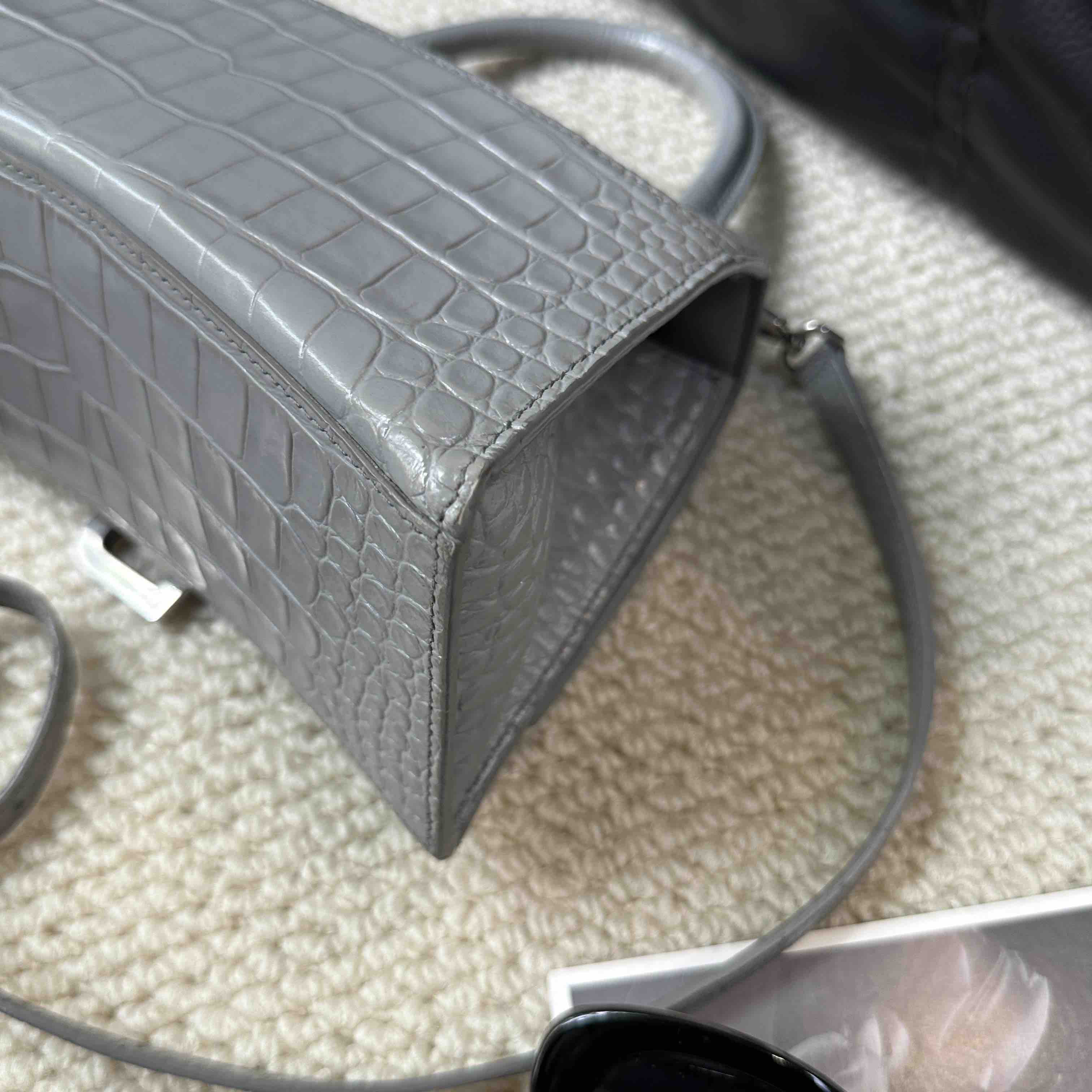 【商品详情】正品二手 巴黎世家 hourglass 灰色 鳄鱼纹牛皮 S号 沙漏包🥸95新 23×13 配件:肩带。两侧底边和肩带有正常使用痕迹 包型在线