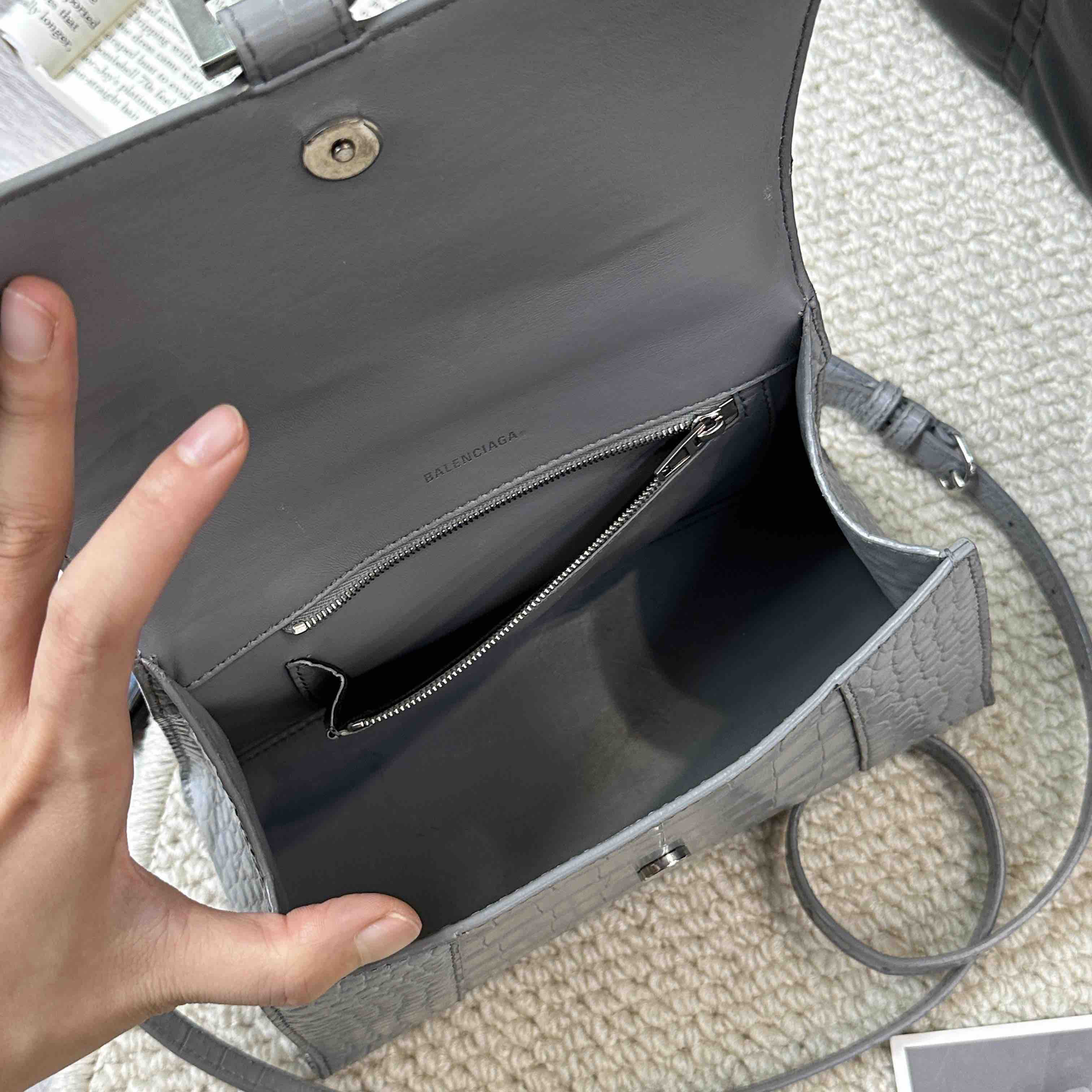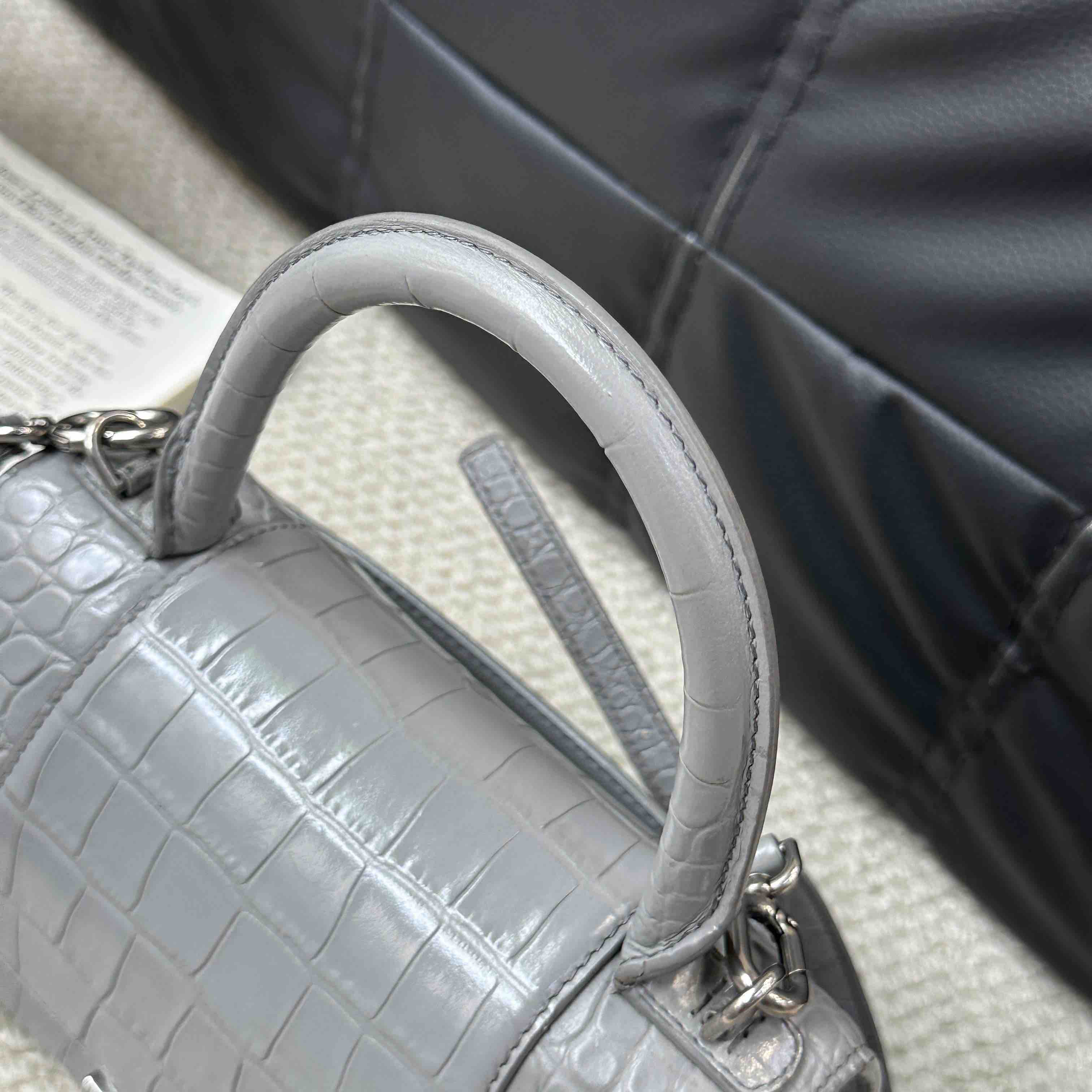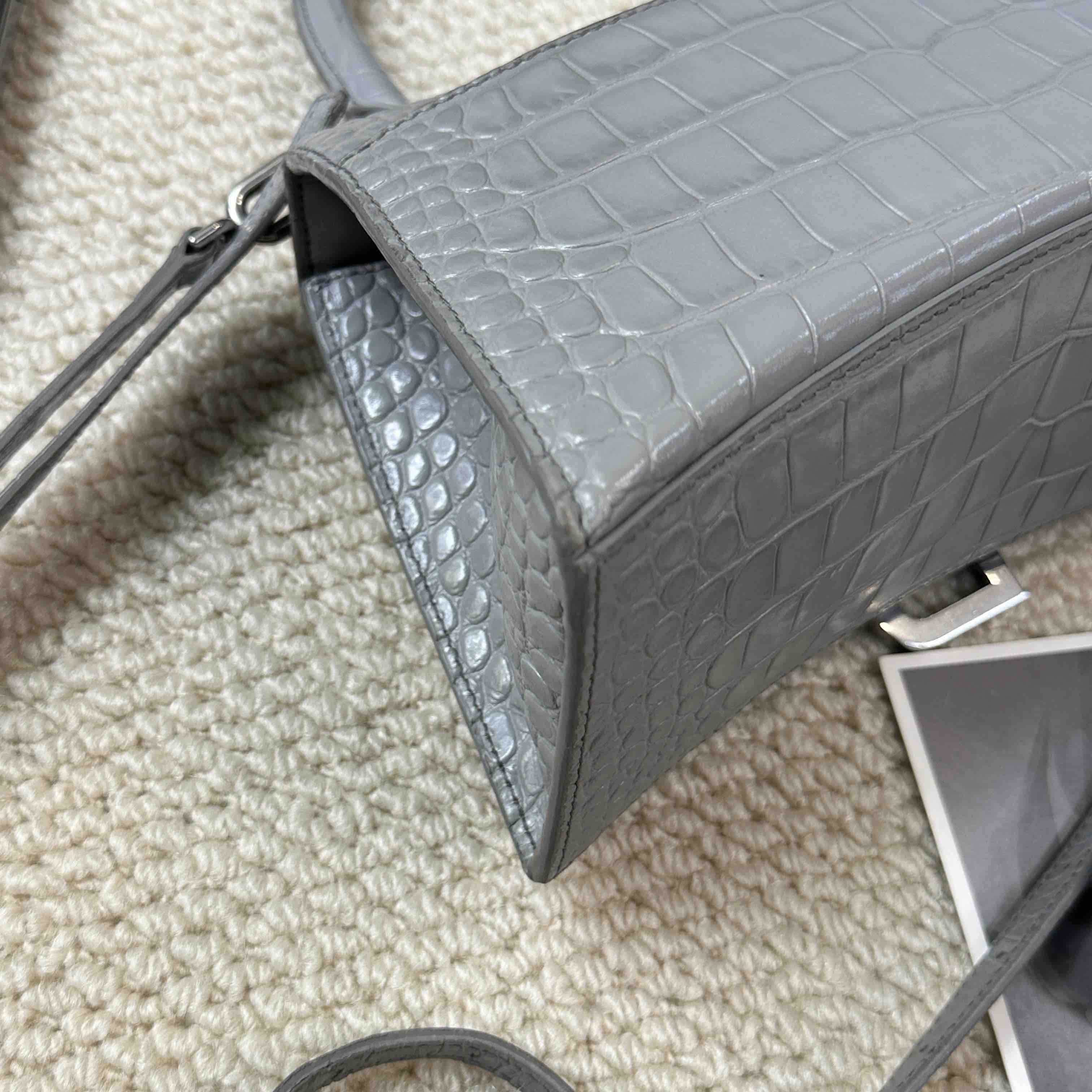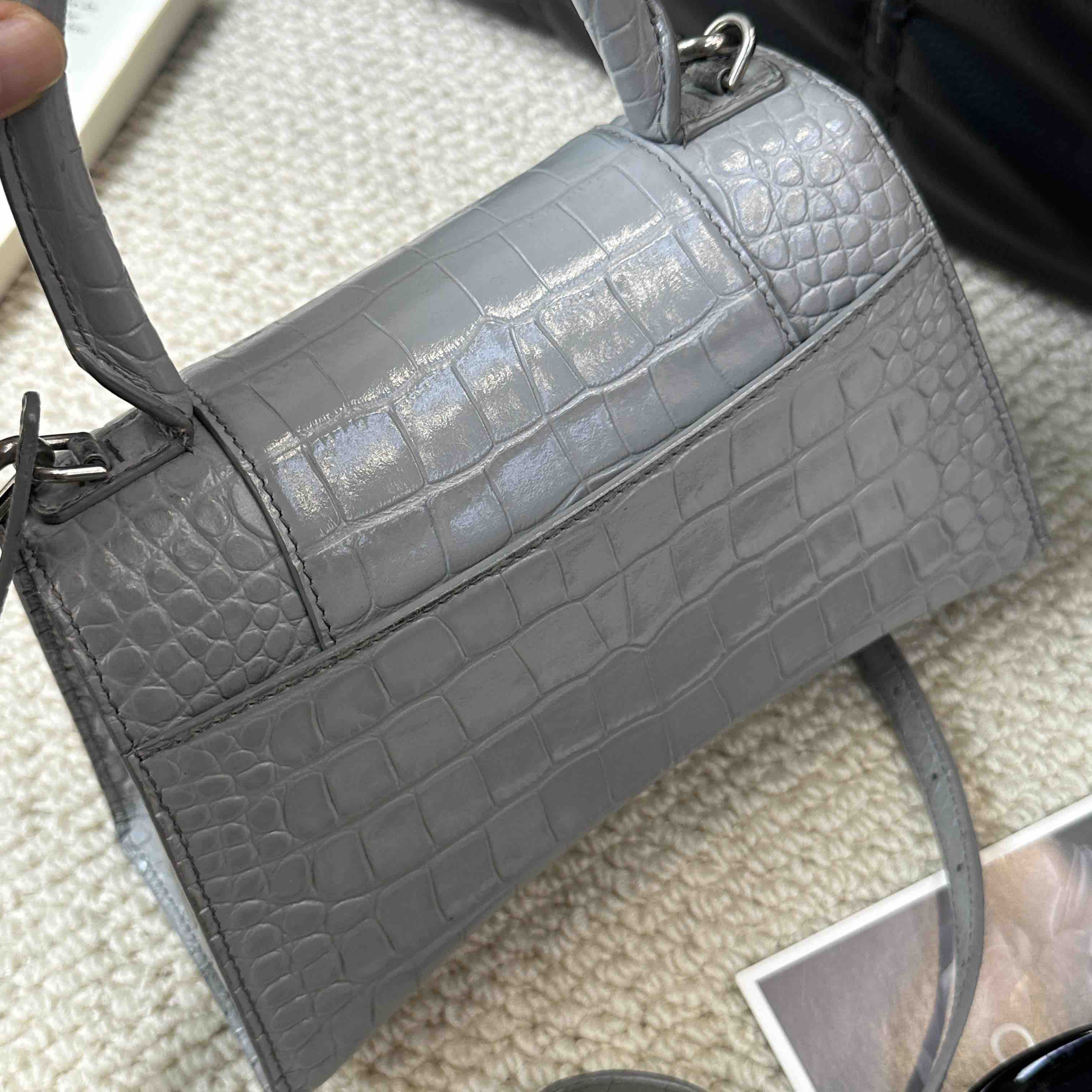 【商品详情】正品二手 巴黎世家 hourglass 灰色 鳄鱼纹牛皮 S号 沙漏包🥸95新 23×13 配件:肩带。两侧底边和肩带有正常使用痕迹 包型在线