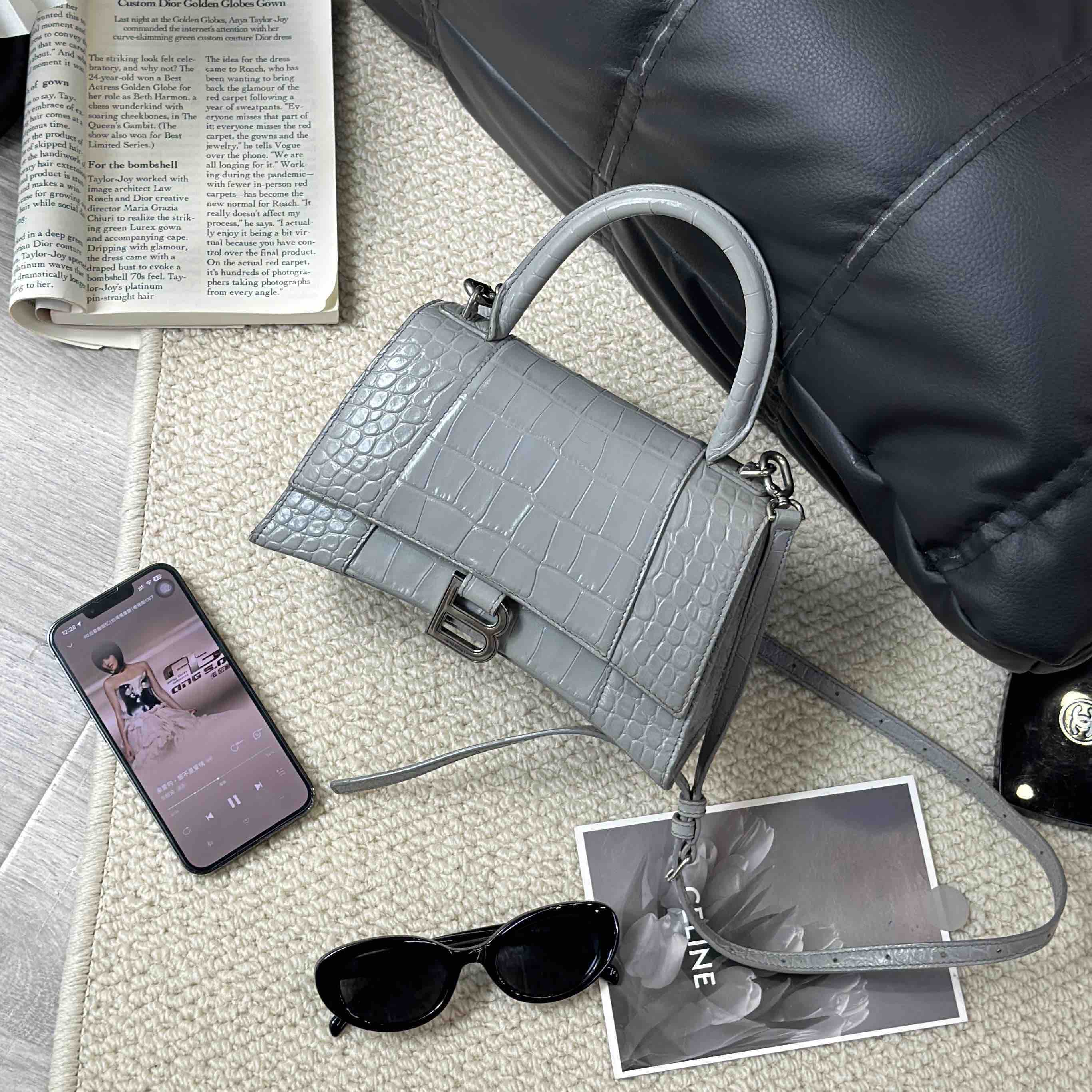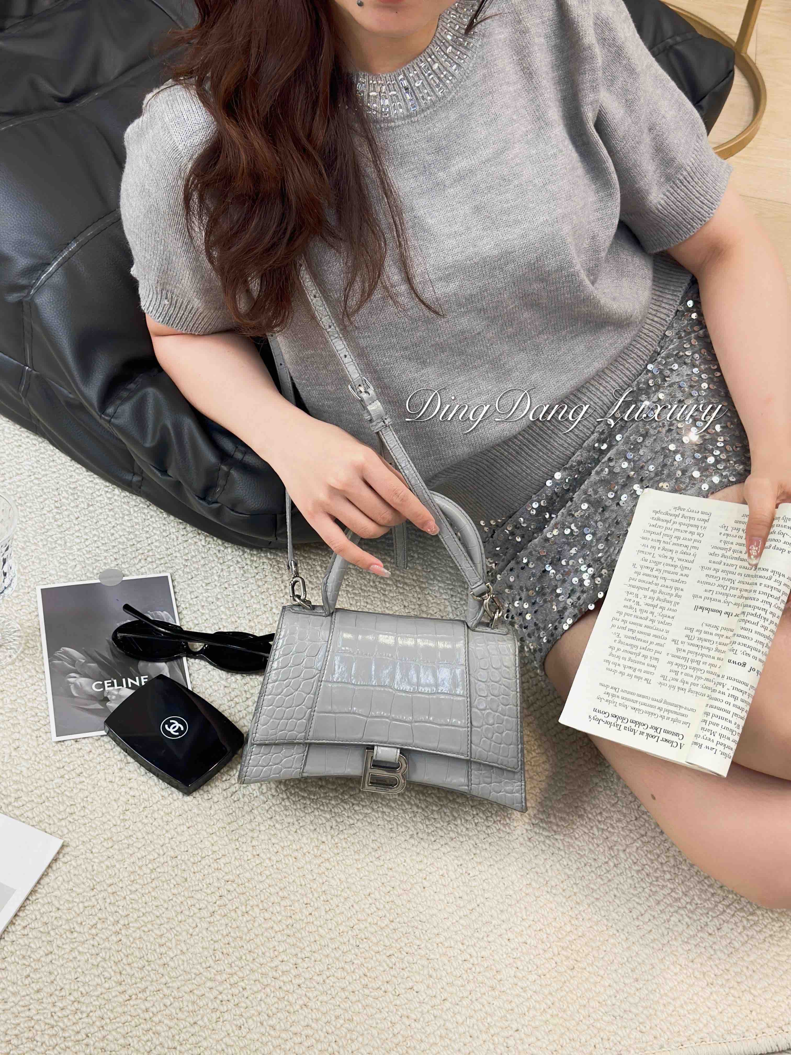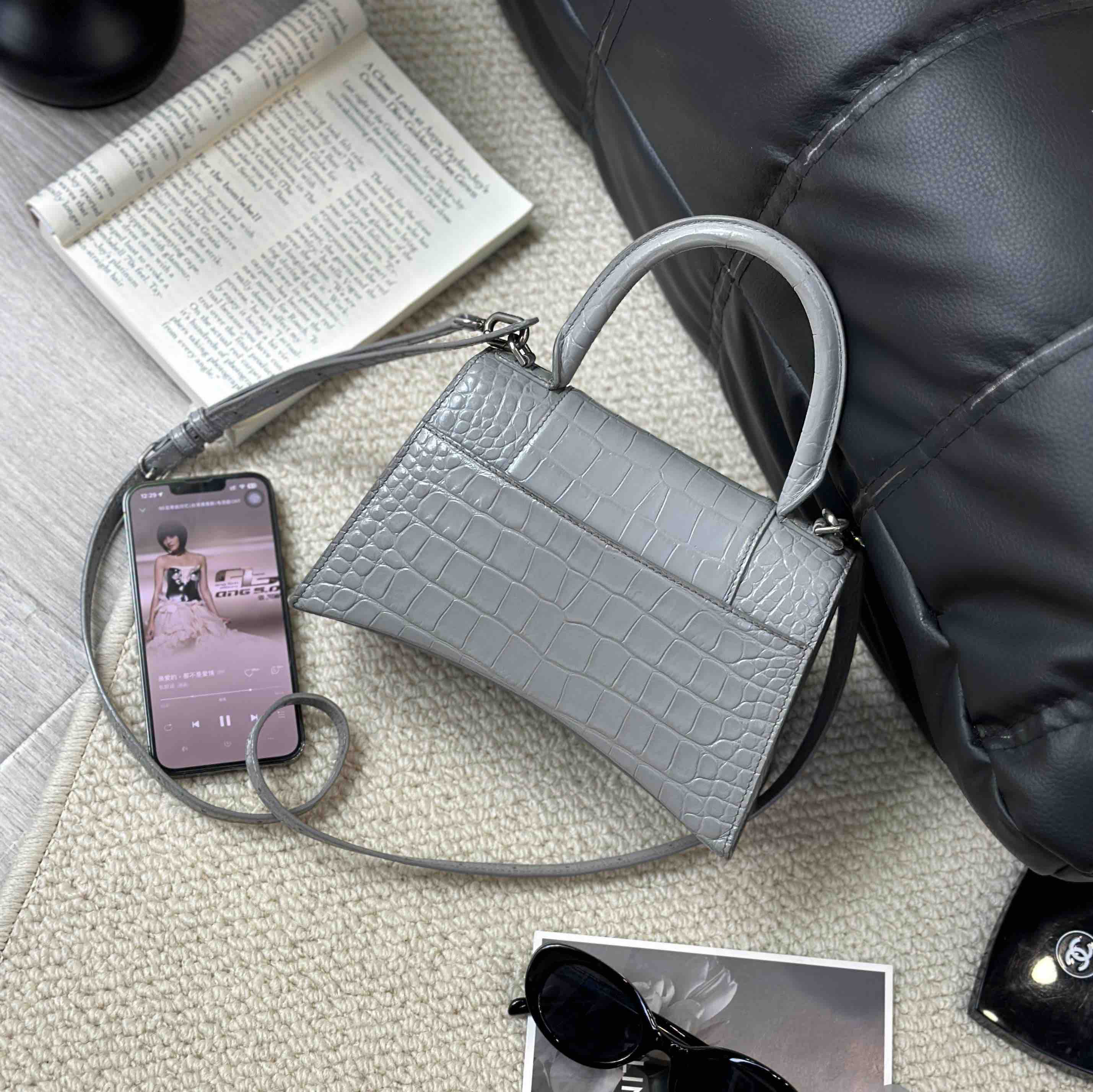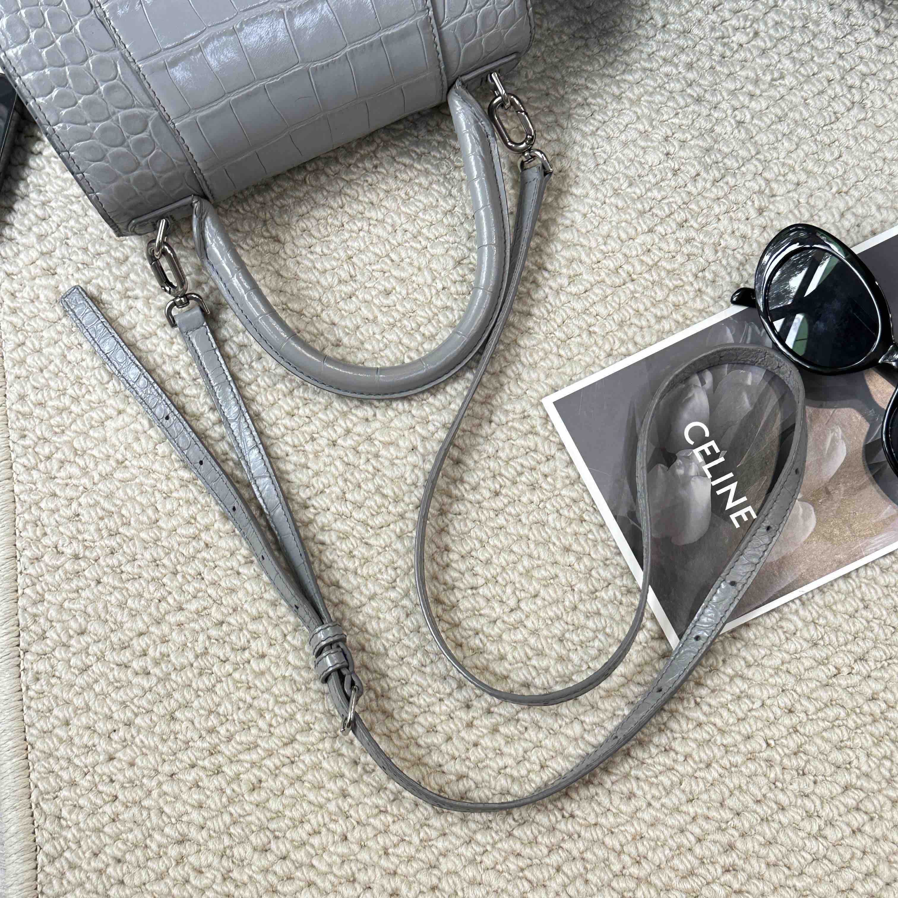 【商品详情】正品二手 巴黎世家 hourglass 灰色 鳄鱼纹牛皮 S号 沙漏包🥸95新 23×13 配件:肩带。两侧底边和肩带有正常使用痕迹 包型在线