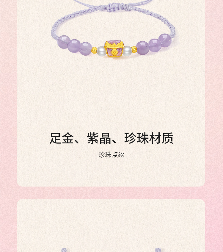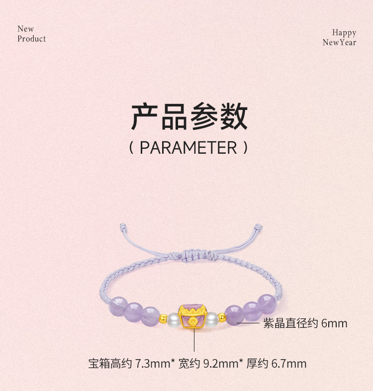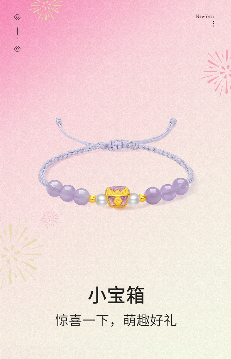 周六福黄金珍珠手绳女小宝箱黄金镶嵌紫晶珐琅百宝箱手绳新春礼物