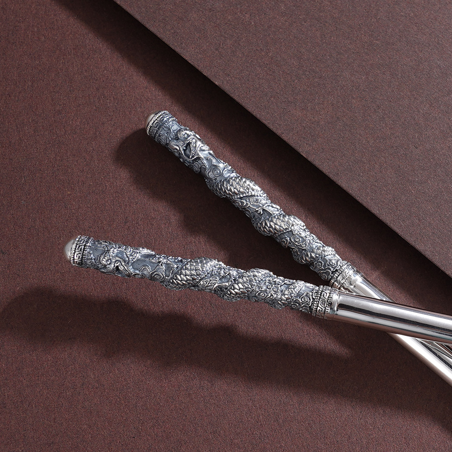 【寓意】:作品以足银材质打造,应用浮雕工艺于筷头处雕琢盘龙图案,凸显出有质感的防滑设计,又传递了福顺安宁的美好寓意。