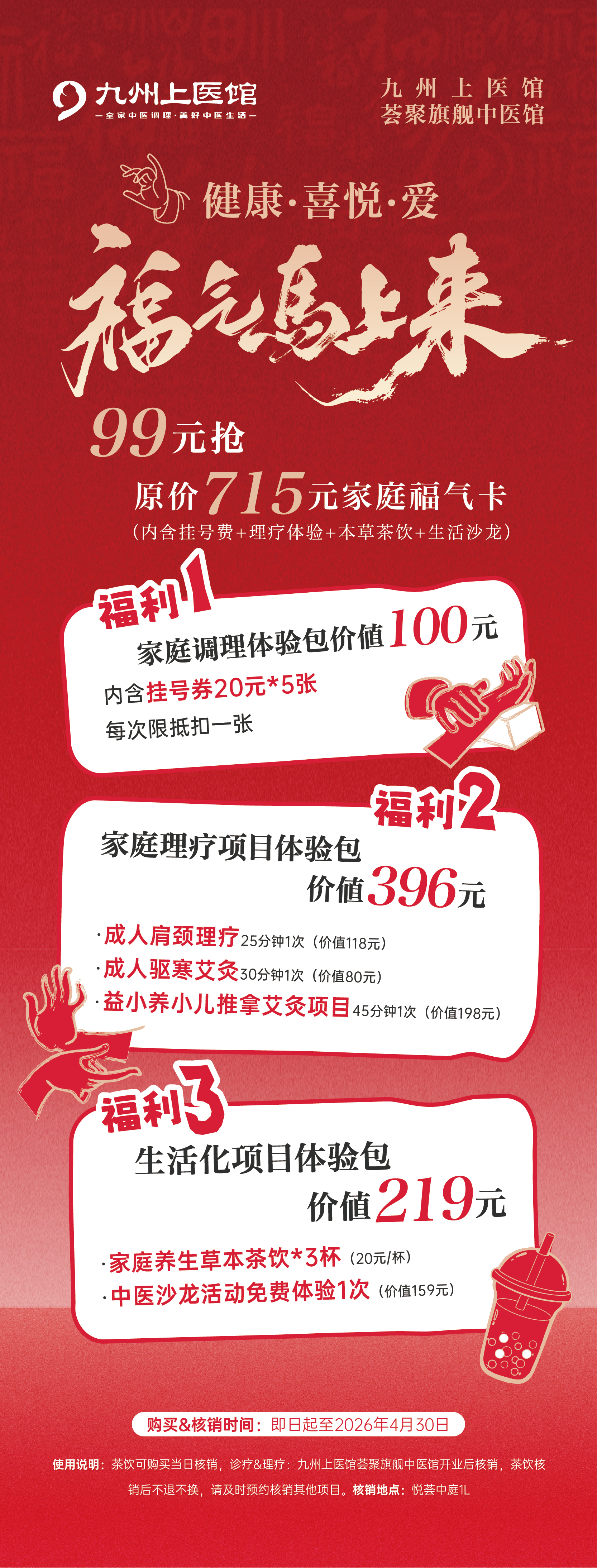购买当天核销先得寻茶券·家庭福气卡(其余权益仅限荟聚旗舰中医馆开业后核销)