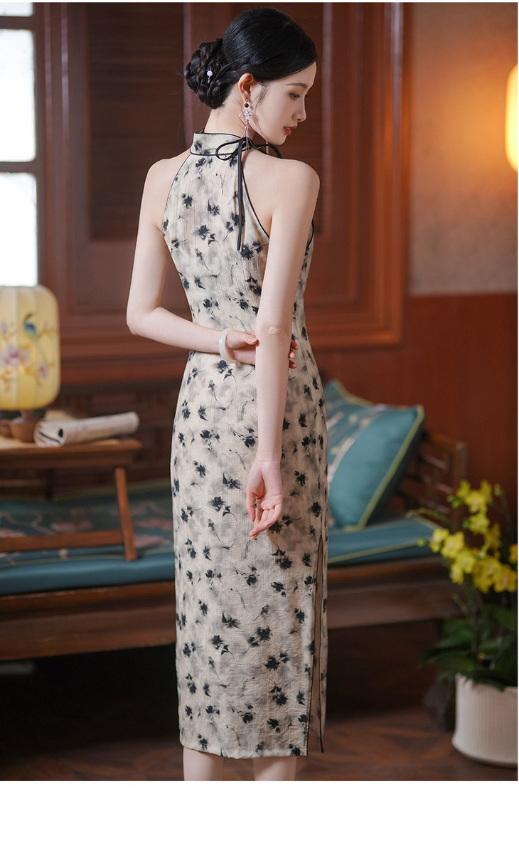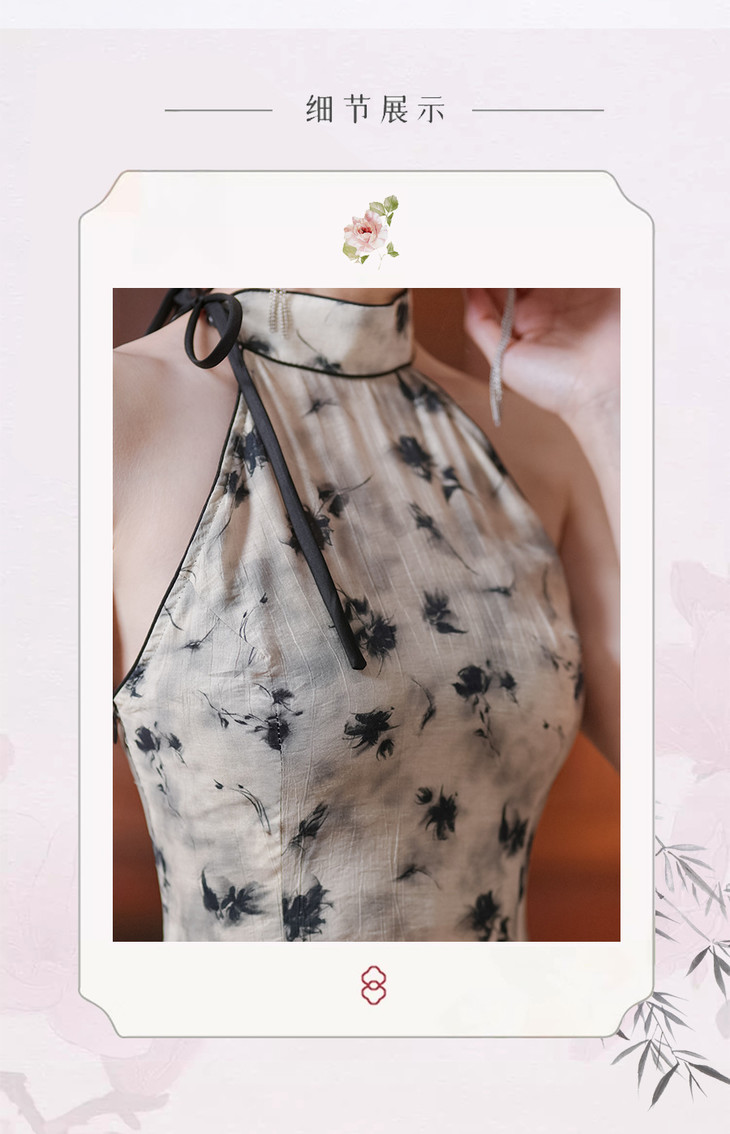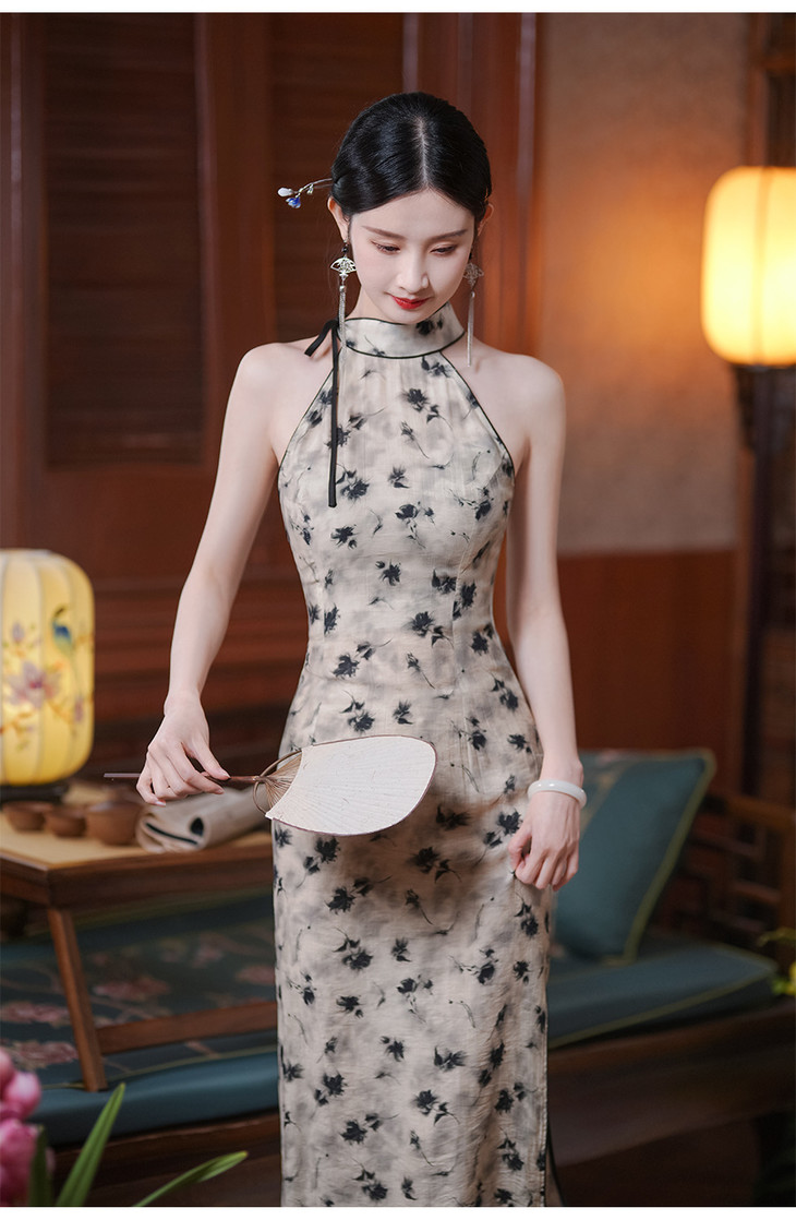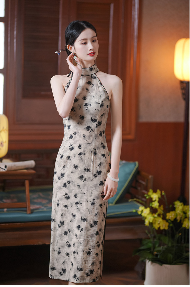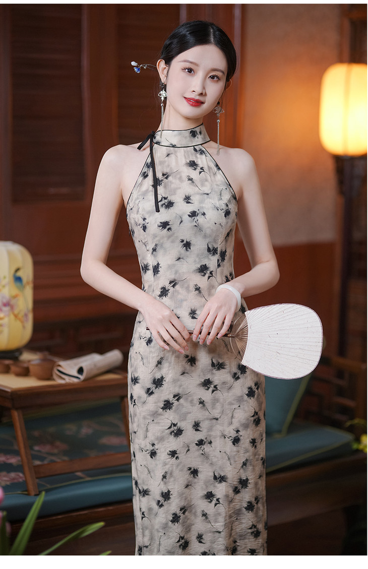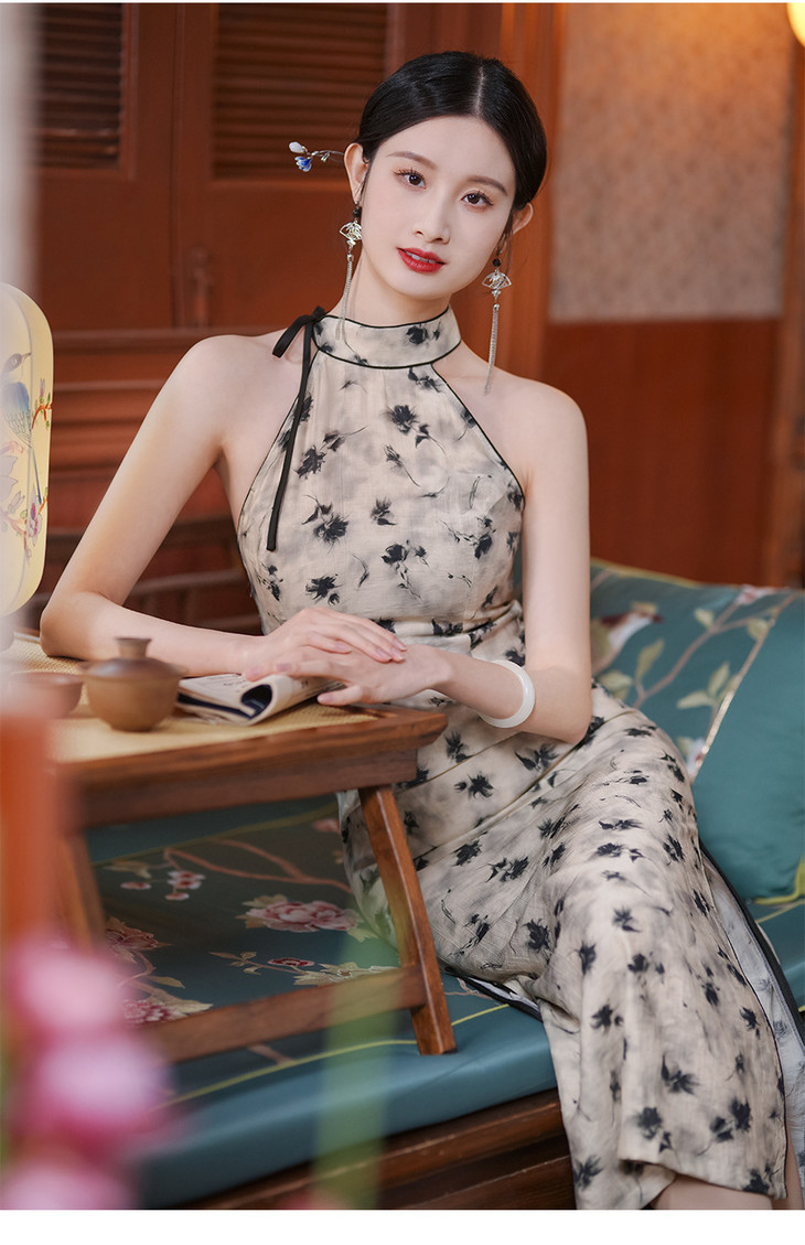 新中式挂脖丝麻,气质修身长旗袍LSB2692