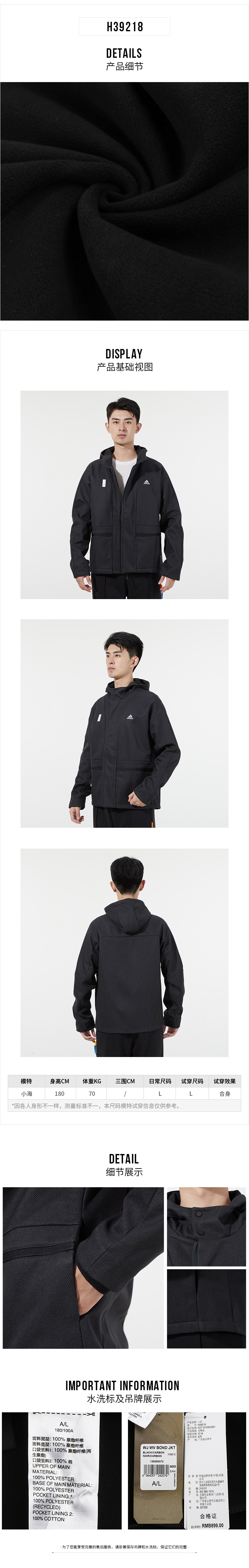 adidas阿迪达斯男装 2021冬季新款武极系列训练户外防风连帽时尚开衫夹克外套H39218