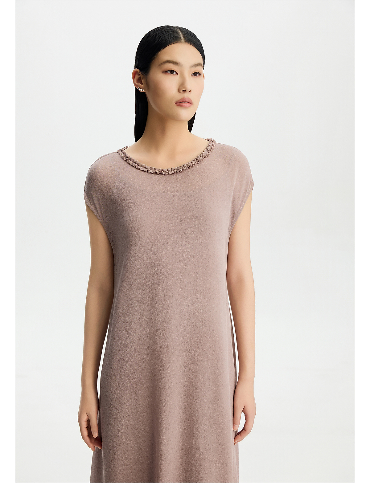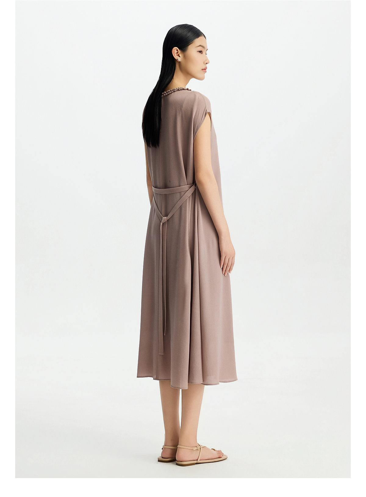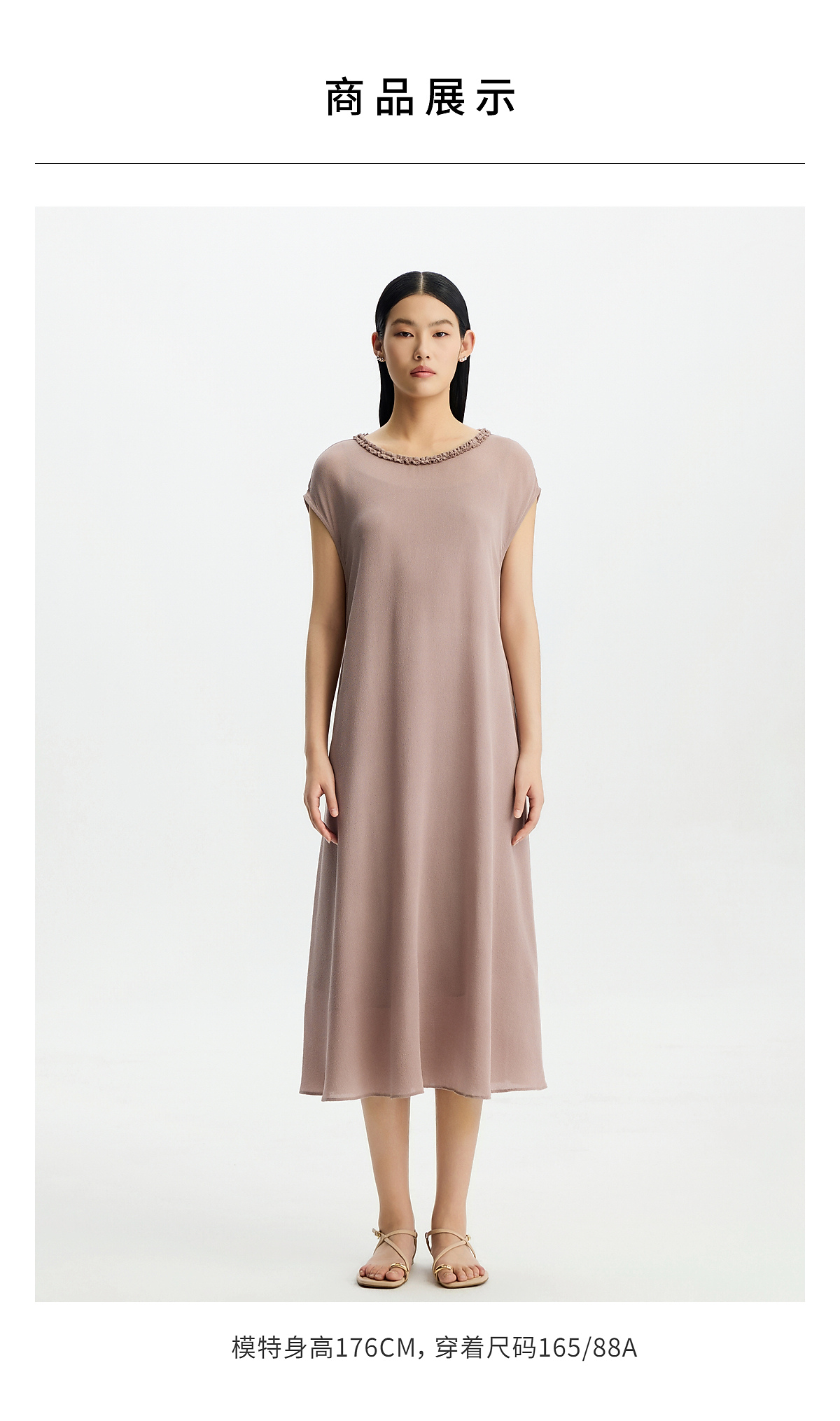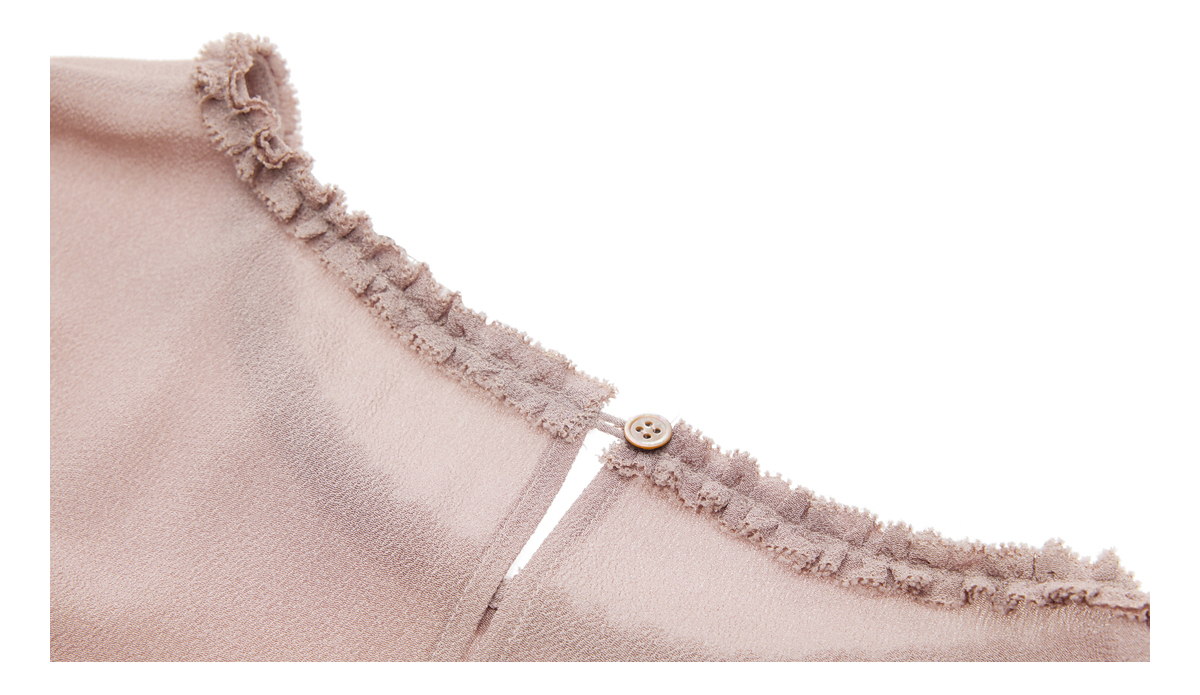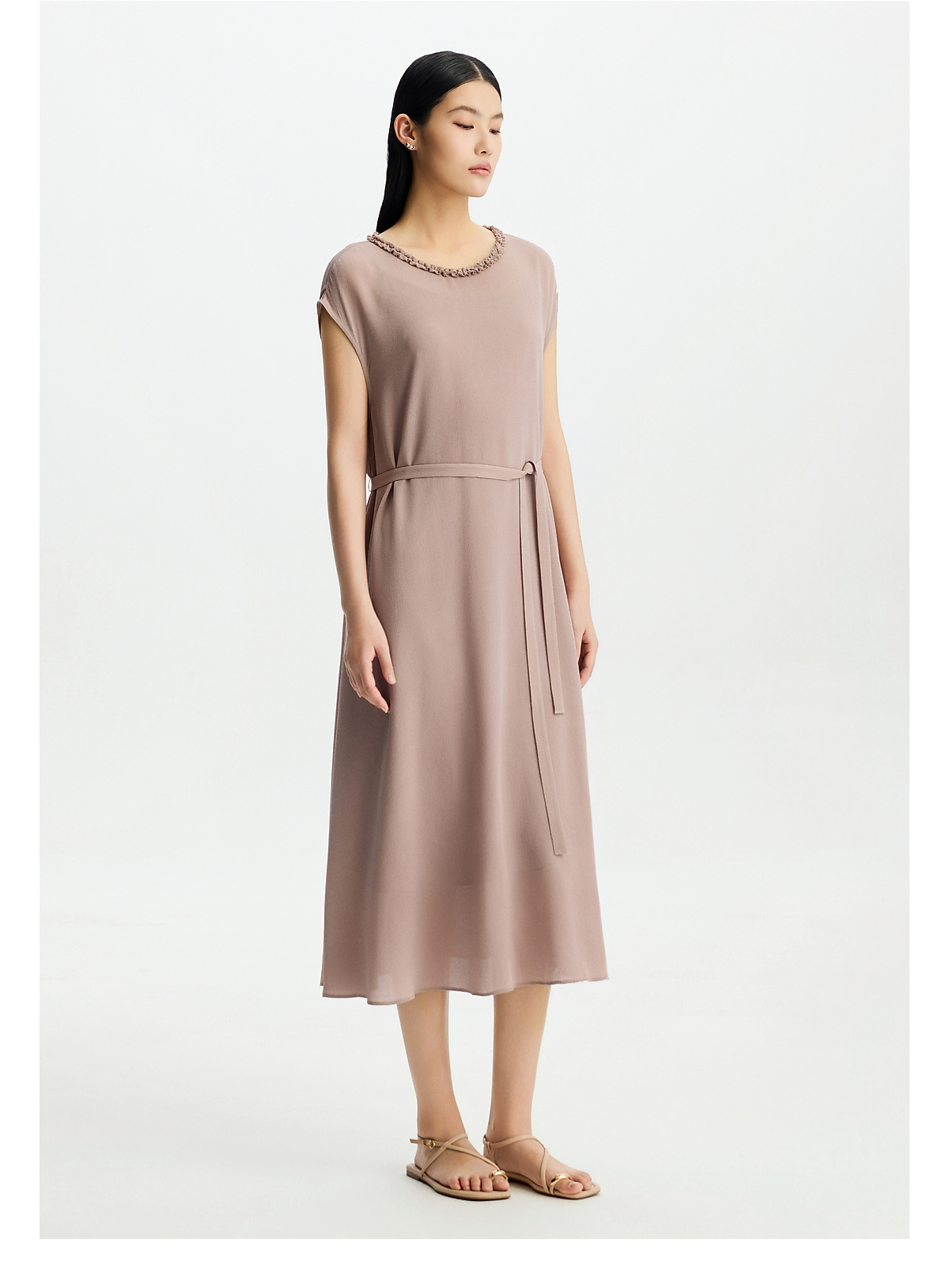 PURE TOUCH女26春夏新款木耳边连衣裙真丝鬼绉桑蚕丝系带中长裙