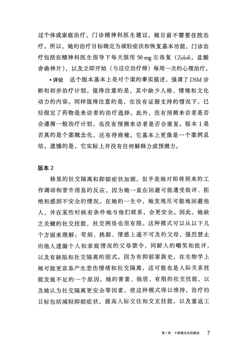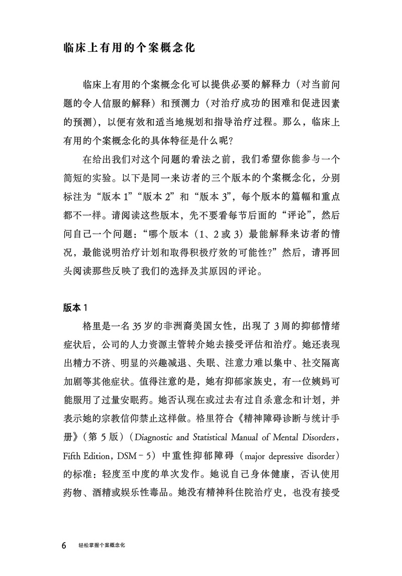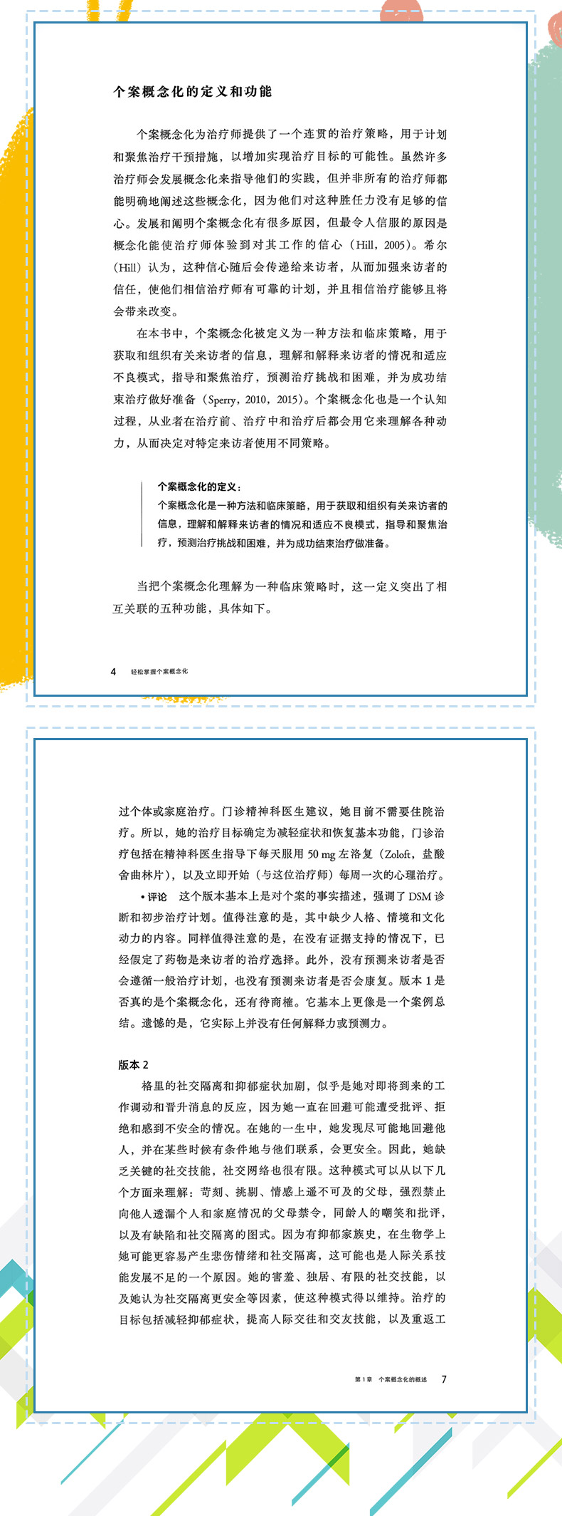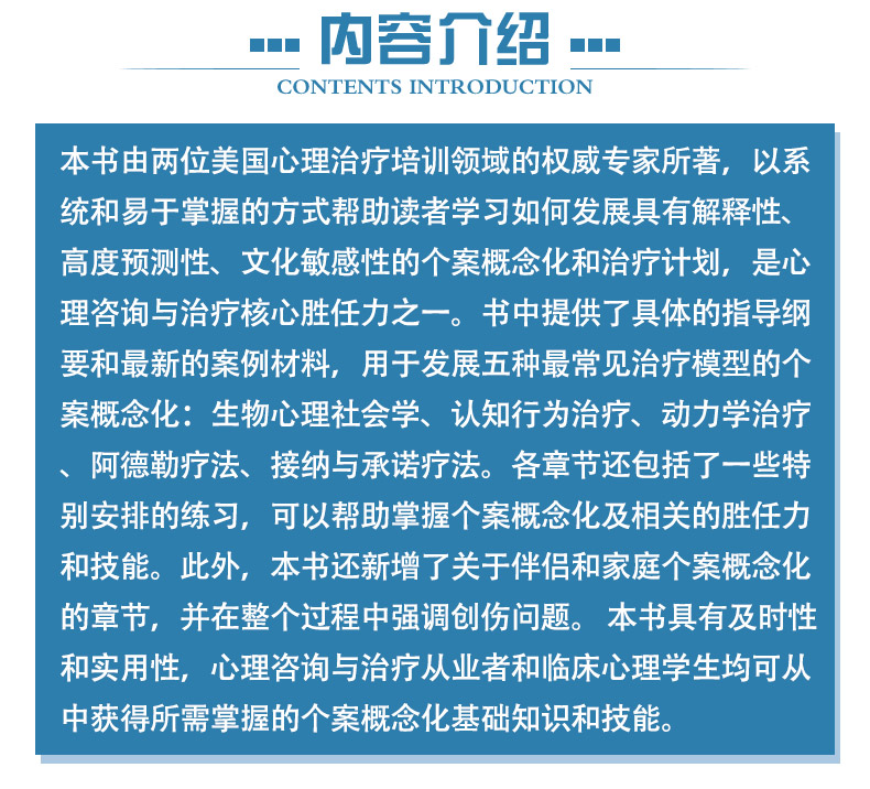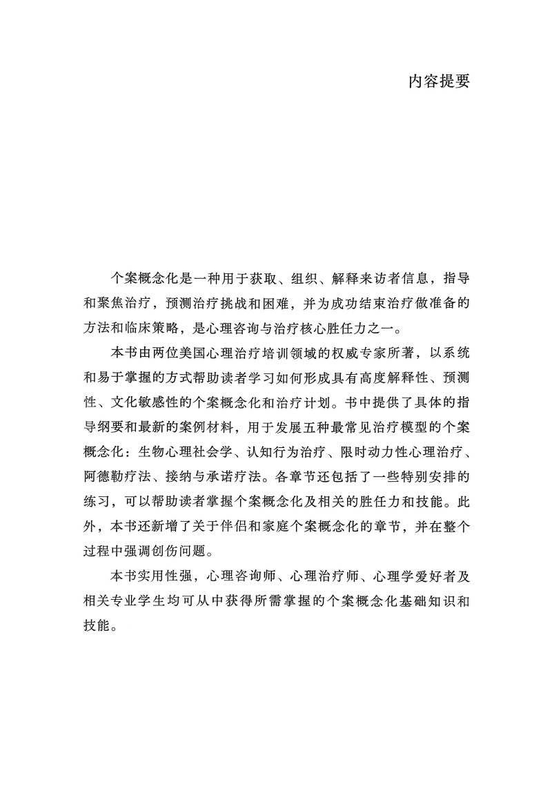 本书由两位美国心理治疗培训领域的权威专家所著,以系统和易于掌握的方式帮助读者学习如何发展具有解释性、高度预测性、文化敏感性的个案概念化和治疗计划,是心理咨询与治疗核心胜任力之一。书中提供了具体的指导纲要和最新的案例材料,用于发展五种最常见治疗模型的个案概念化:生物心理社会学、认知行为治疗、动力学治疗、阿德勒疗法、接纳与承诺疗法。各章节还包括了一些特别安排的练习,可以帮助掌握个案概念化及相关的胜任力和技能。此外,本书还新增了关于伴侣和家庭个案概念化的章节,并在整个过程中强调创伤问题。 本书具有及时性和实用性,心理咨询与治疗从业者和临床心理学生均可从中获得所需掌握的个案概念化基础知识和技能。