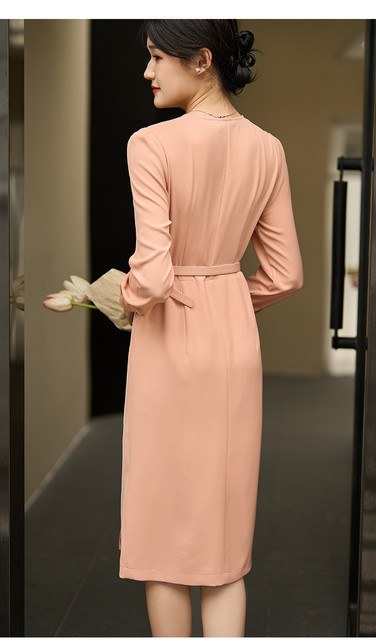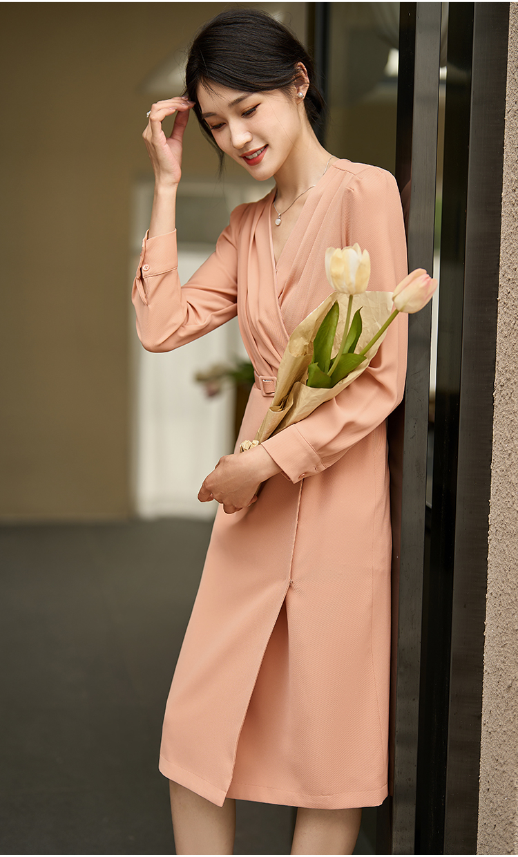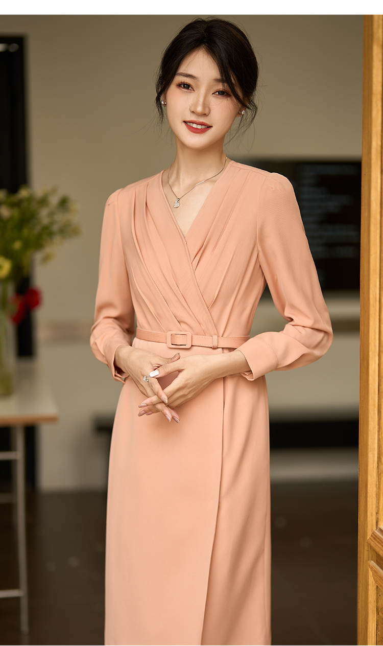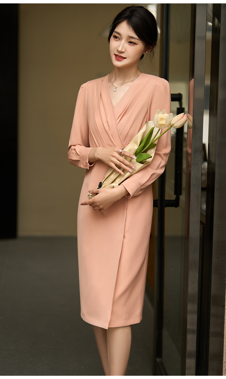 米思阳2026春季新款气质高级感收腰连衣裙v领褶皱修身一步裙0517