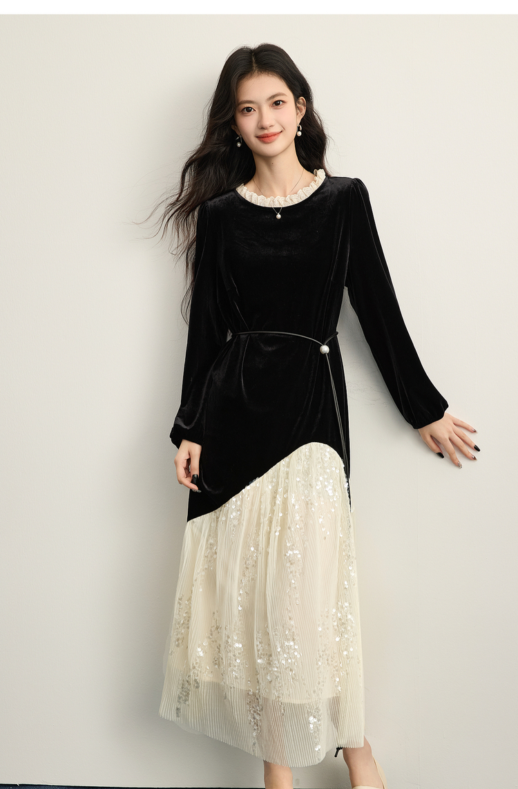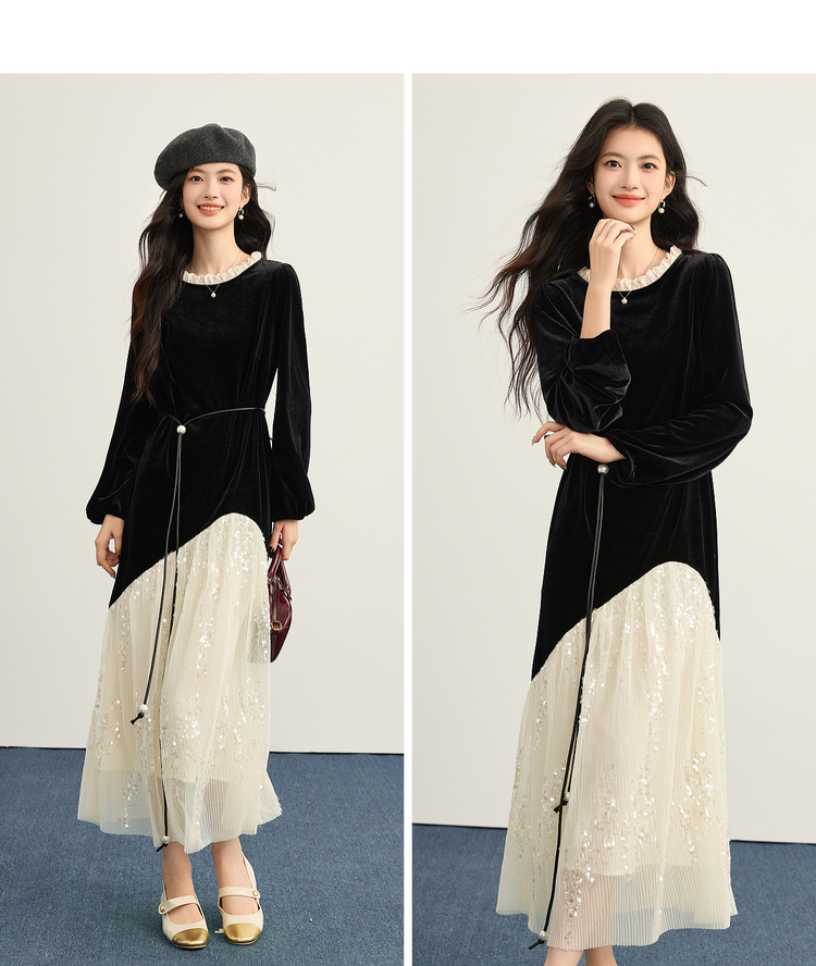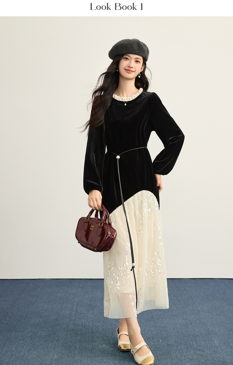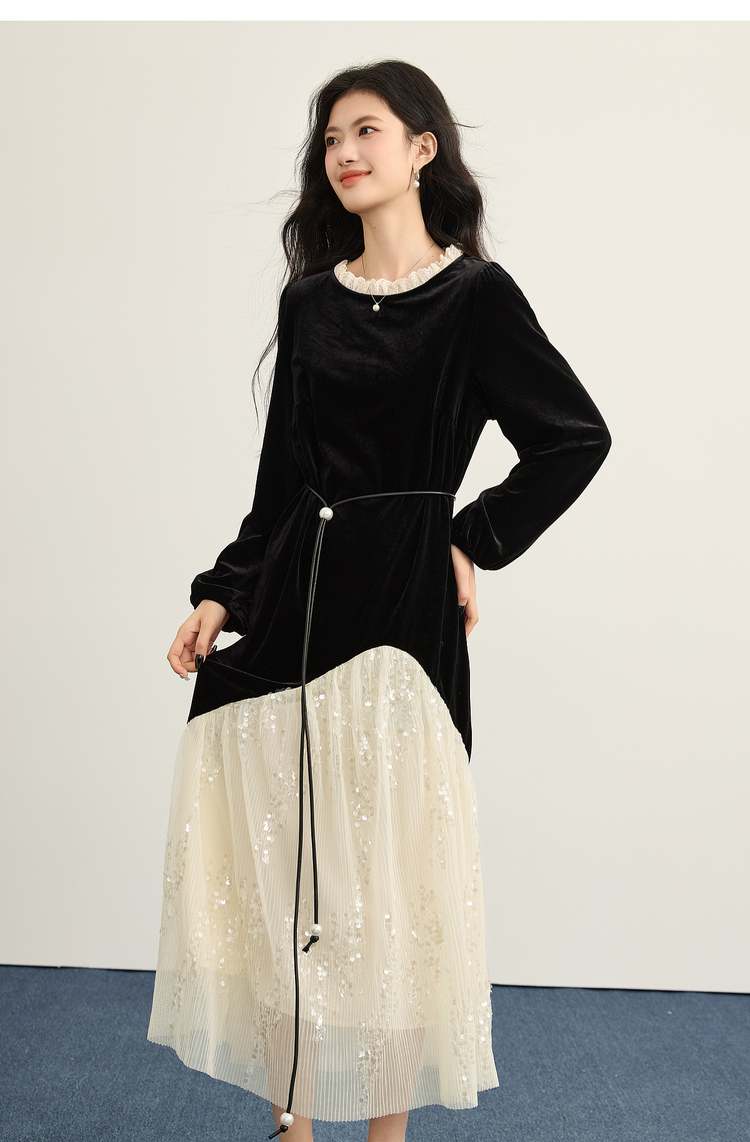 【12/10新品6折】熙世界富家千金赫本风亮片网纱拼接假两件丝绒连衣裙女25秋冬新款