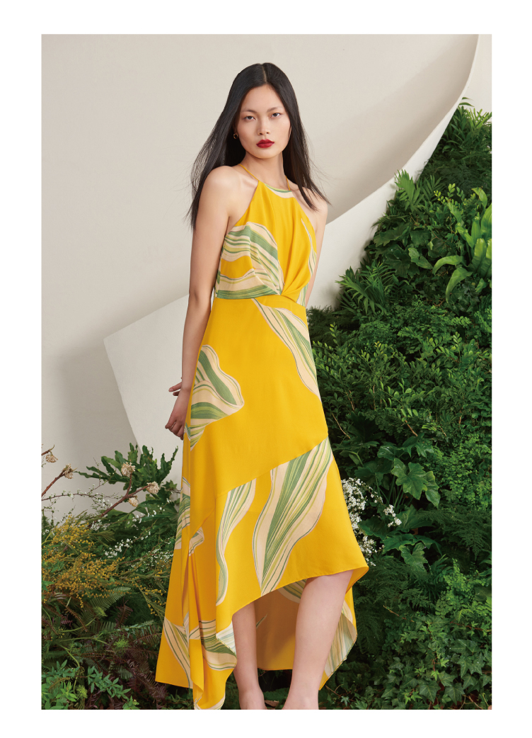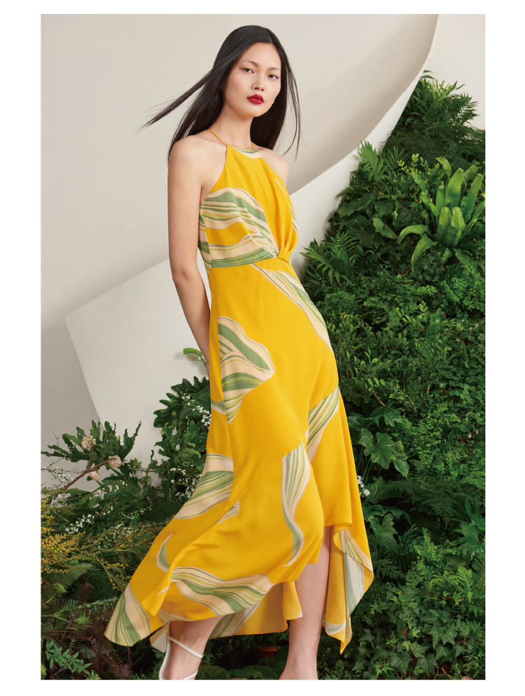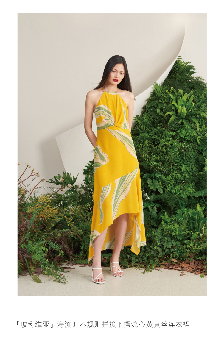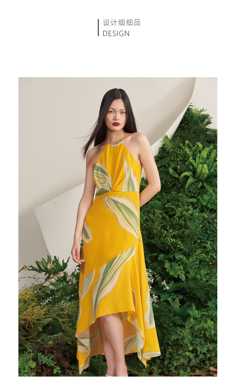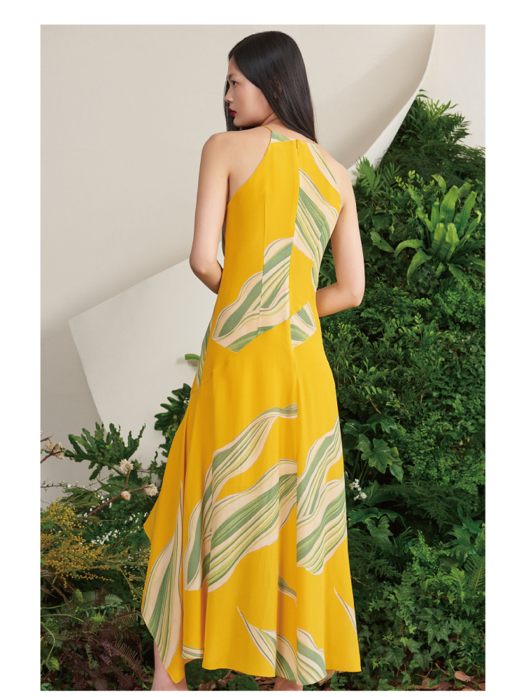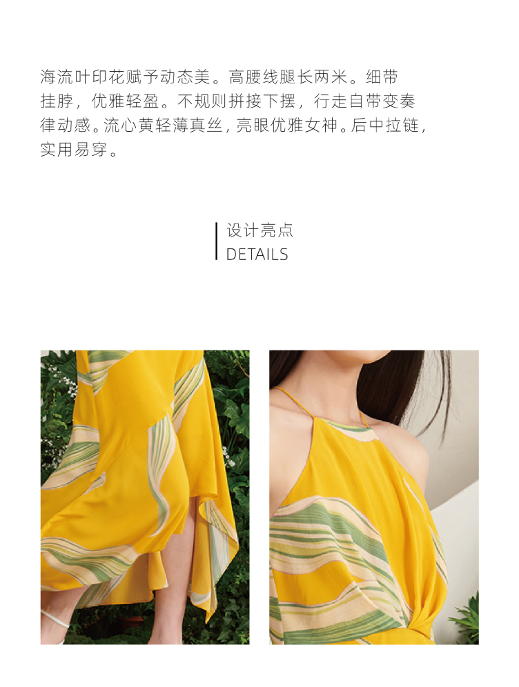 【玻利维亚】海流叶不规则拼接下摆流心黄真丝连衣裙/0000668D