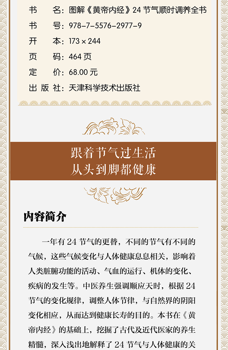 一年有24节气的更替,不同的节气有不同的气候,这些气候变化与人体健康息息相关,影响着人类脏腑功能的活动、气血的运行、机体的变化、疾病的发生等。中医养生强调顺应天时,根据24节气的变化规律,调整人体节律,与自然界的阴阳变化相应,从而达到健康长寿的目的。本书在《黄帝内经》的基础上,挖掘了古代及近代医家的养生精髓,深入浅出地解释了24节气与人体健康的关系,针对现代人的生活特点和体质特点,提出了24节气日常养生全方案,讲解每个节气最适宜的养生方法,并从饮食、起居、运动、防病、治病等各个方面提供了详细指导,囊括了药膳养生、运动养生、按摩、针灸等诸多养生手段和治疗手段,全家老少都可使用。