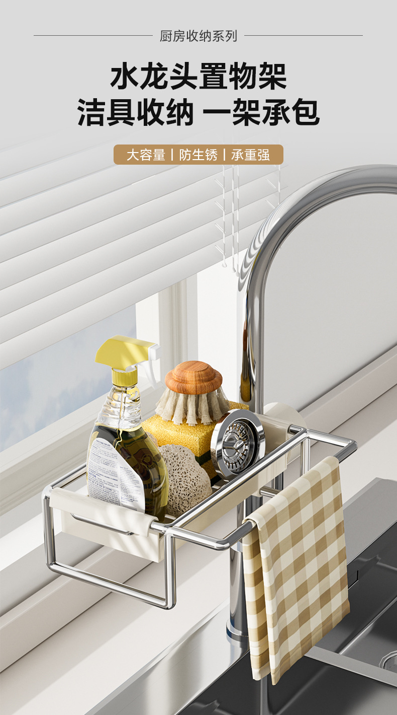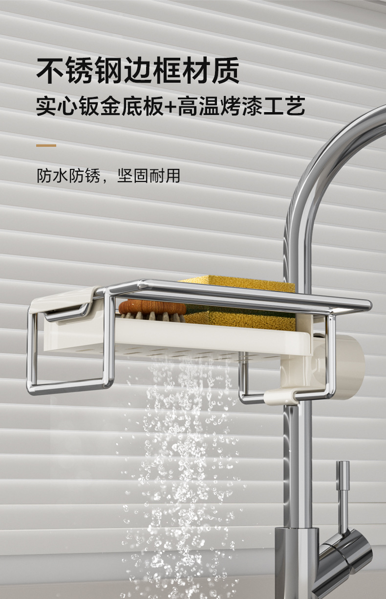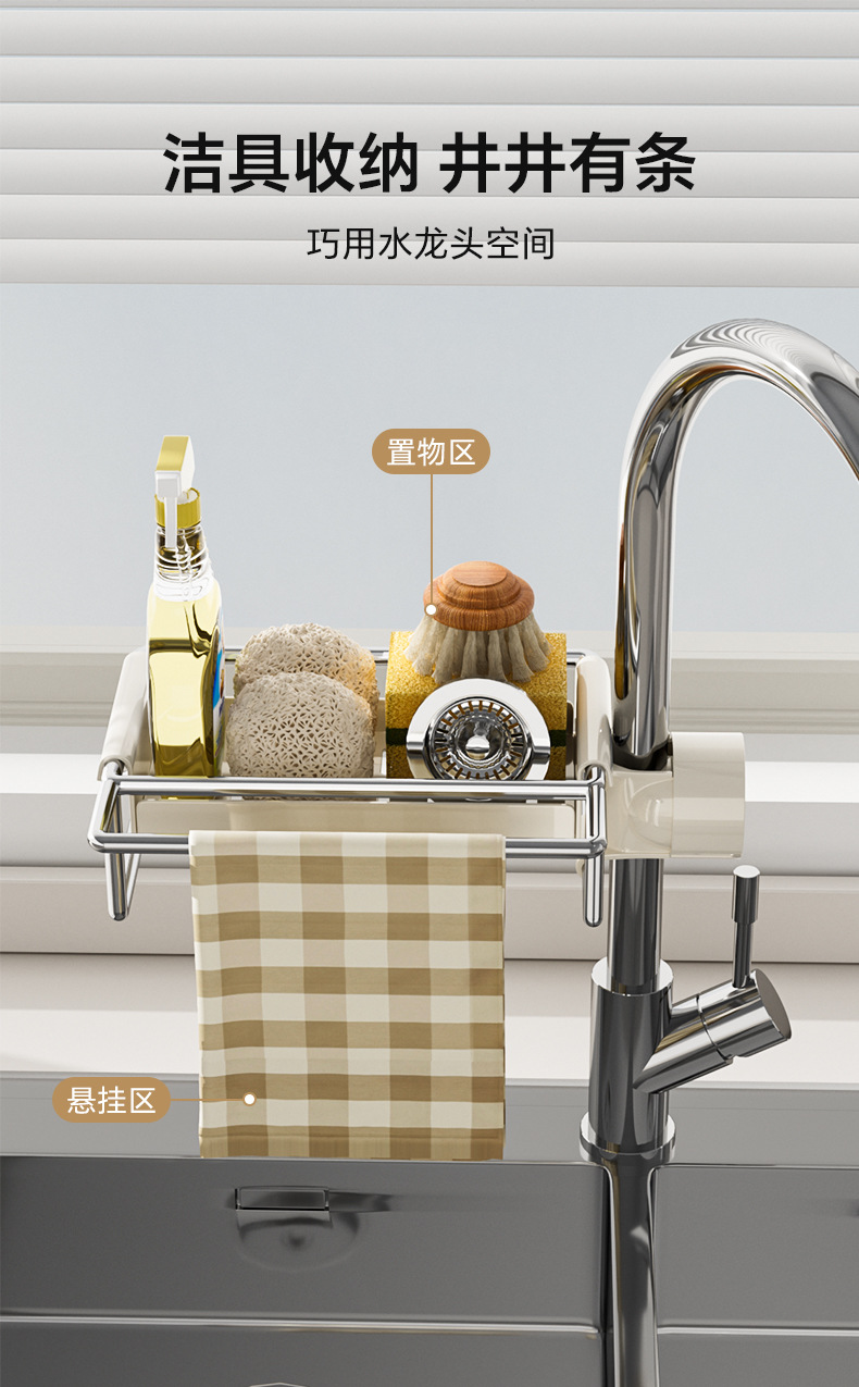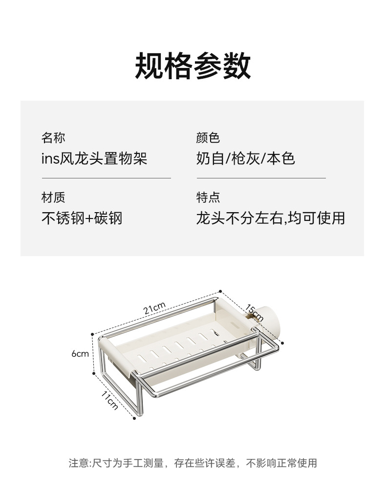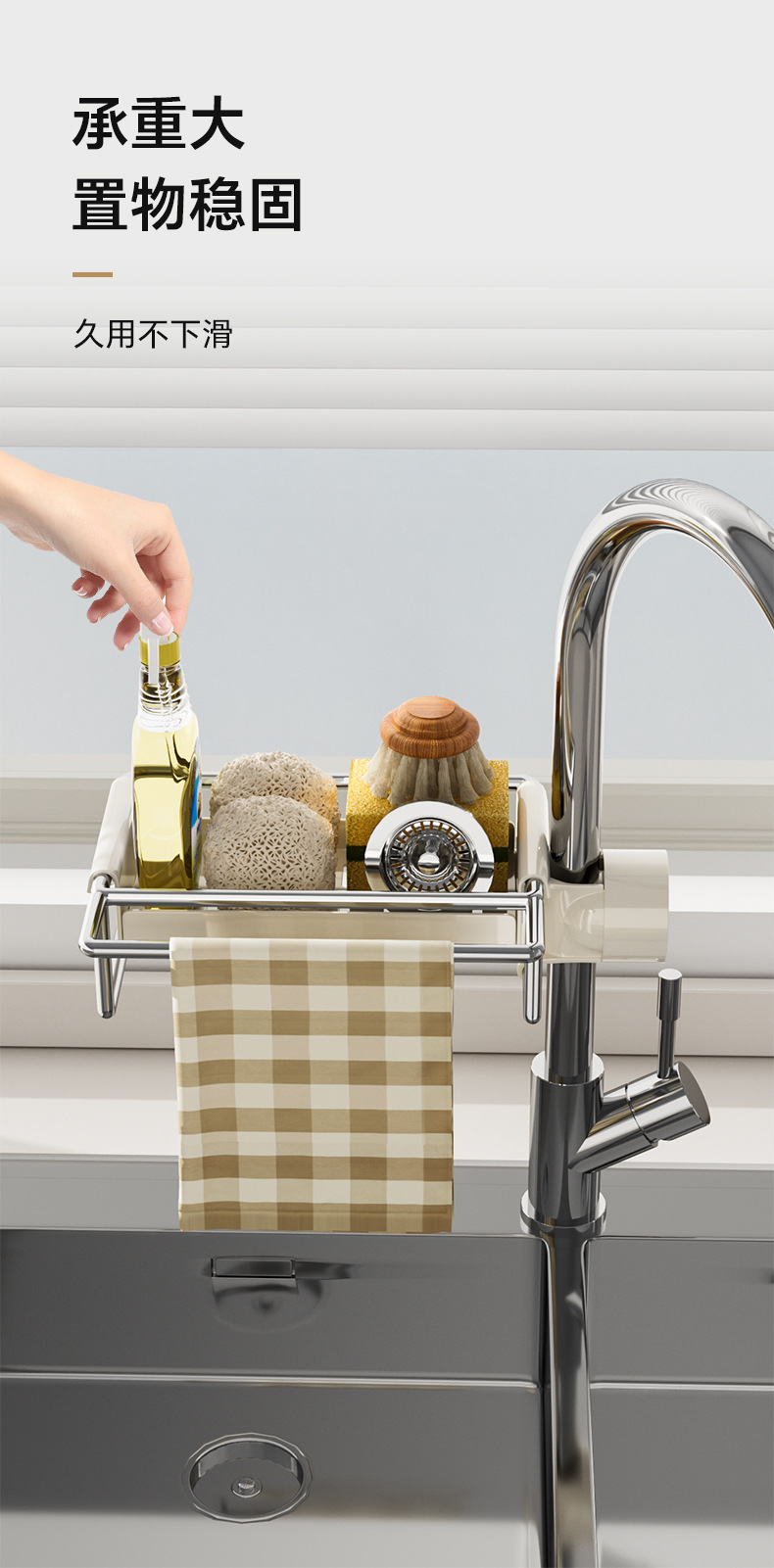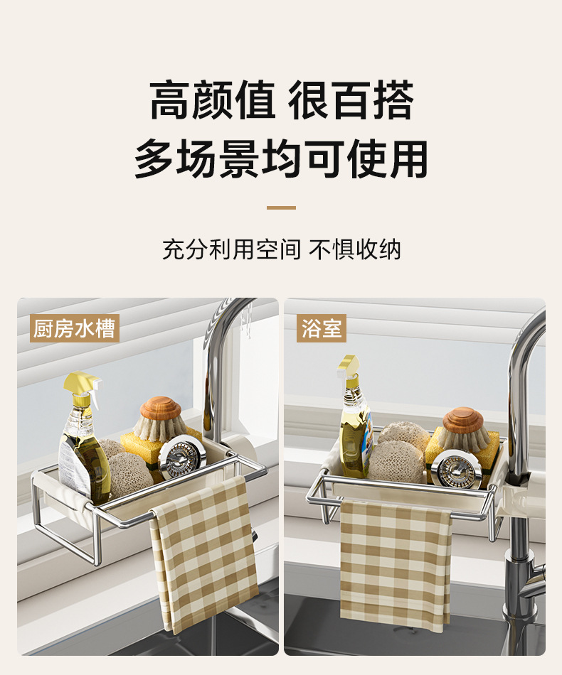 【水龙头置物架】1.洁具收纳 巧用水龙头空间 2.镂空沥水 通风防潮 3.一体式毛巾杆使用更便捷 4.承重大 置物稳固 5.不锈钢边框材质 实心钣金底板+高温烤漆工艺 6.牢固卡扣 自由调节 可拆卸