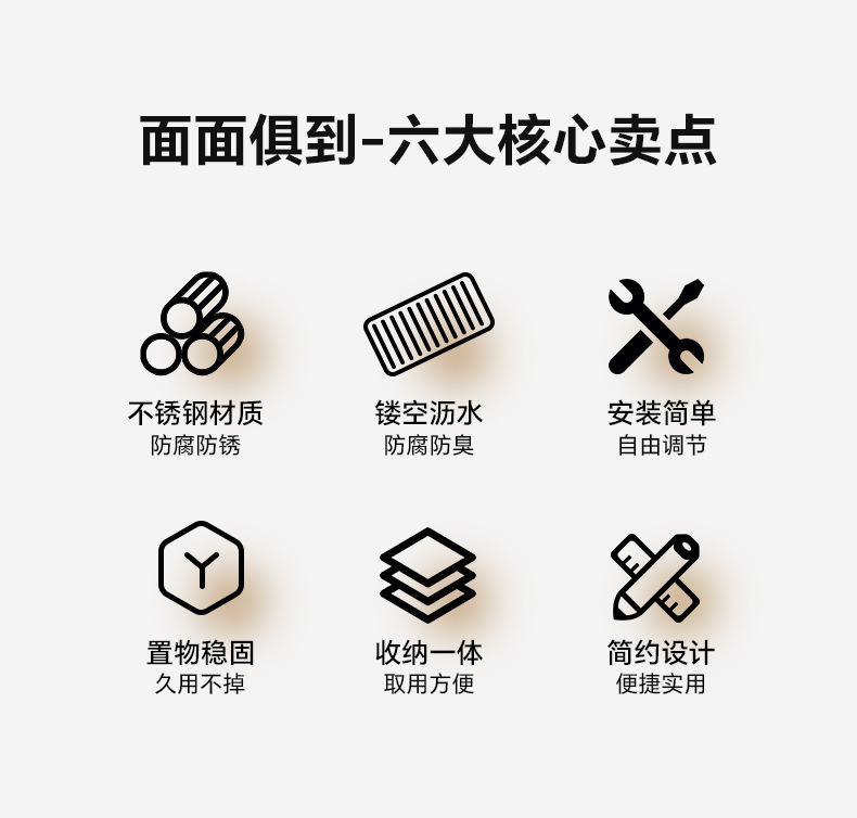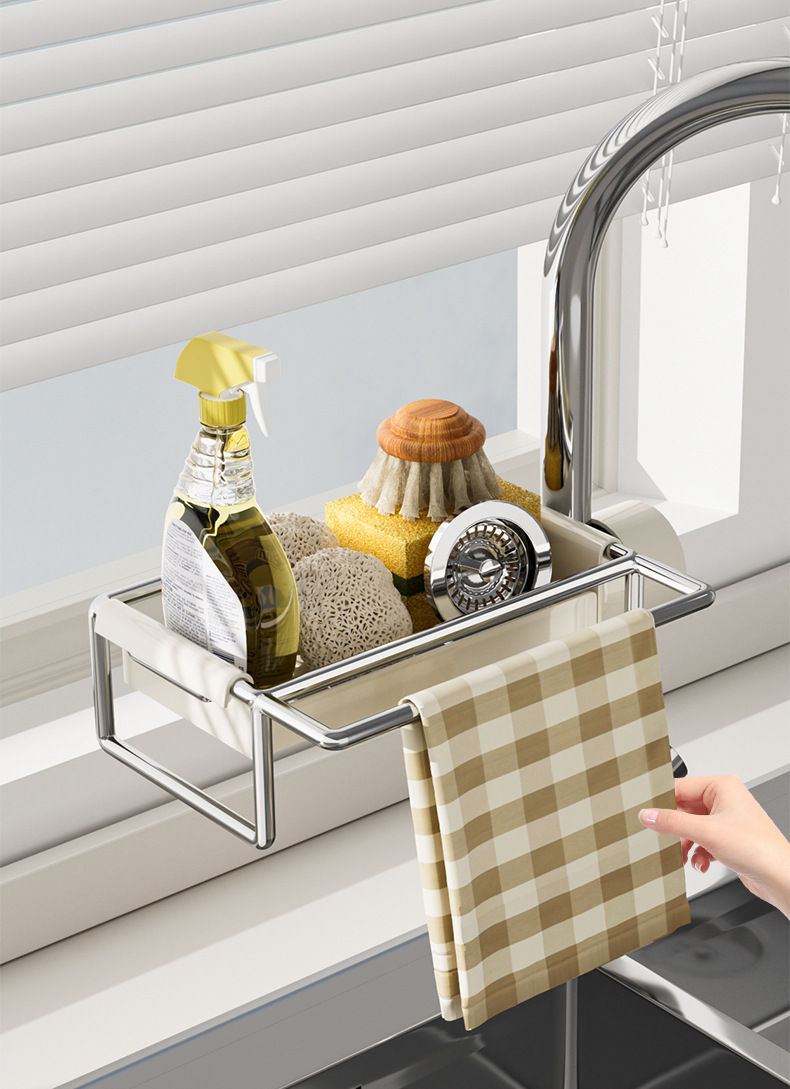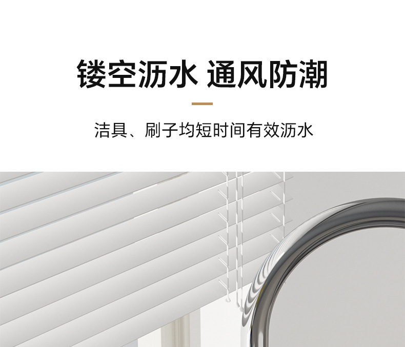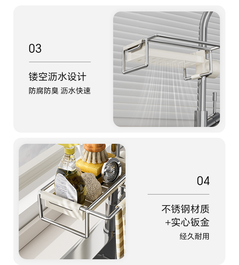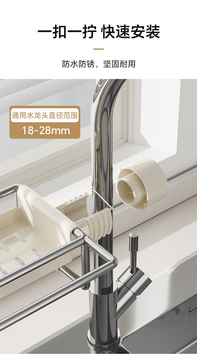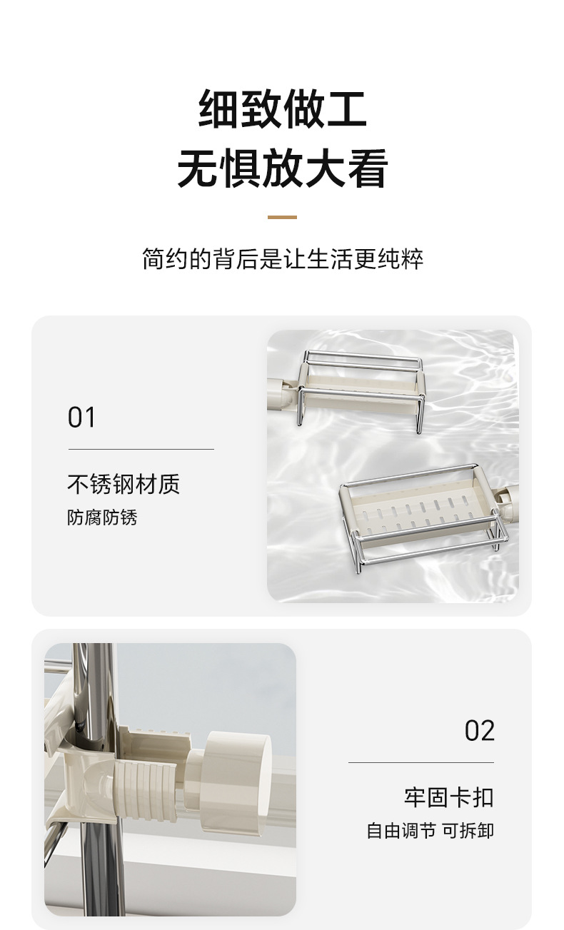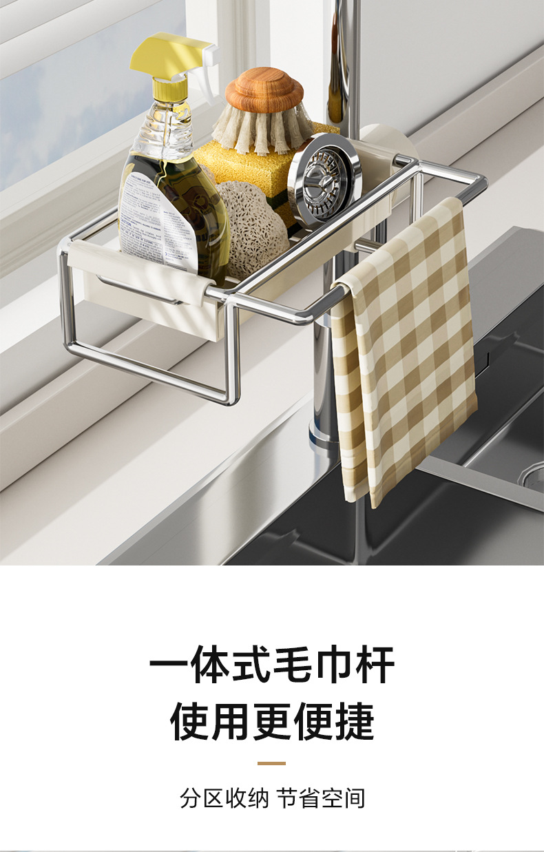 【水龙头置物架】1.洁具收纳 巧用水龙头空间 2.镂空沥水 通风防潮 3.一体式毛巾杆使用更便捷 4.承重大 置物稳固 5.不锈钢边框材质 实心钣金底板+高温烤漆工艺 6.牢固卡扣 自由调节 可拆卸