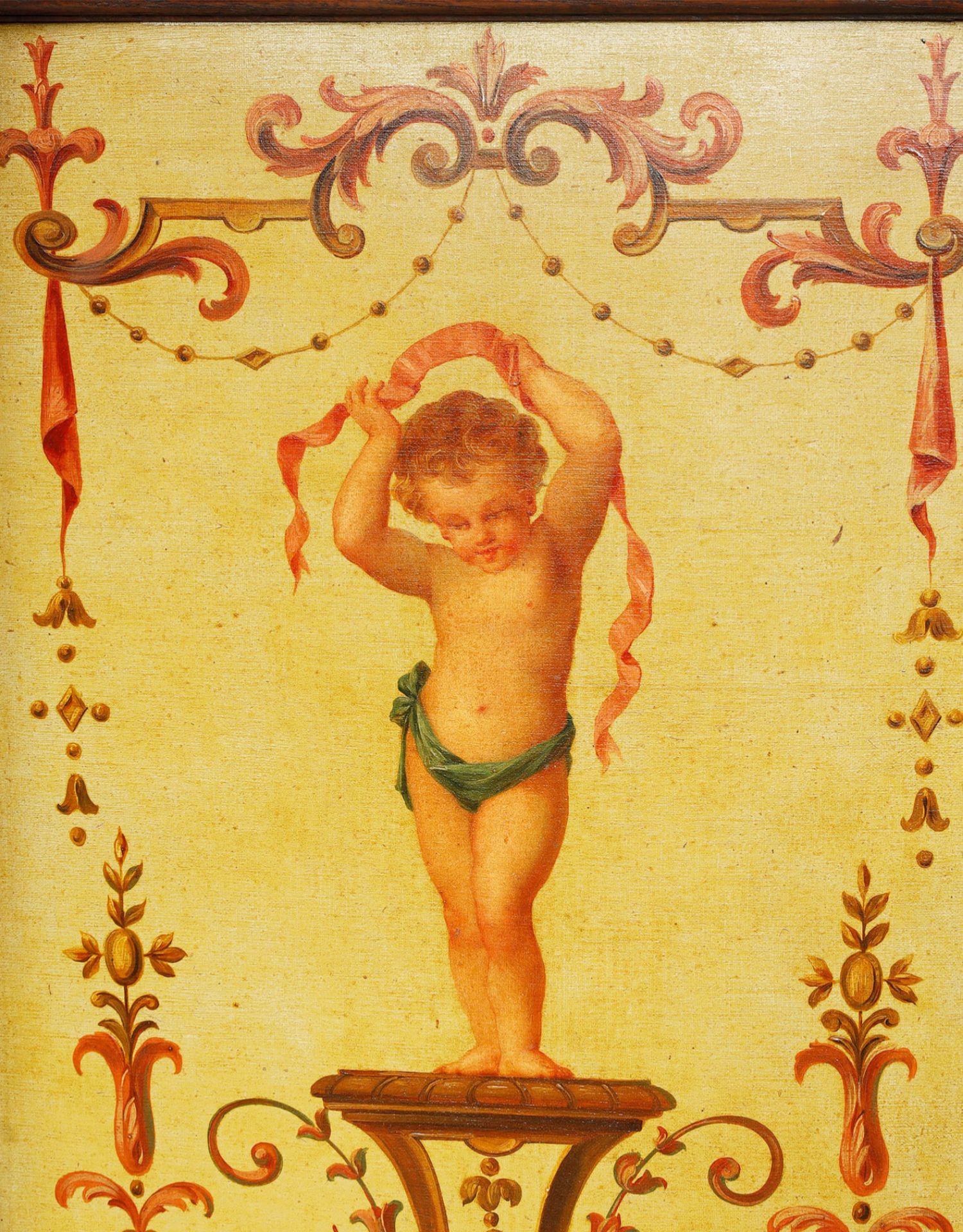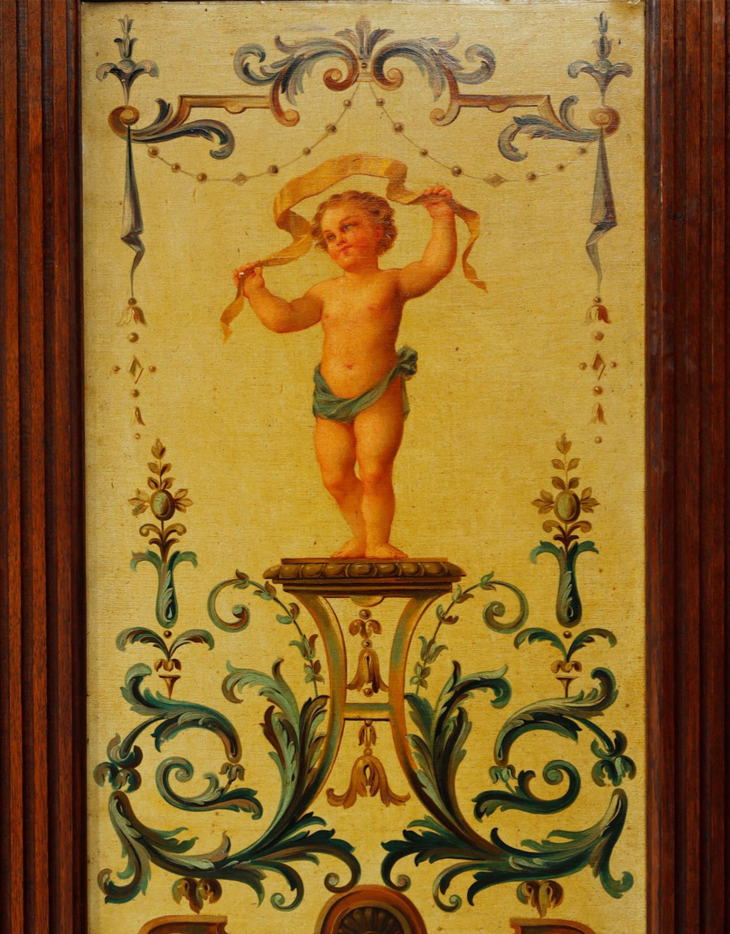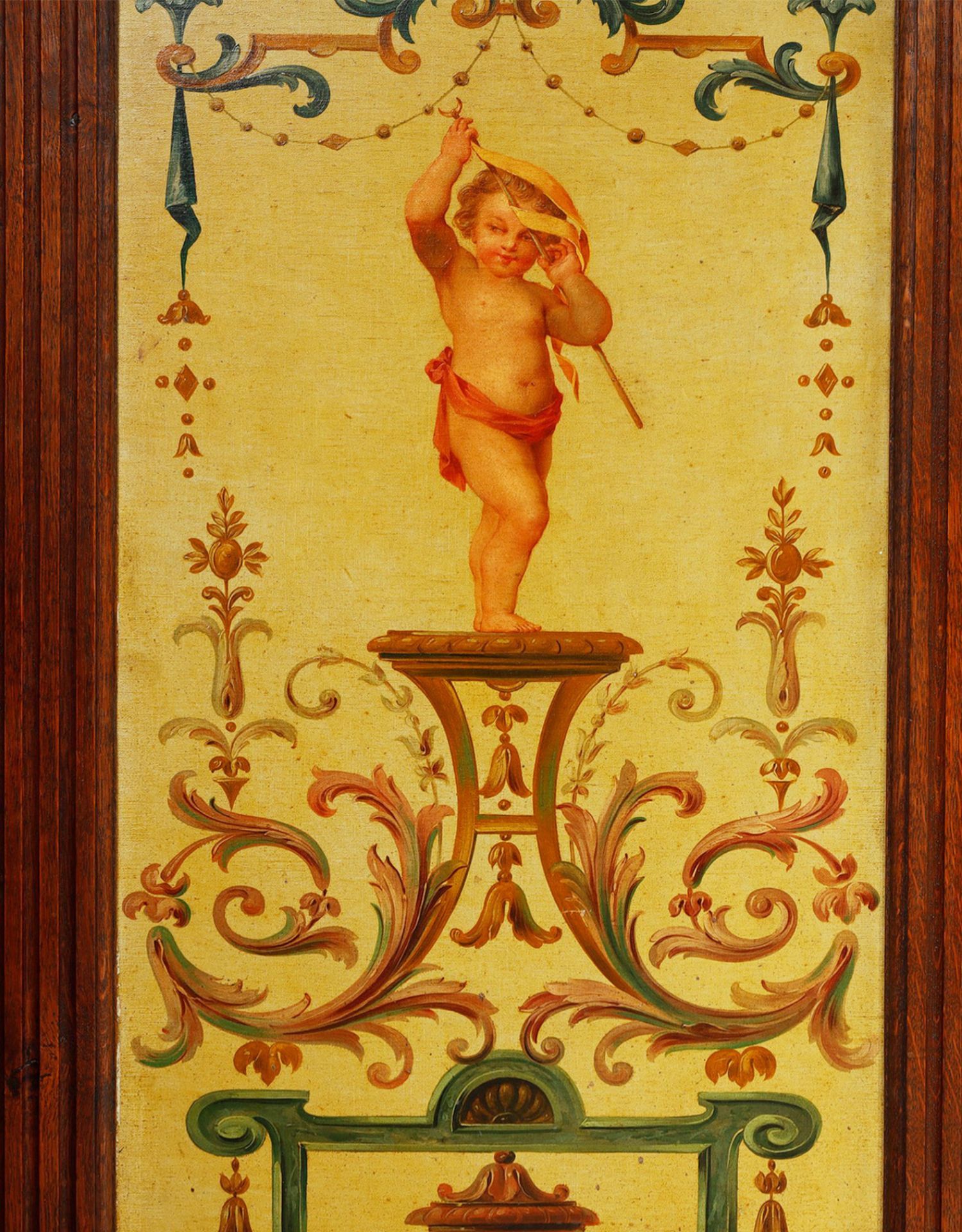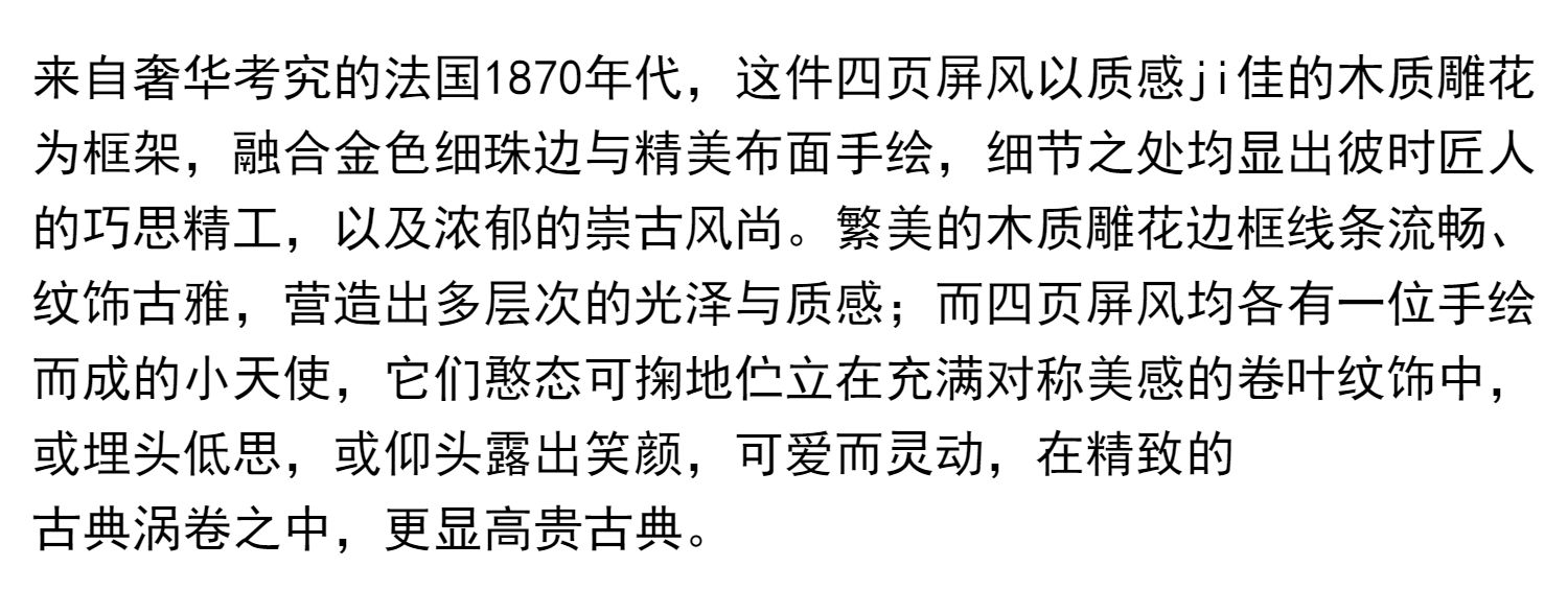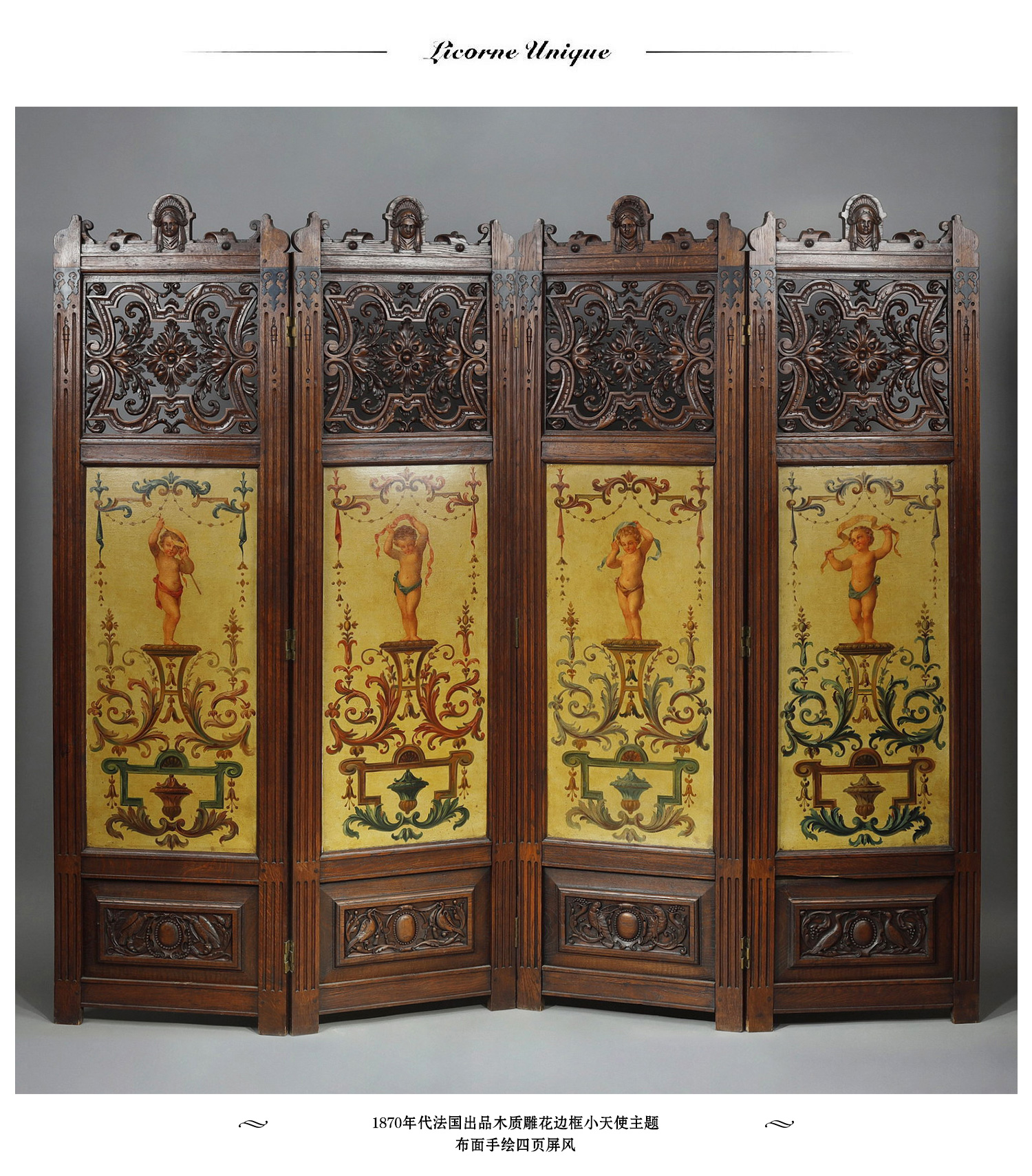 独角鹿西洋古董法国木质雕花边框小天使主题布面手绘四页插屏屏风