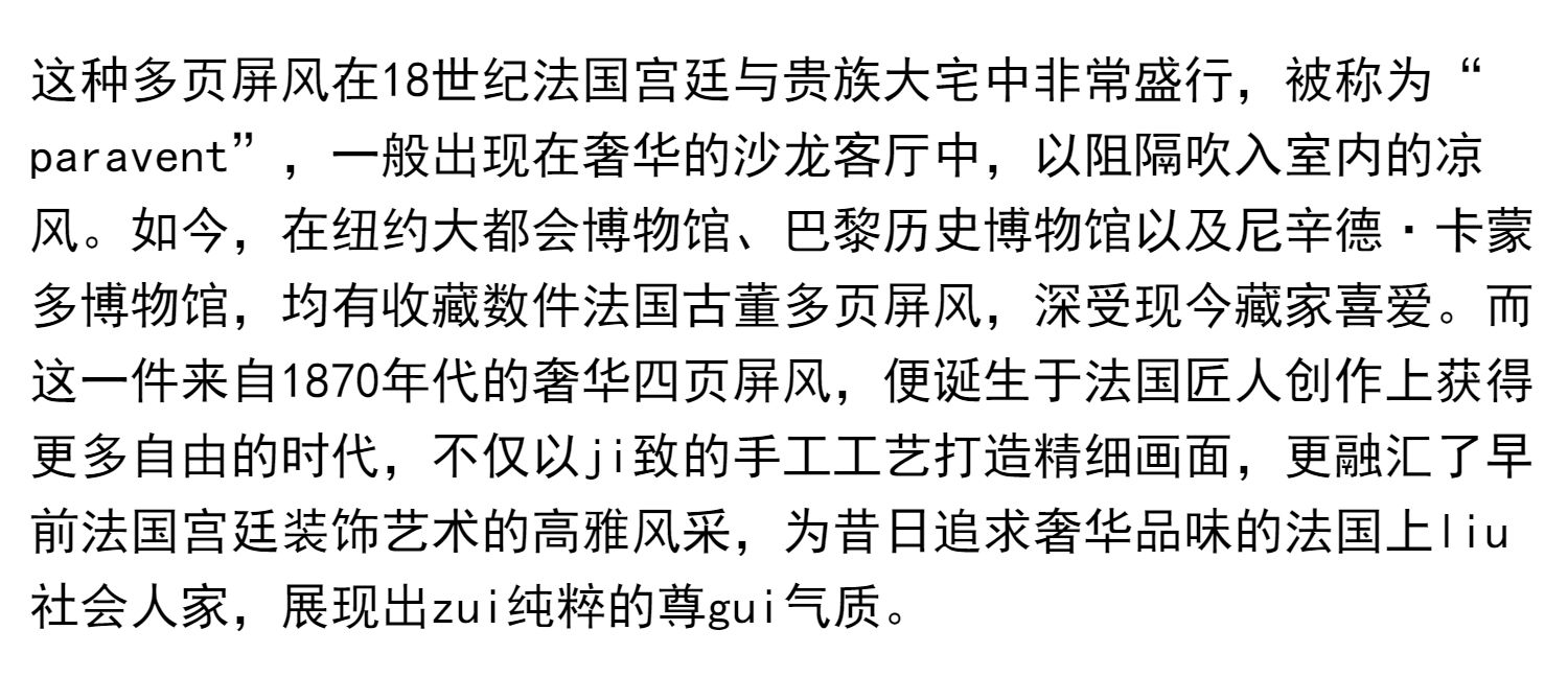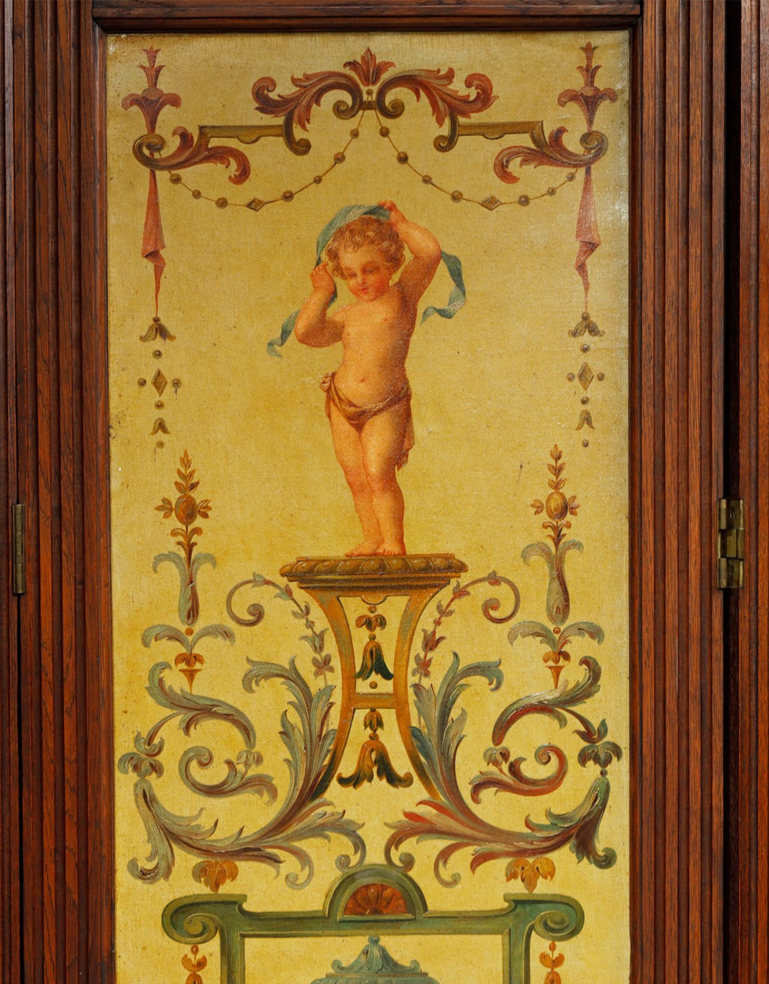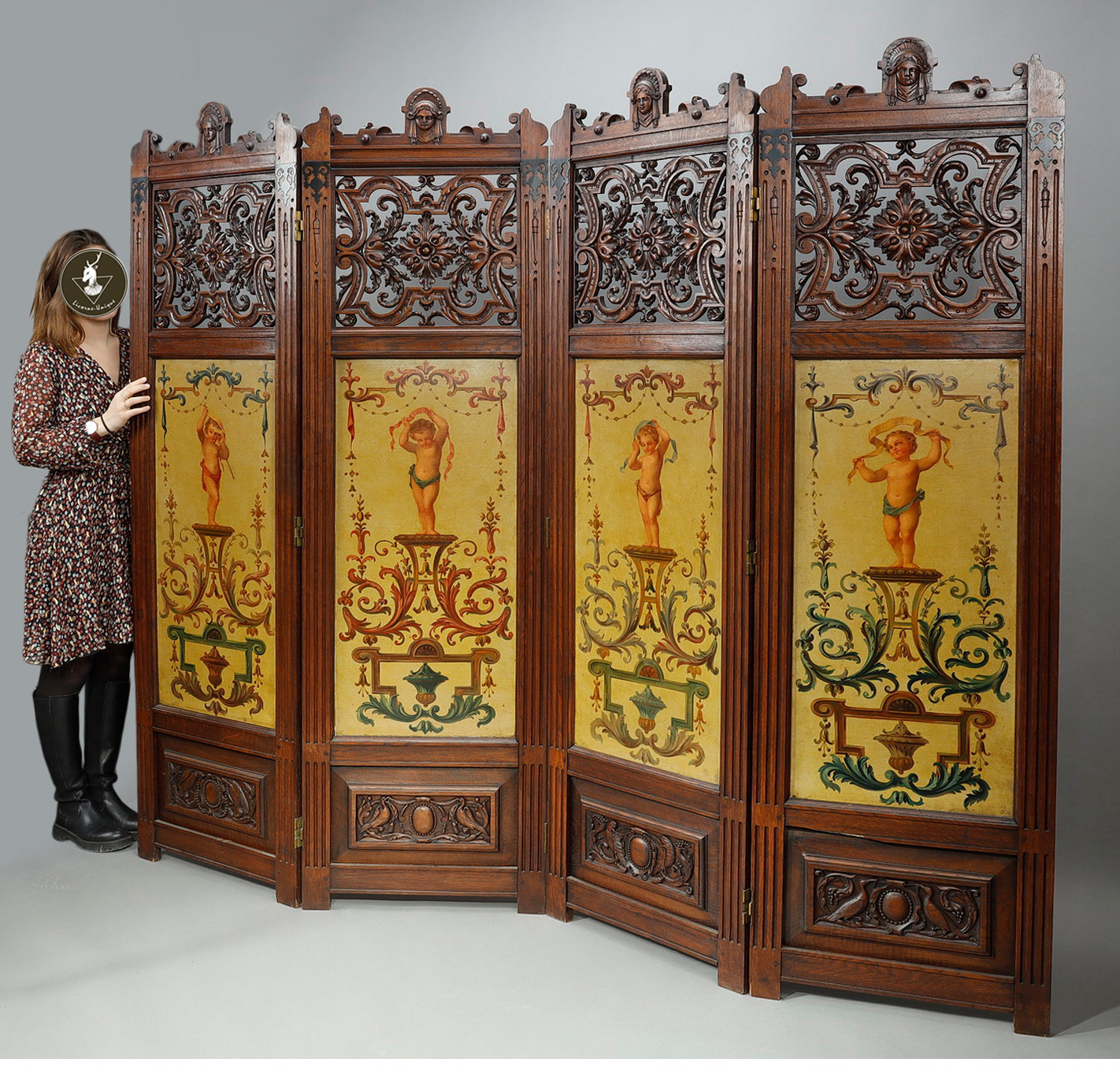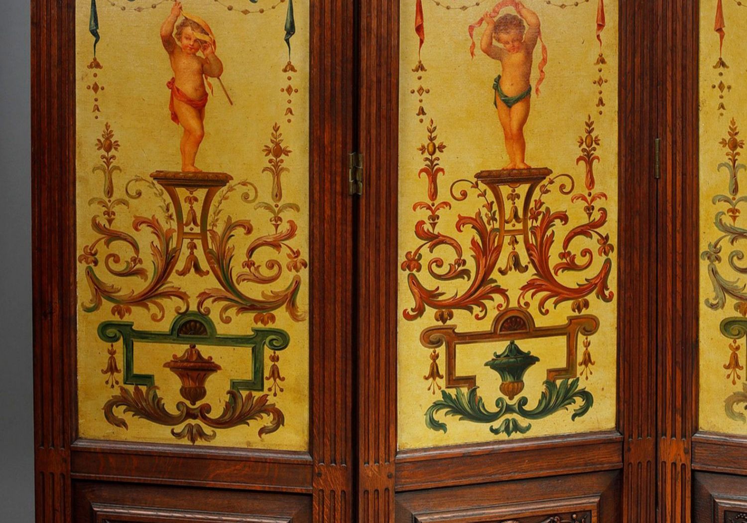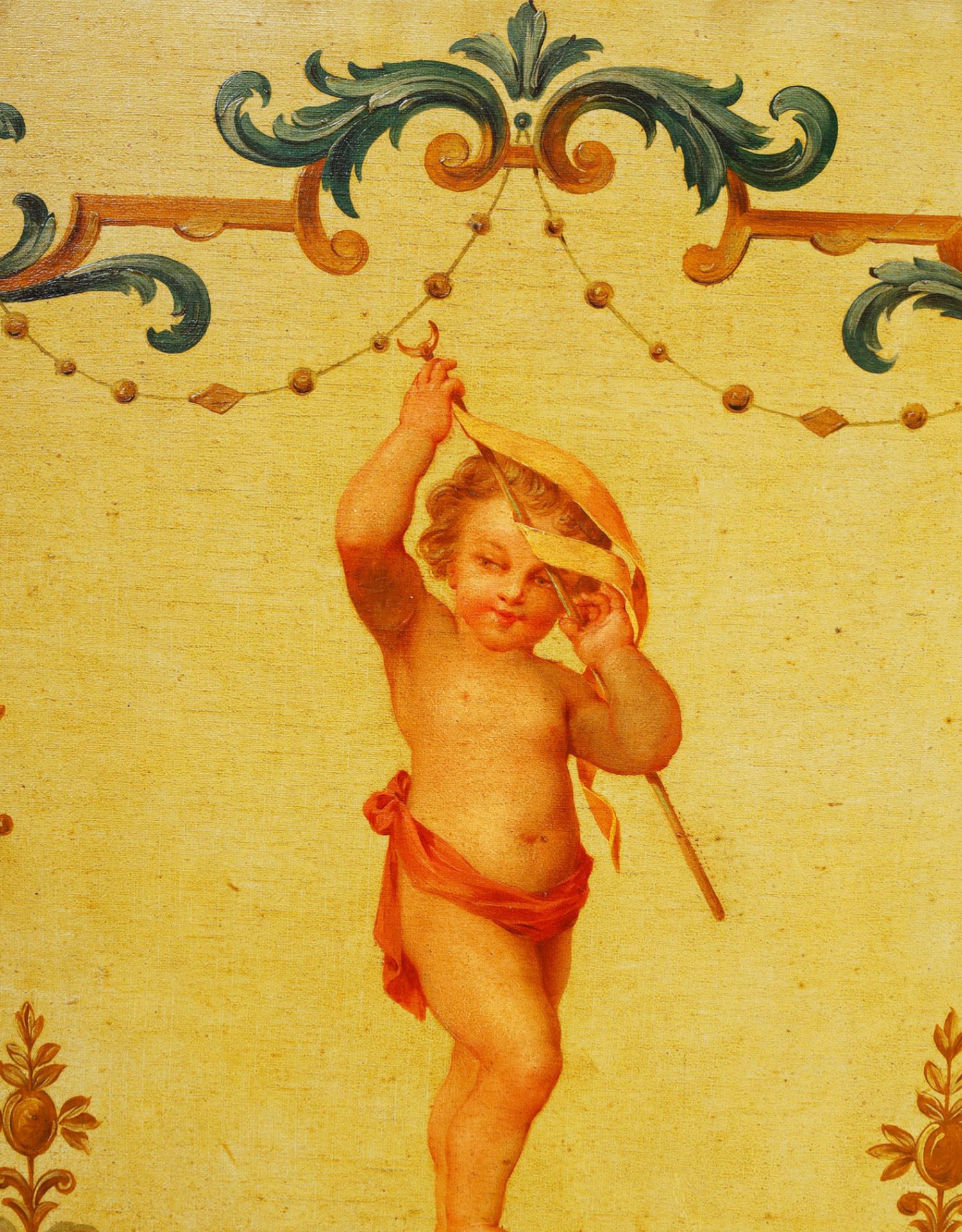 独角鹿西洋古董法国木质雕花边框小天使主题布面手绘四页插屏屏风