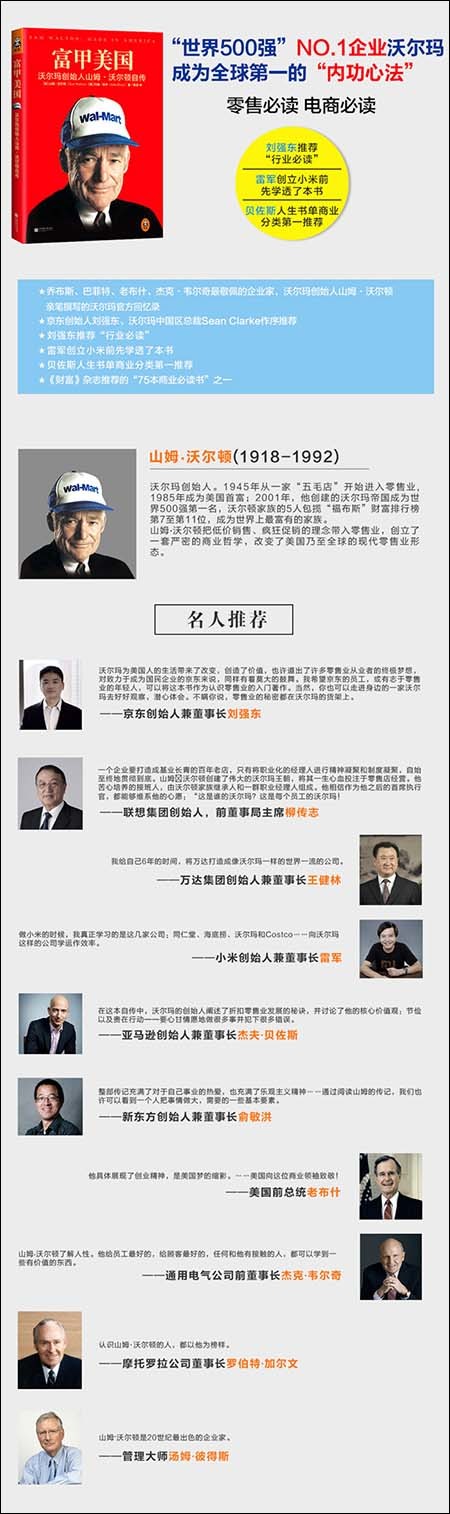 JD创始人刘强东亲自作序推荐,电商必读!零售必读!雷军创立小米之前先学透本书!新东方创始人俞敏洪专文推荐!想要真正学习沃尔玛的创业精髓,你只需要阅读这1本书即可。《财富》杂志推荐的“75本商业必读书”之一。世界500强冠军的企业创始人亲自解密自己的创业历程。乔布斯、巴菲特、老布什、杰克•韦尔奇最敬佩的企业家之一,沃尔玛创始人唯 一亲笔撰述的回忆录,真正了解沃尔玛精神和运作模式的最权威著作。沃尔玛年营业额超过5000亿美元,超越了电信、能源、金融行业的巨头,成为人类历史上最庞大、最有权力的企业。