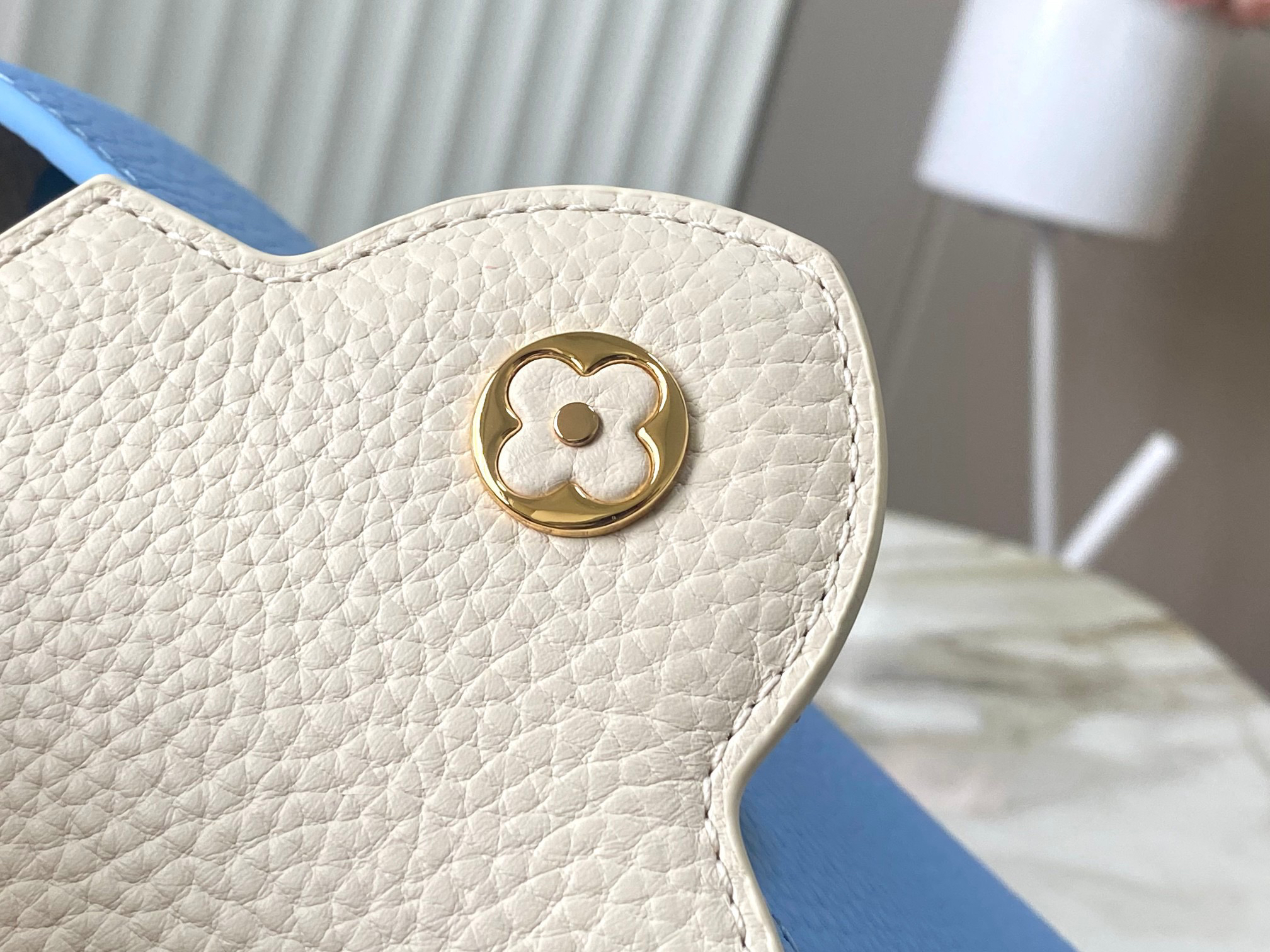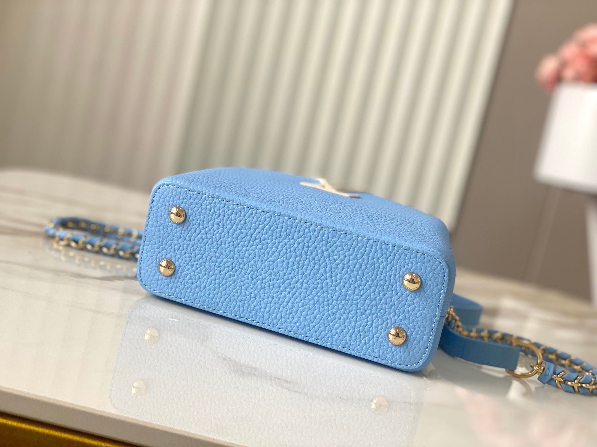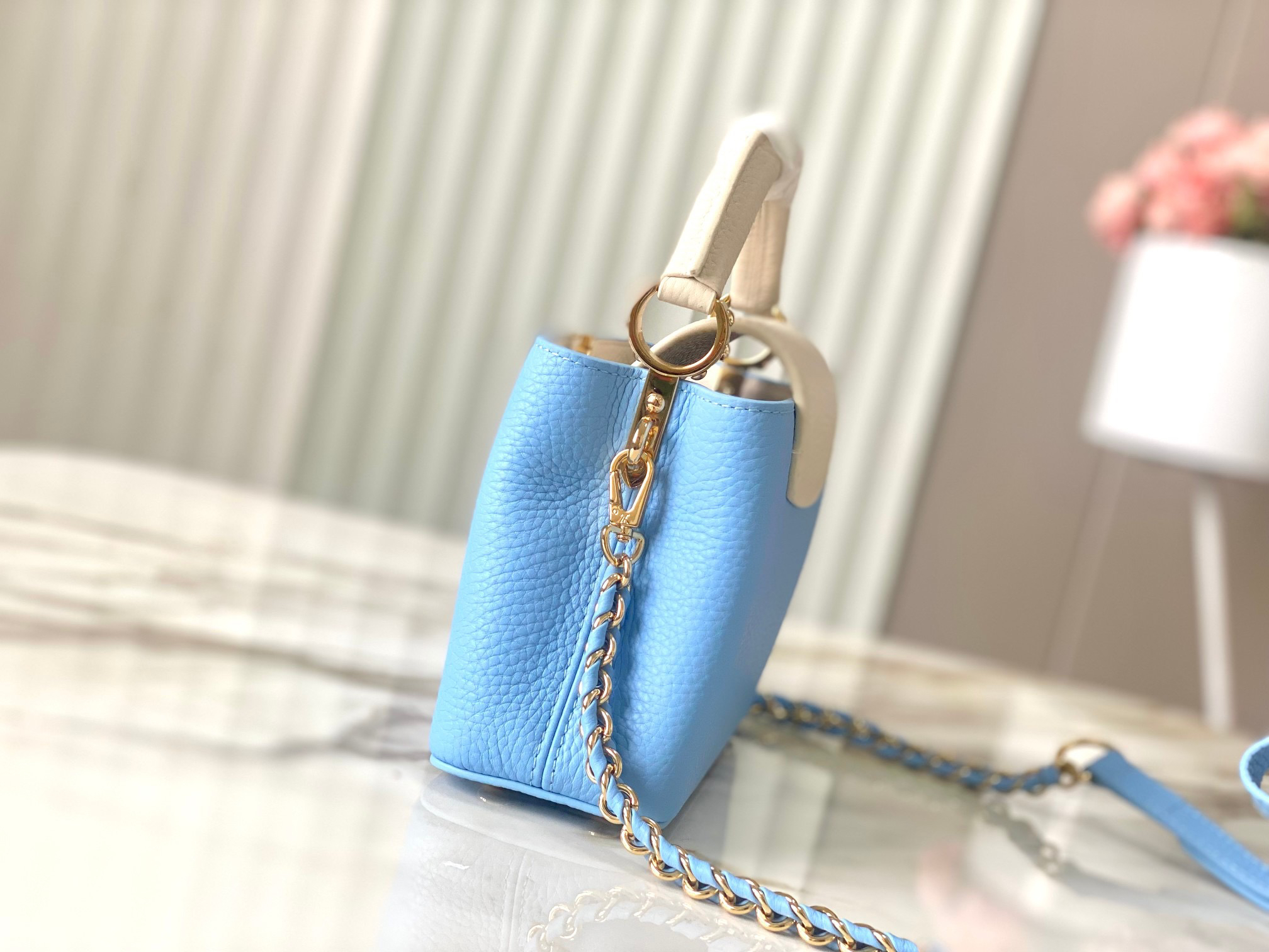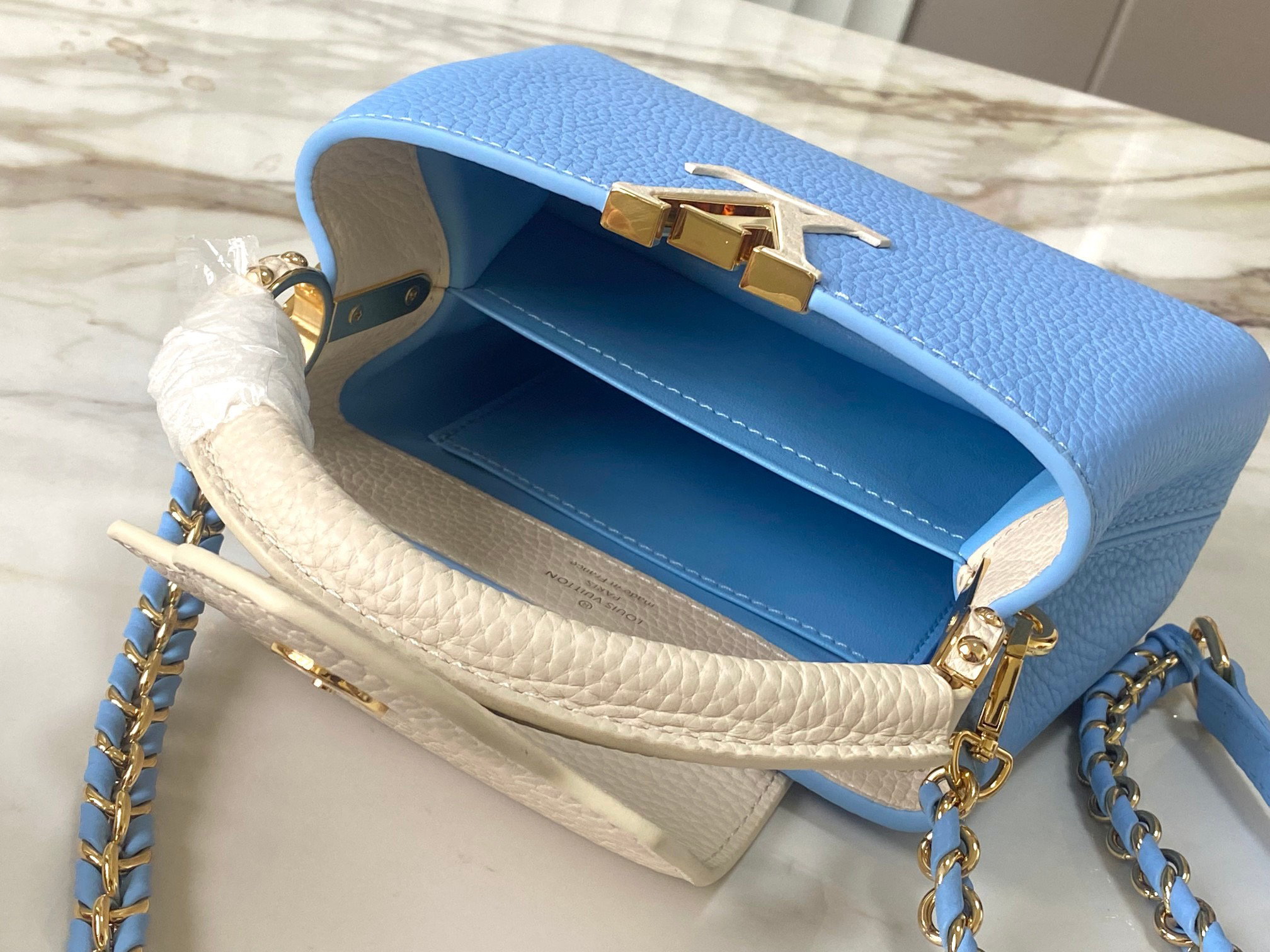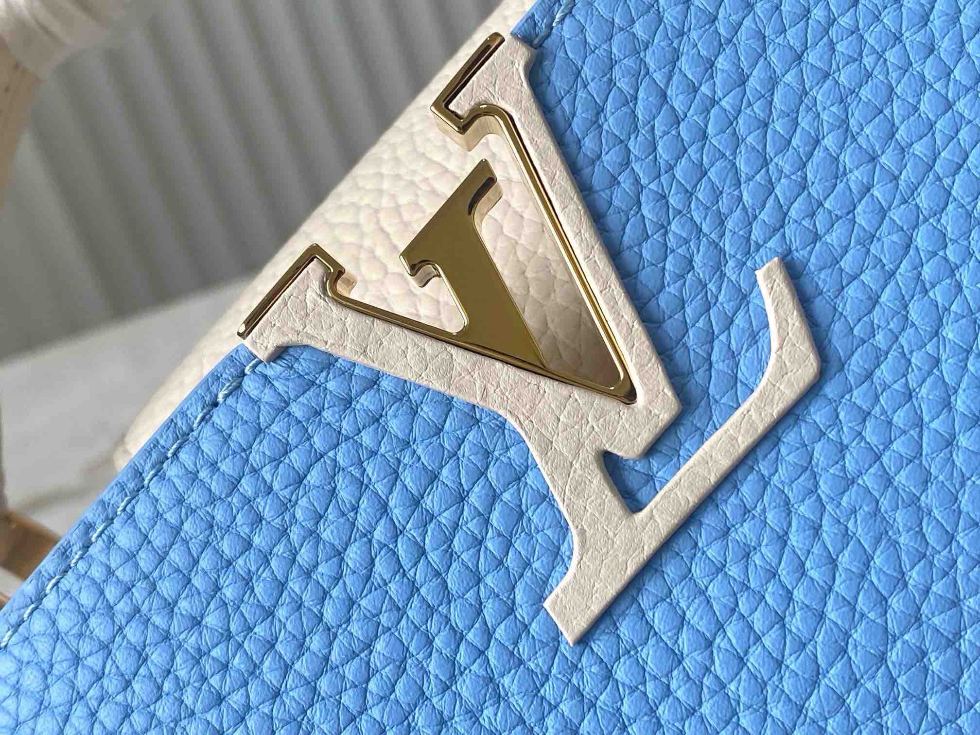 秋冬特惠💰1530 渠道级LV 新品 te级LV 全套包装 M21887/M48865蓝拼白链条款 此款Taurilon皮革版Capucines 手袋呈现柔美清新的色调 令人眼前一亮 除了标志性的ding都皮革手柄 另配可脱卸、可调节编结皮革链式包带 便于肩背或斜挎 包内设有隔层和拉链口袋 可存放贵重物品 Size:21 * 14 * 8 cm