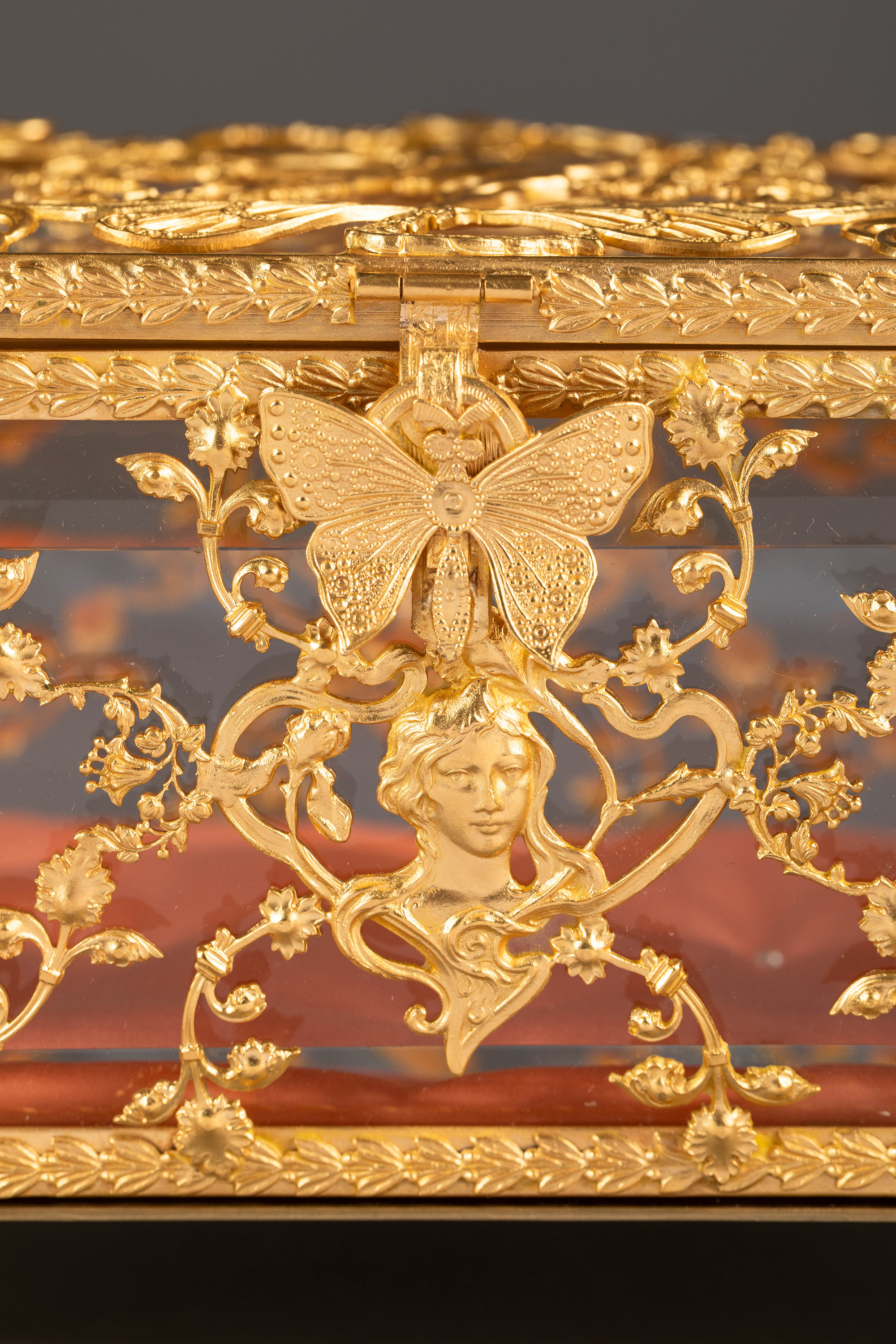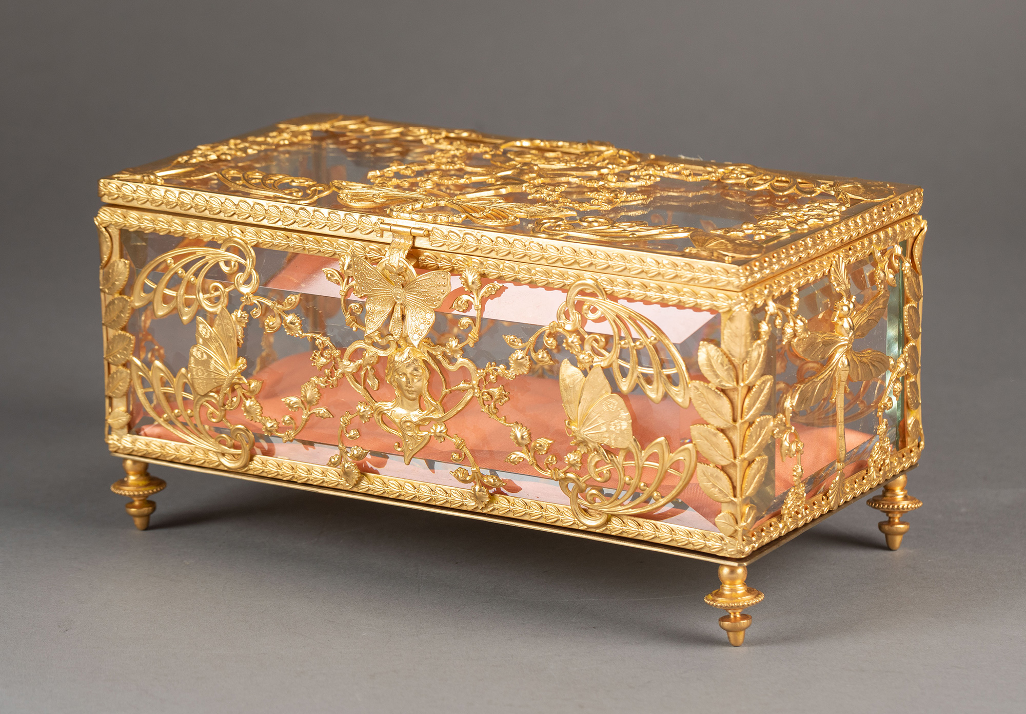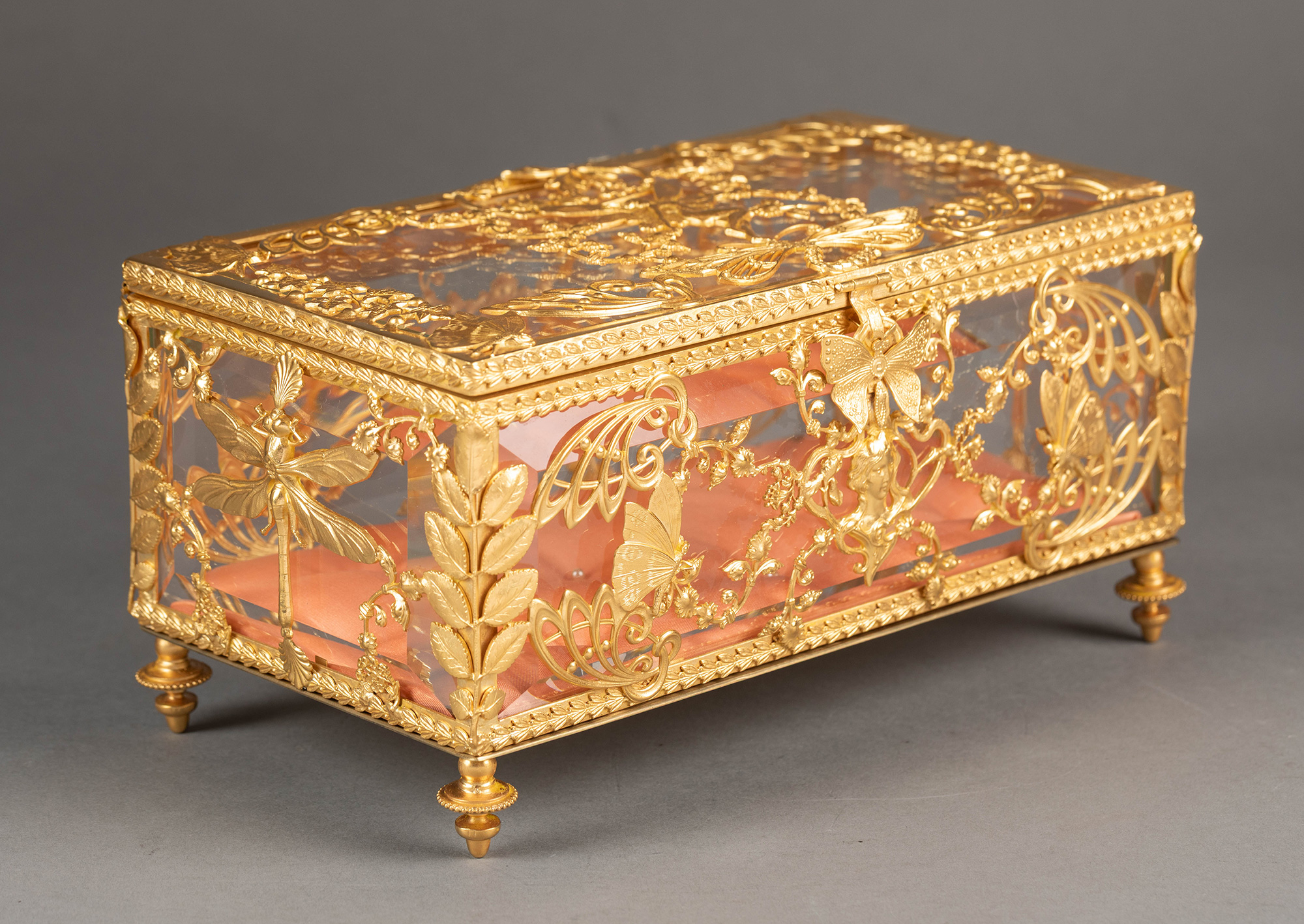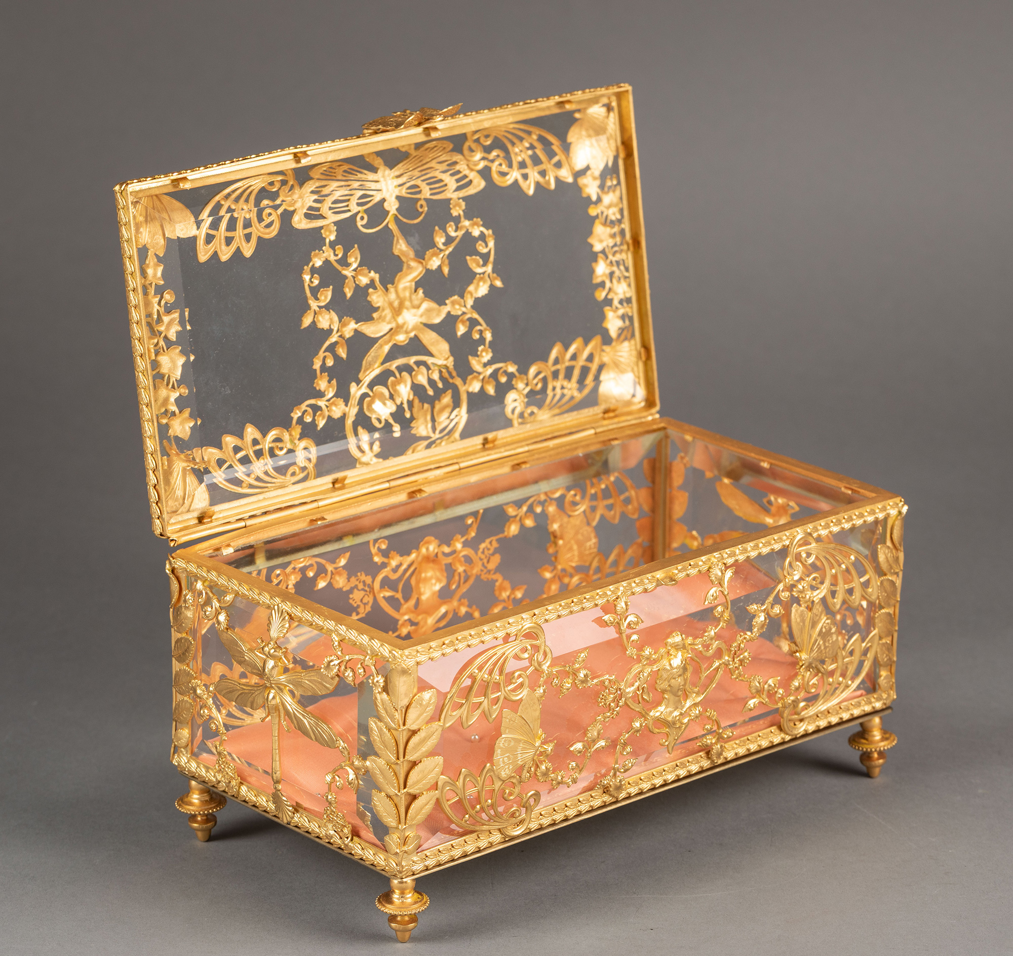 20世纪初法国出品新艺术风格蝴蝶花卉主题铜鎏金精雕嵌透明水晶珍宝盒