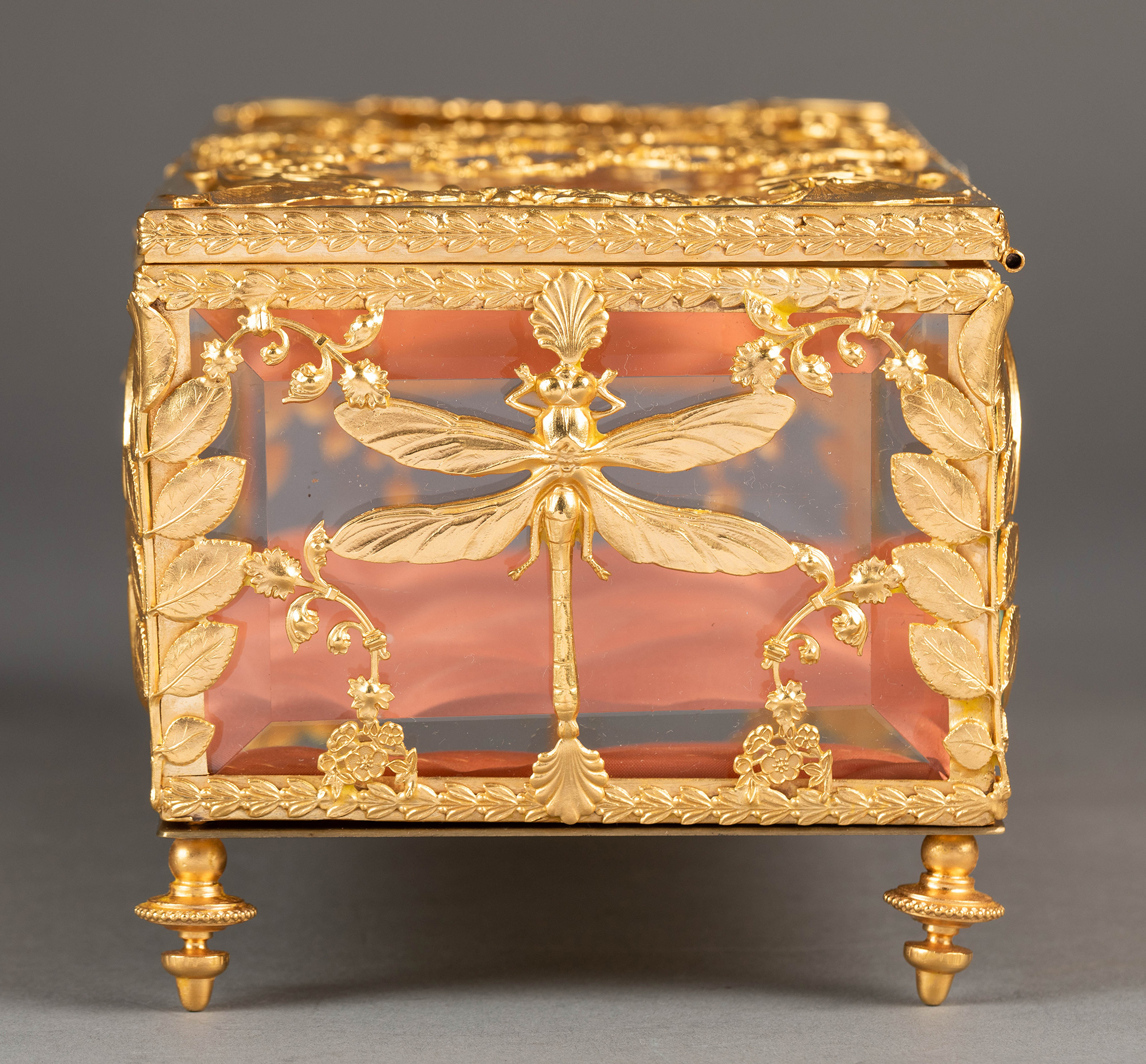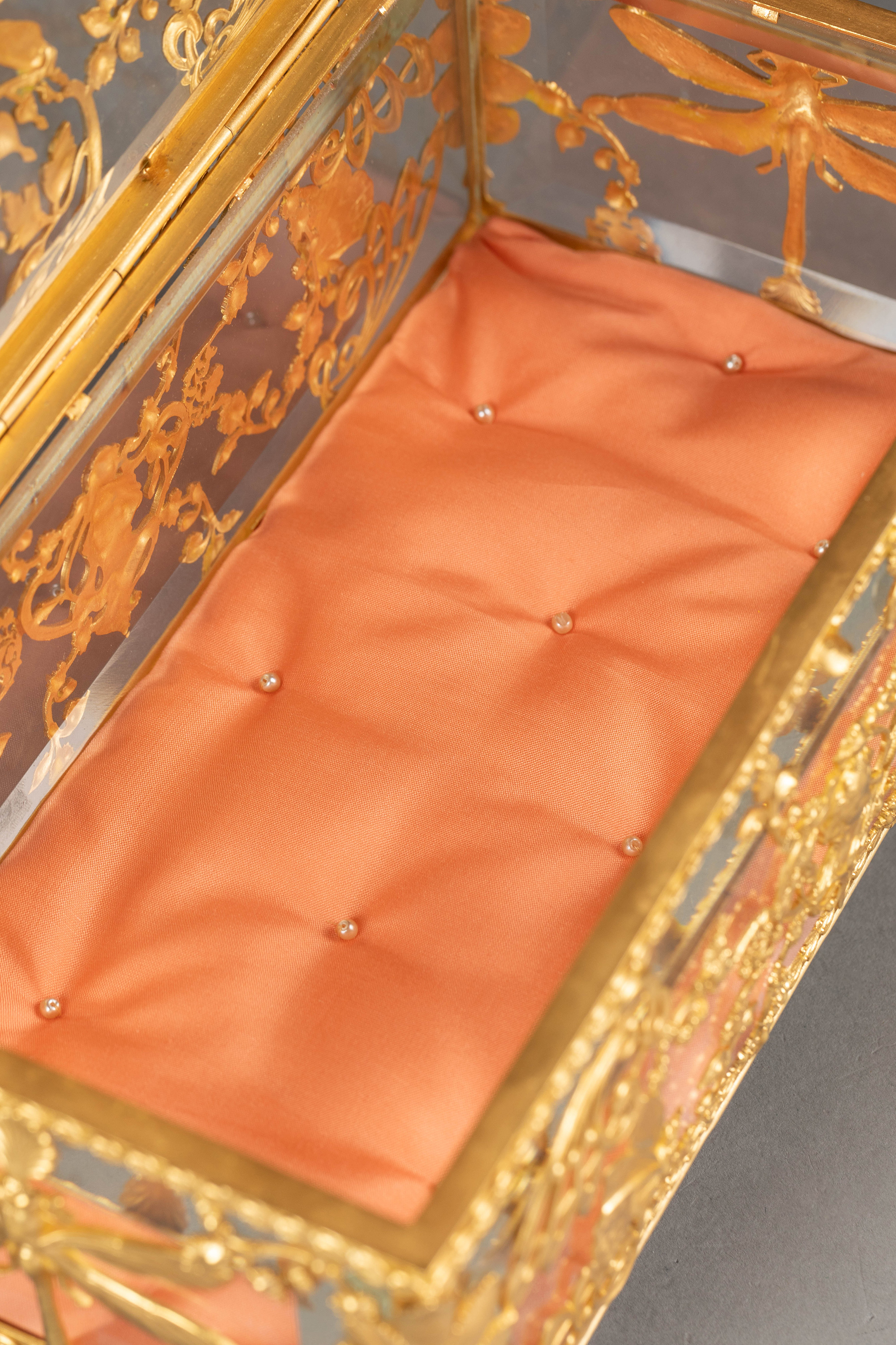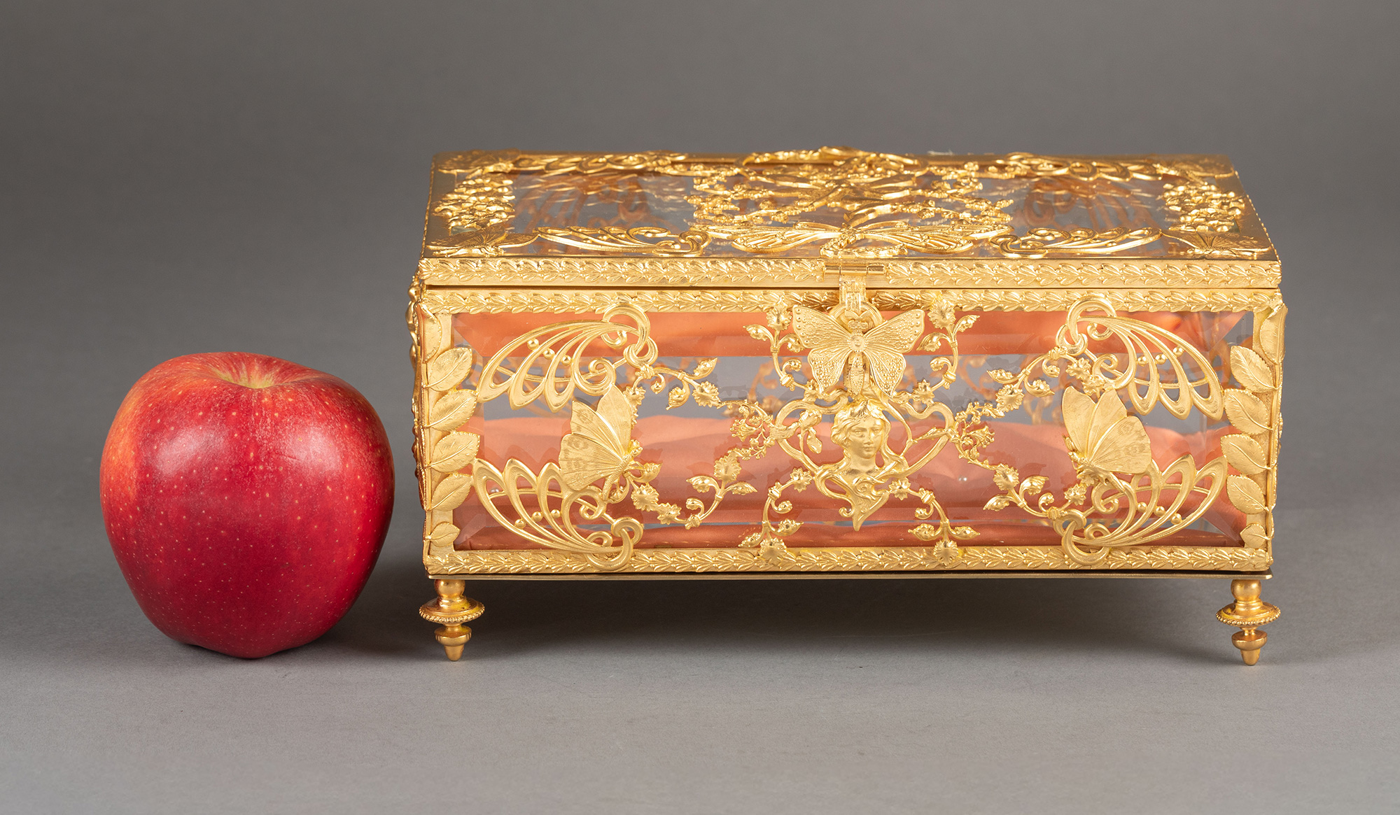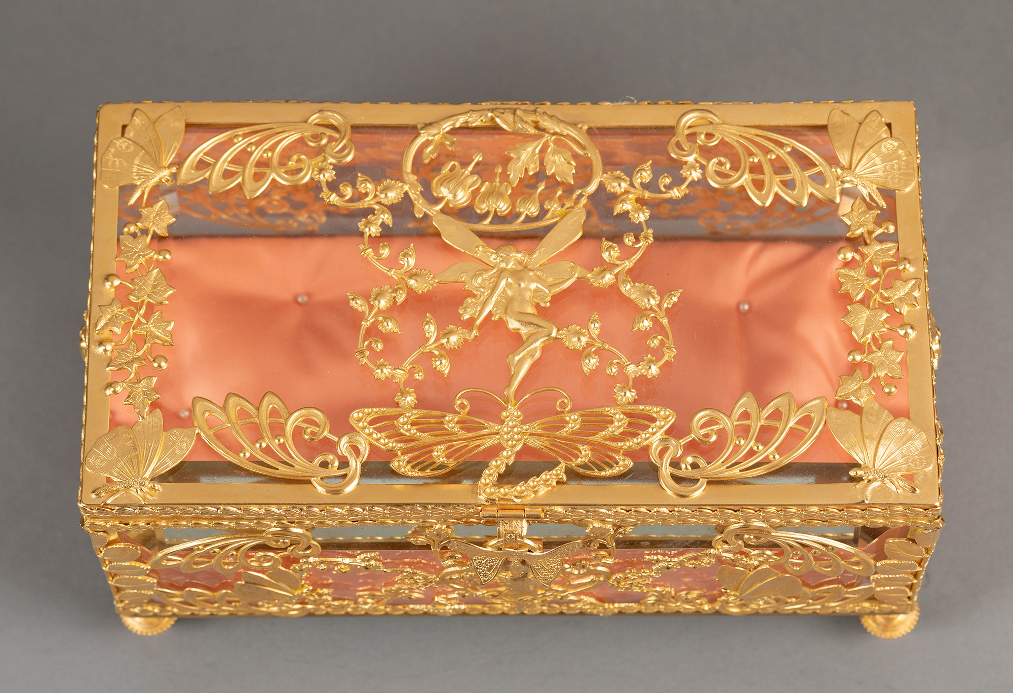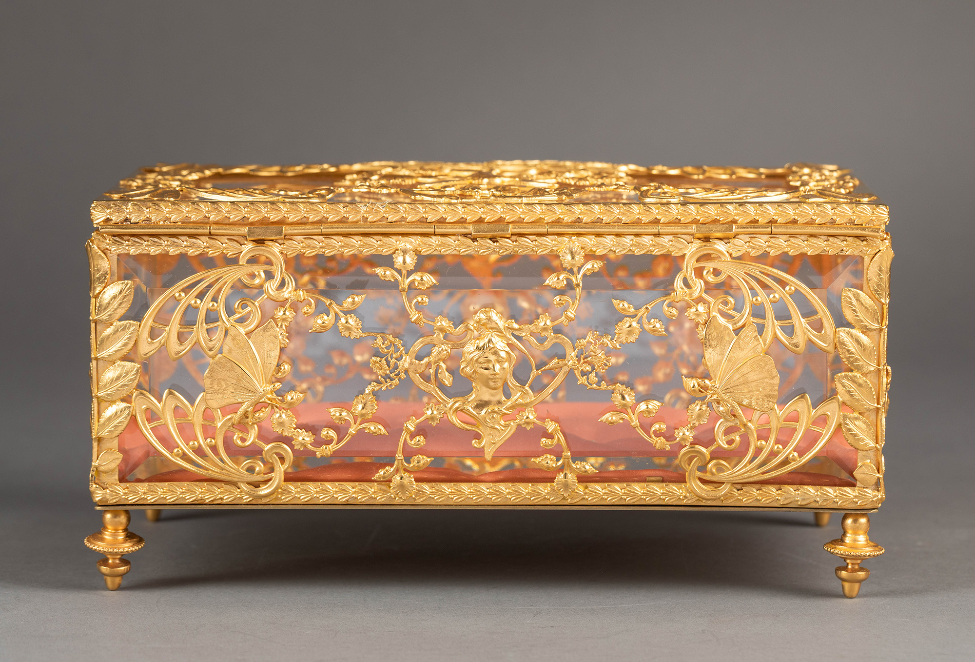 20世纪初法国出品新艺术风格蝴蝶花卉主题铜鎏金精雕嵌透明水晶珍宝盒