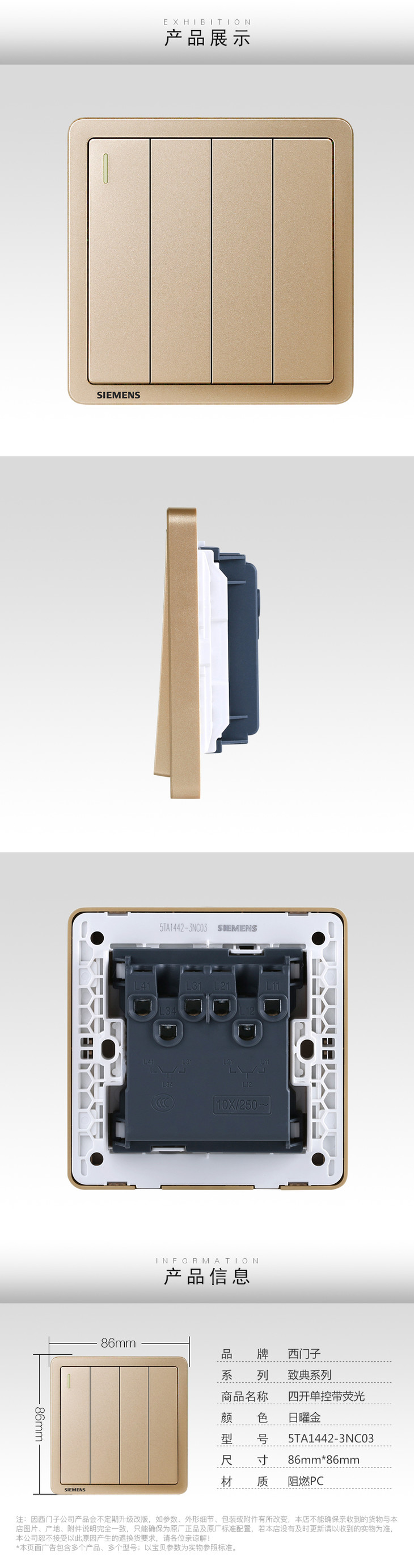西门子开关插座面板致典日曜金四开单控开关带荧光