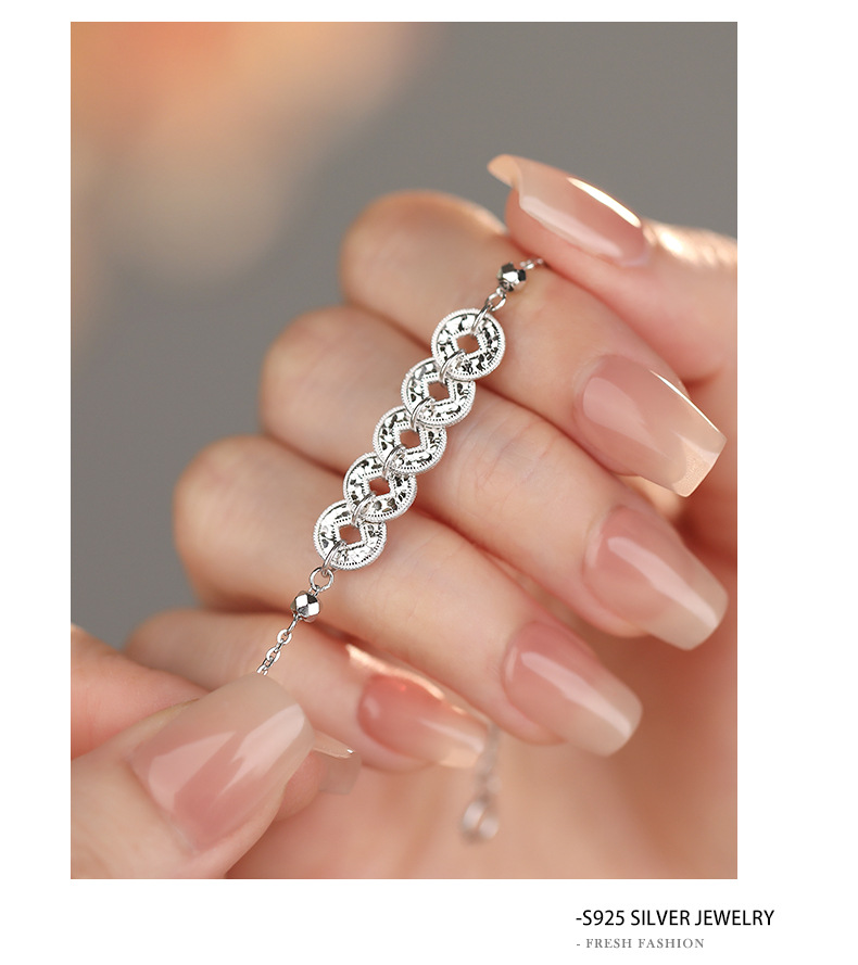 【招财进宝】925纯银镀18K金五帝钱流苏金币手链【YXS-L977】