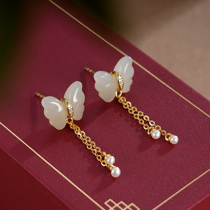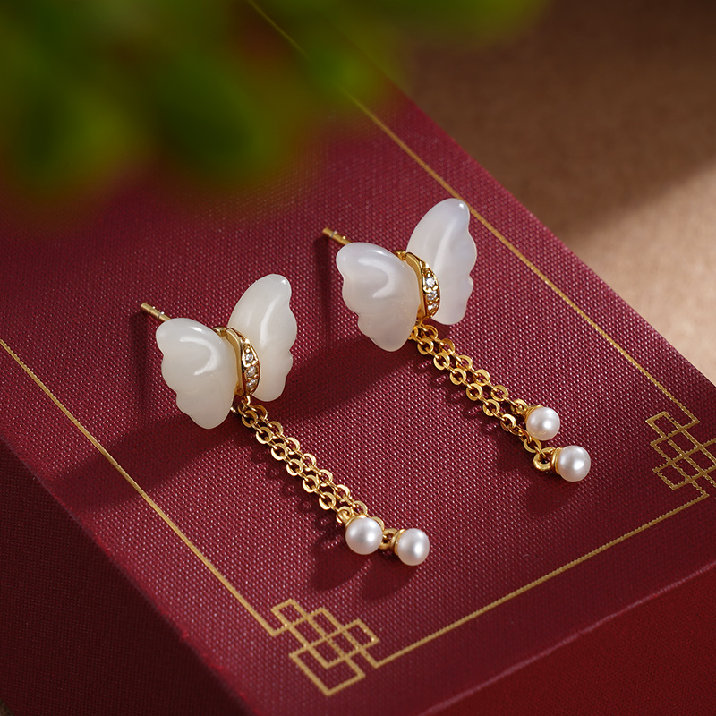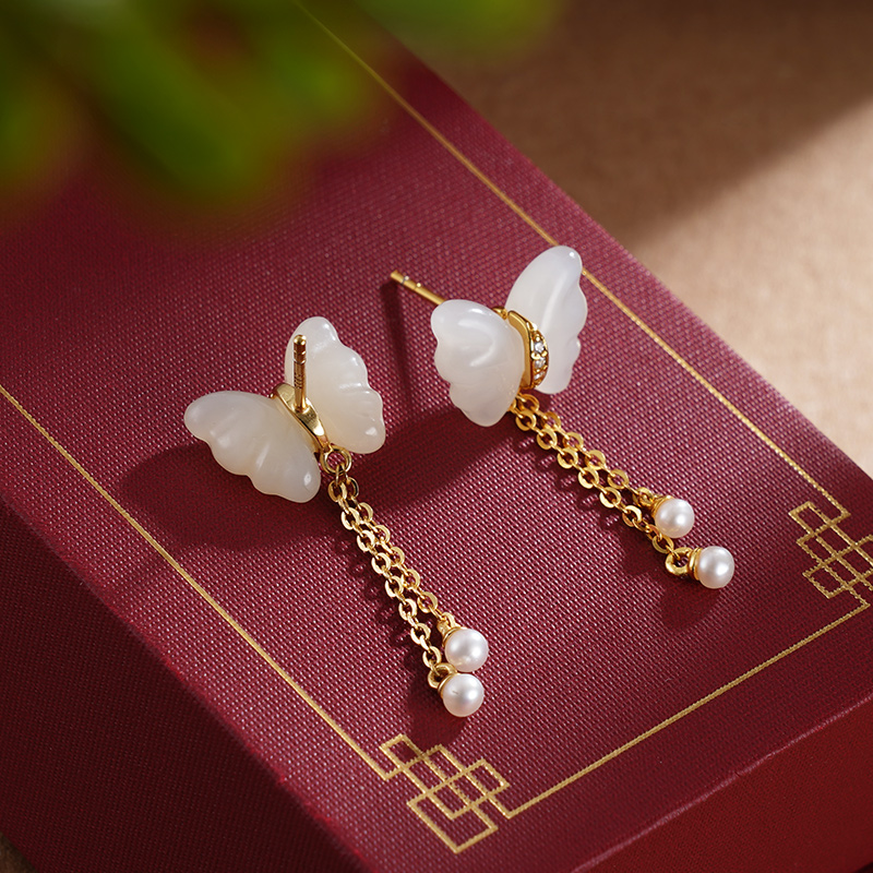 子佩集S925银【映蝶】耳钉【ED02883】纯银古法银和田玉蝴蝶镀金2405