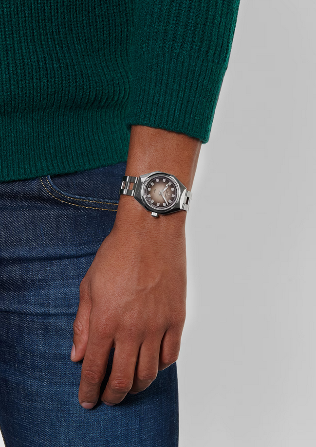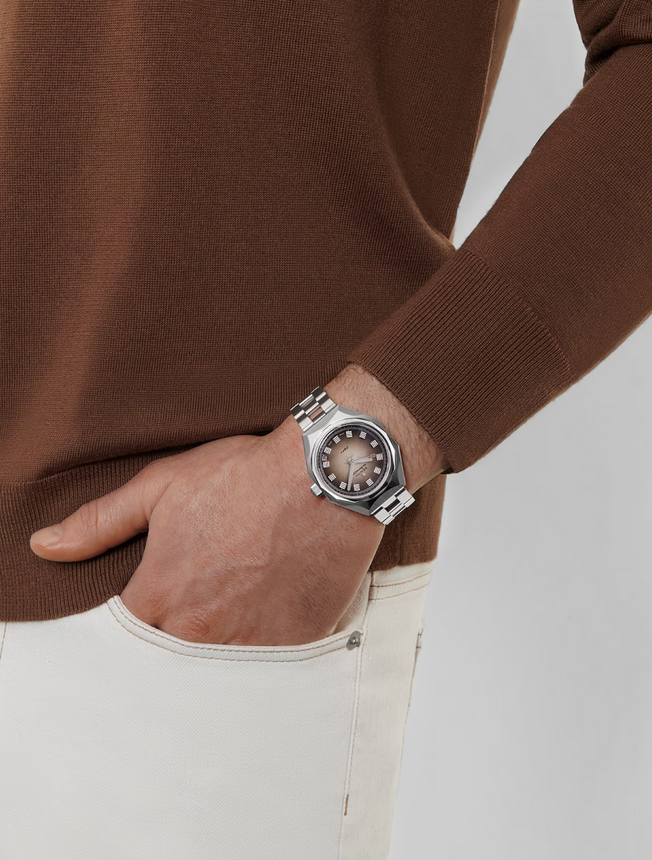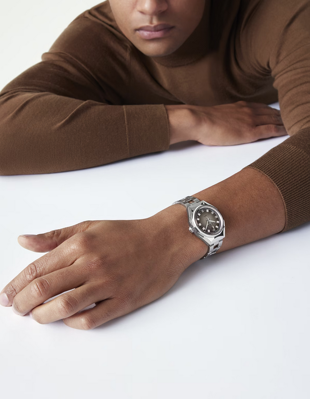 镜面 材质 | 蓝宝石水晶玻璃 | 表盘 | 八角形精钢表壳和十四边形表圈 渐变棕色表盘; 日期显示 背透 |