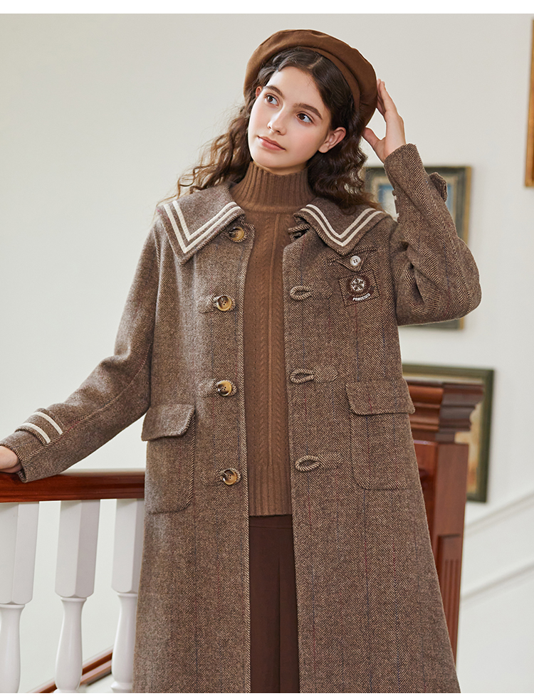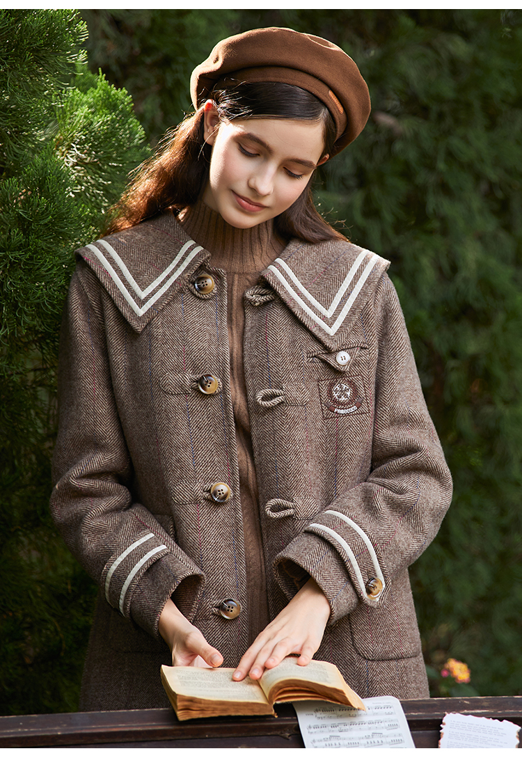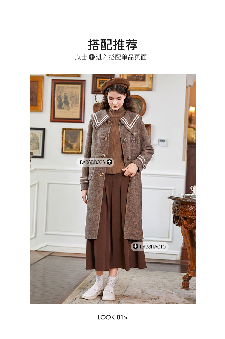 Famecoco学院风海军领刺绣双面呢大衣女冬FAB8AR031