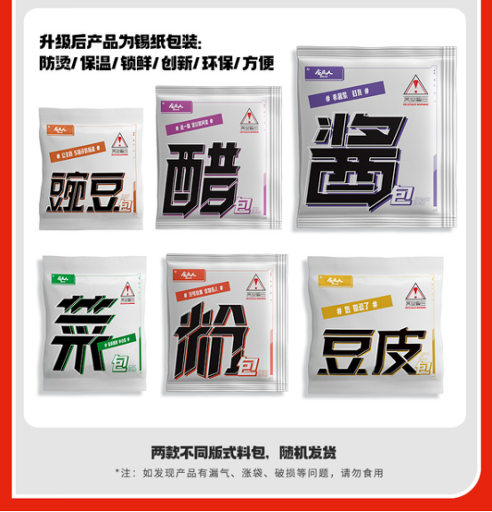 【 配料】:调料粉包,调味酱包,调味醋包,菜包,豆皮,豌豆包