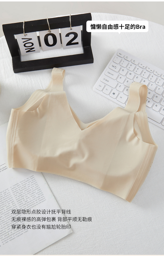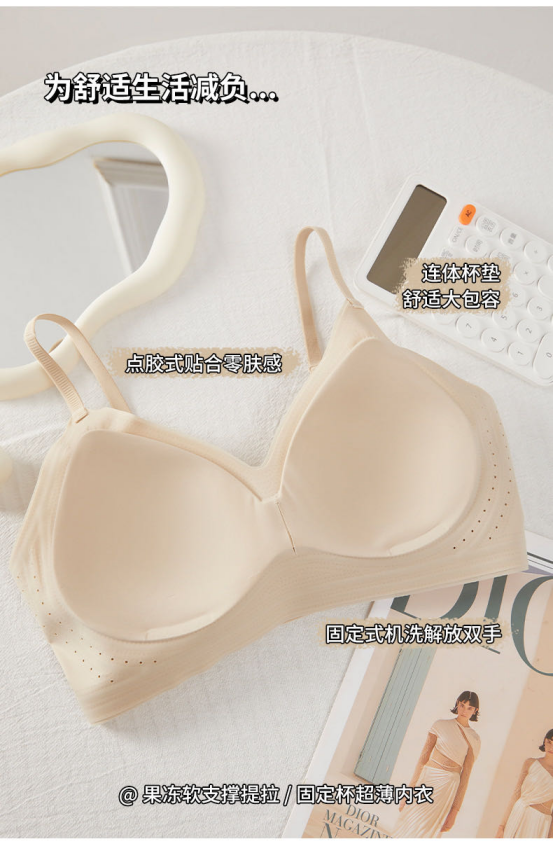 果冻胶软承托~穿上不仅舒适还上托提拉,也不用担心没有型,圆润胸型。 穿上很亲肤!还能够防止胸部下垂~ 舒适柔软 无钢圈 任意卷曲不变形拒绝钢圈压迫感 无压承托自在舒适!! 半固定杯垫 穿完可以直接扔洗衣机洗 也不会变形。 抬手也不跑杯 服帖稳定 不上滑