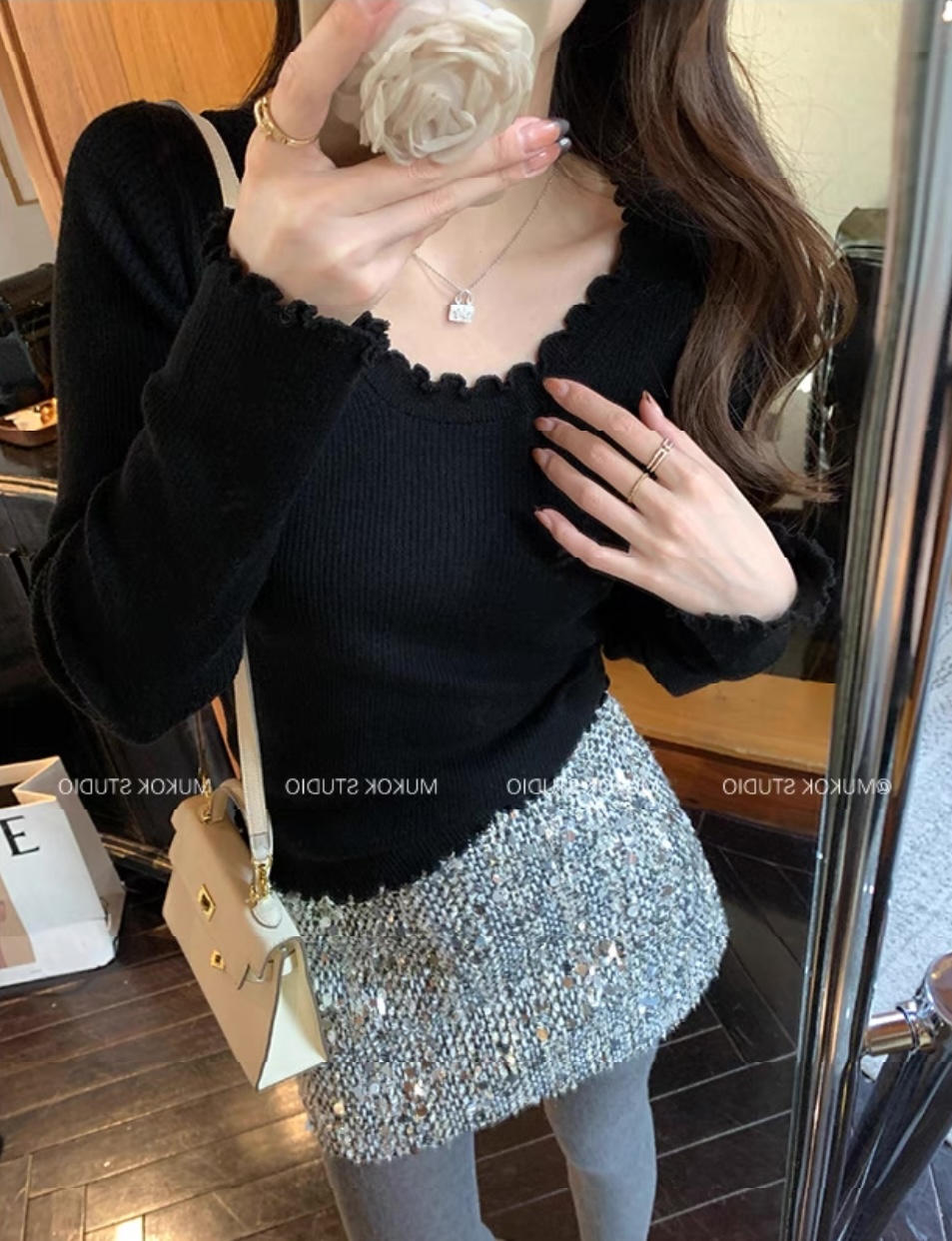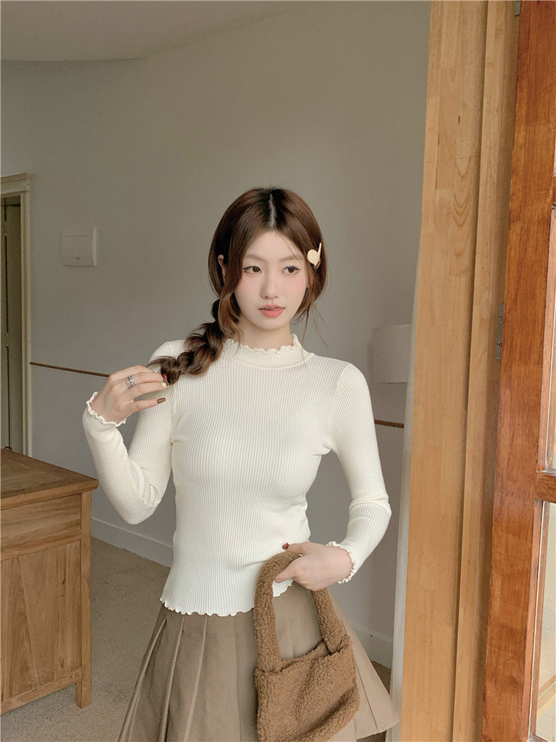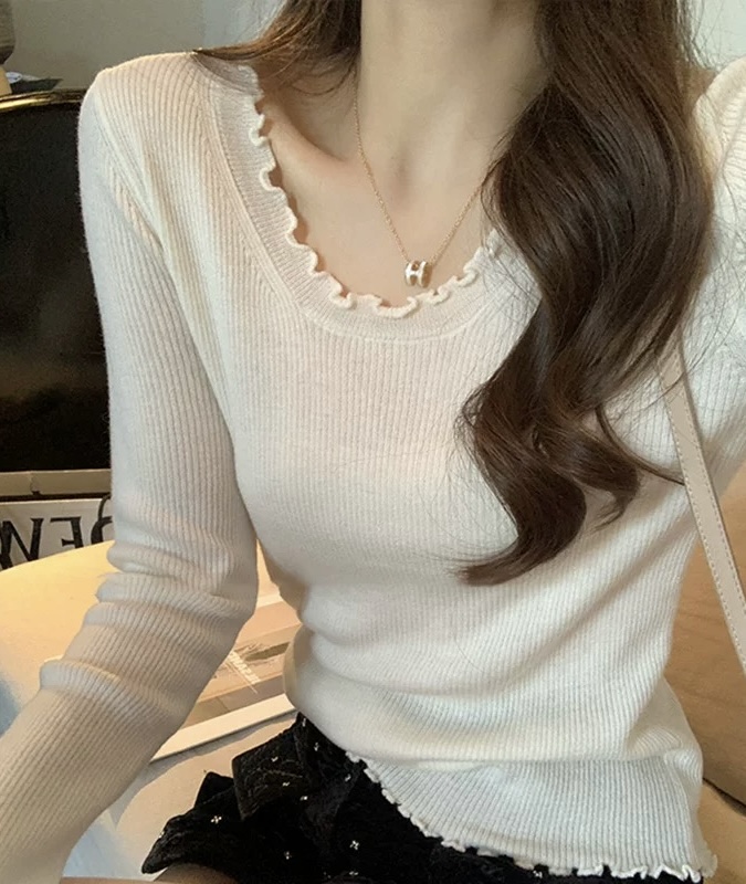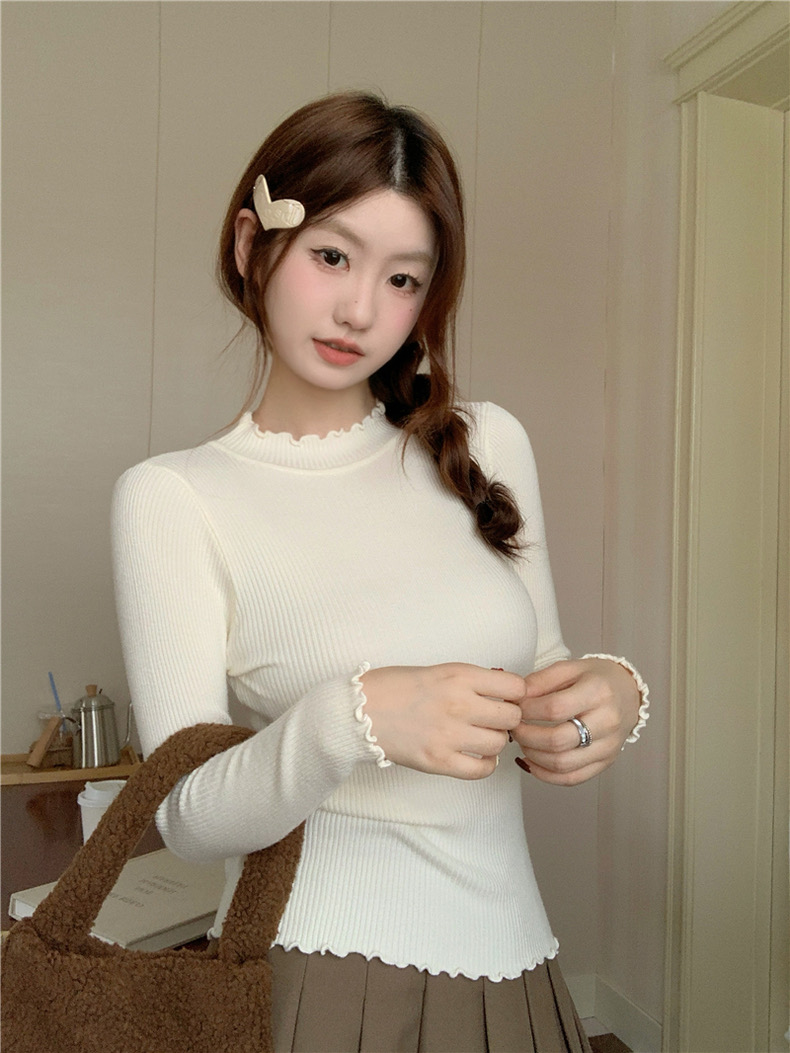 【GZ】无忧购韩版温柔百搭木耳边圆领/中领内搭修身显瘦针织小衫(截单后7天发货)25年清仓捡漏