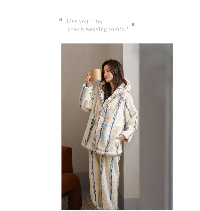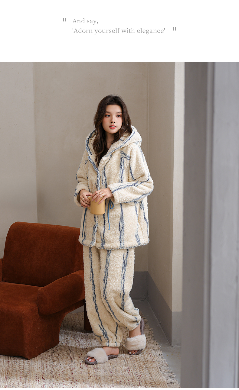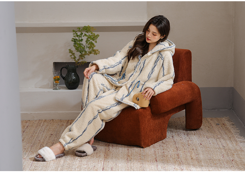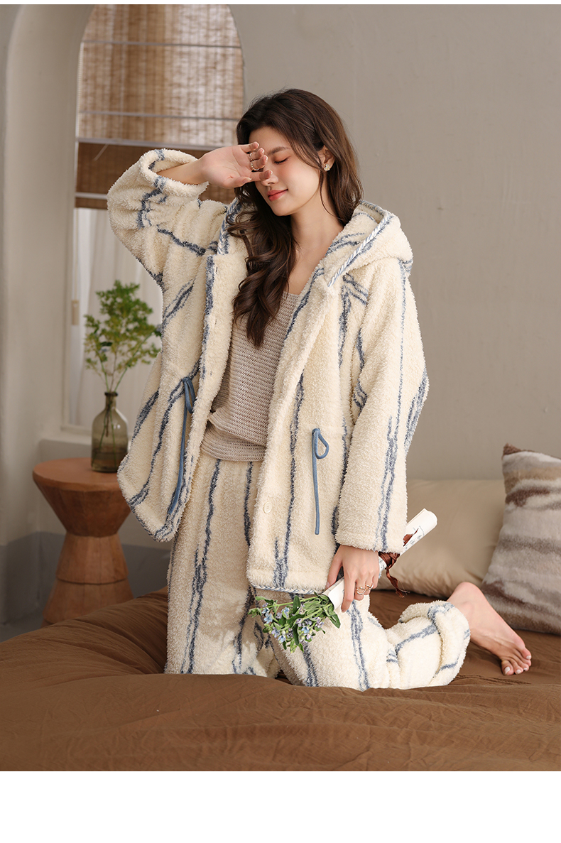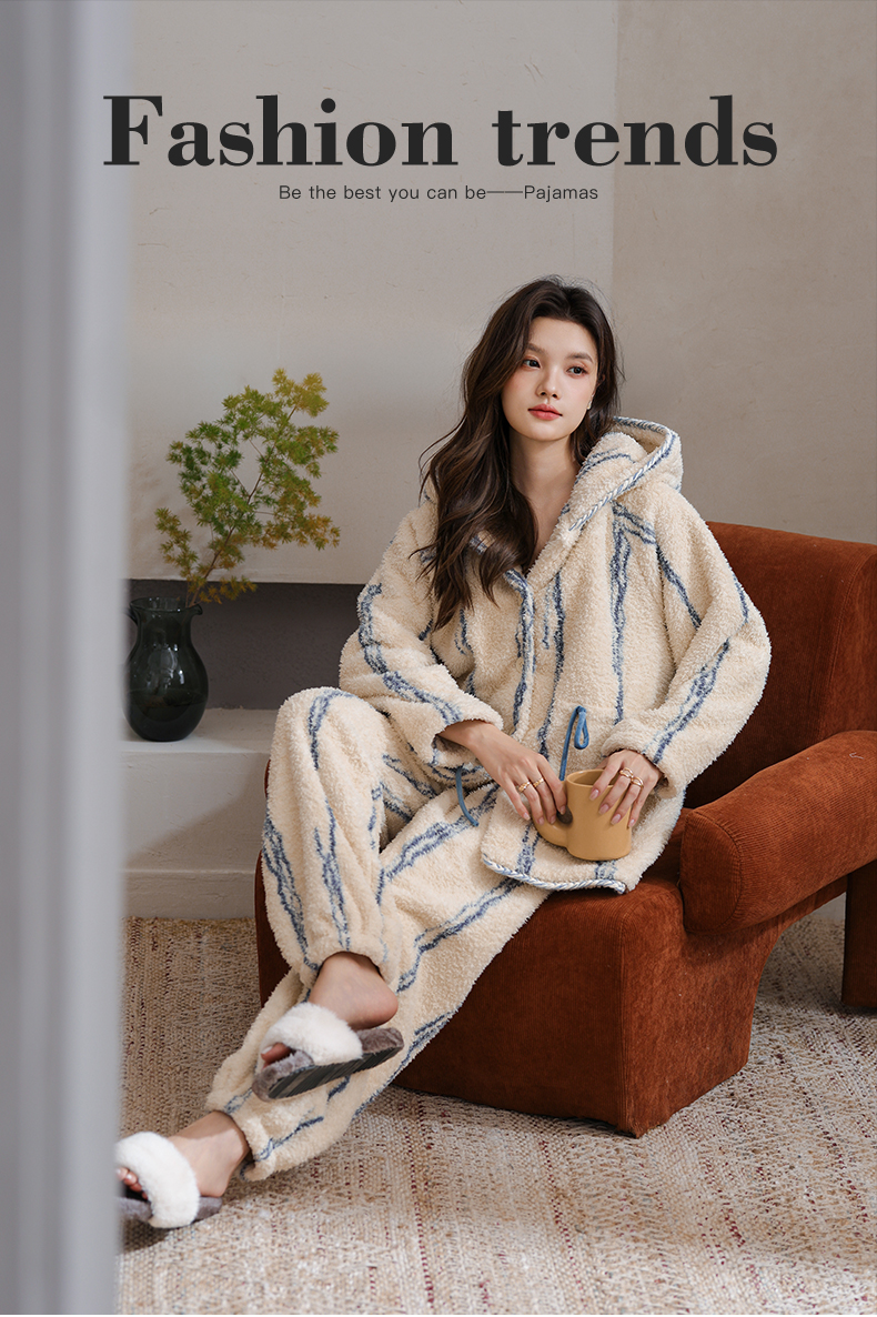 可人儿原创冬季半边绒女士连帽条纹睡衣加厚保暖可外穿绒感家居服