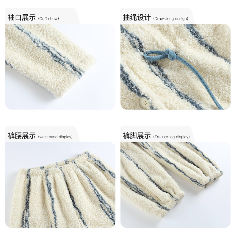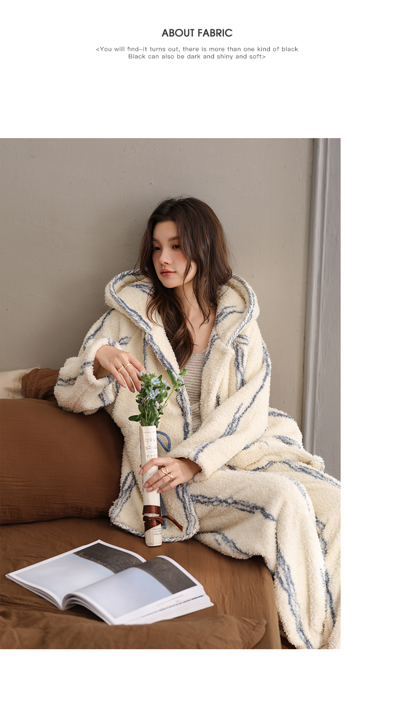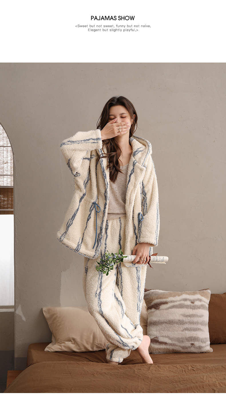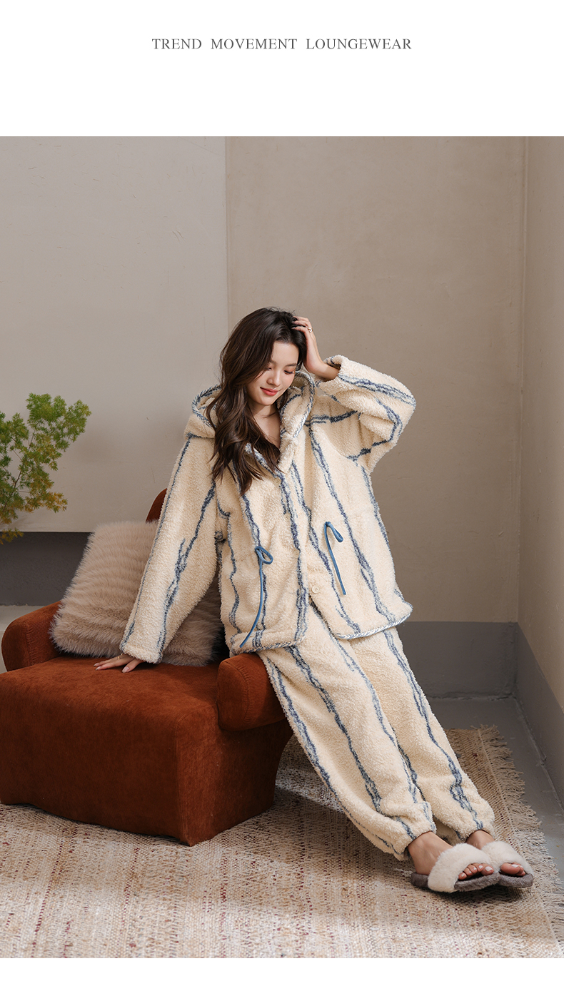 可人儿原创冬季半边绒女士连帽条纹睡衣加厚保暖可外穿绒感家居服