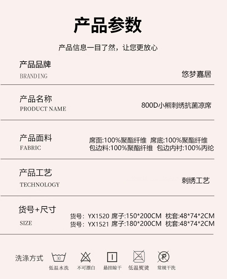 悠梦嘉居800D小熊刺绣抗菌凉席