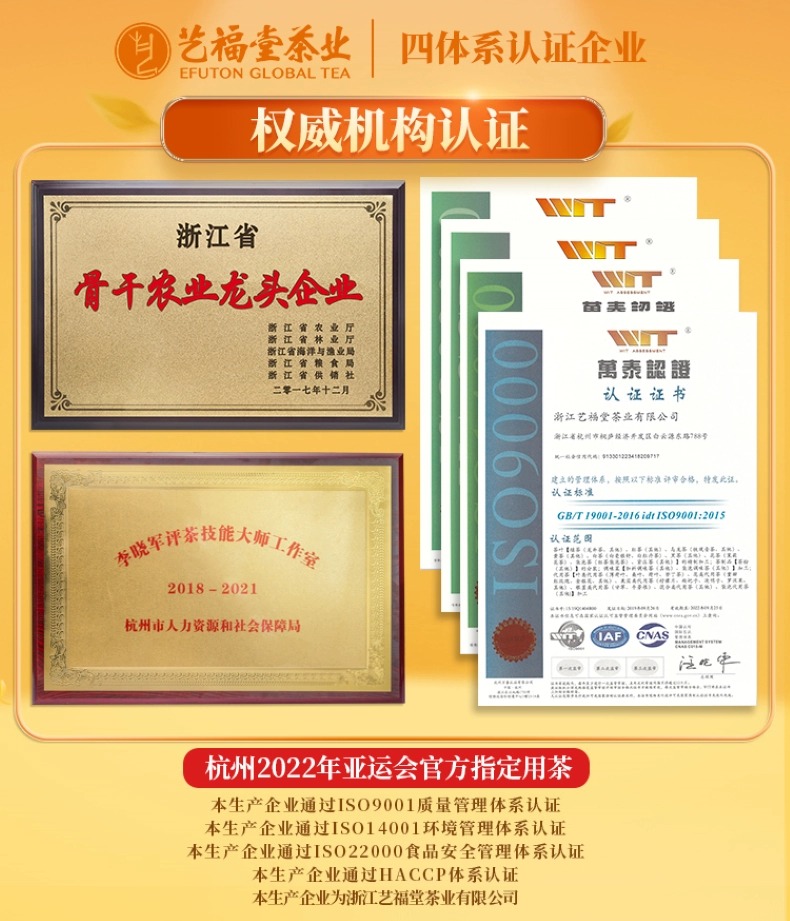 “艺福堂茶业”创立于2008年,是一家集生产、销售、科研为一体的现代茶业企业,主打西湖龙井,兼营世界各地名优茗茶及花草茶,是中国茶行业为数不多的年销售额过5亿的品牌之一,是杭州亚运会官方指定用茶!