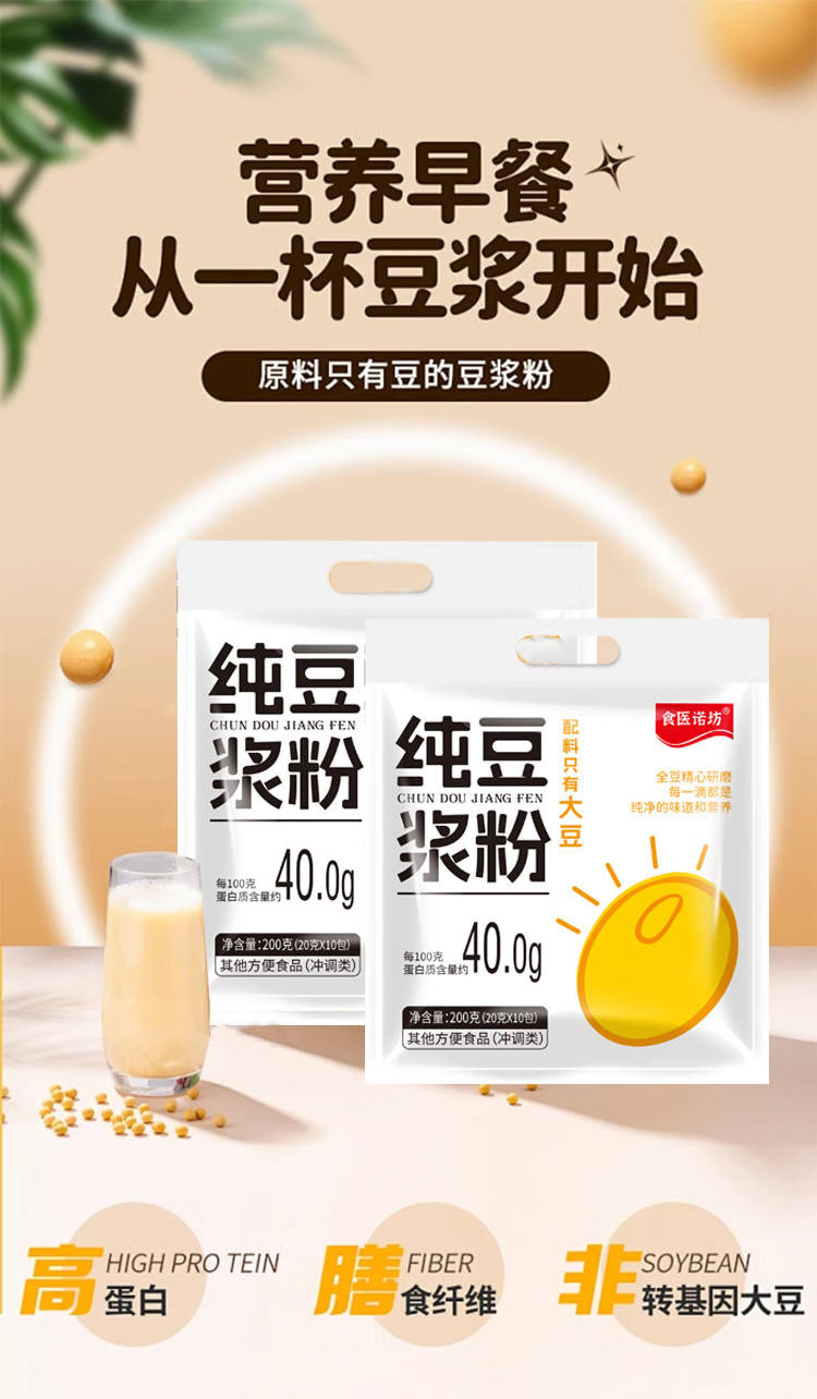 纯豆浆粉,10袋组合(100小包),配料只有大豆,纯天然,高营养,高蛋白,精选非转基因大豆,富含膳食纤维,豆香浓郁,冲泡方便D